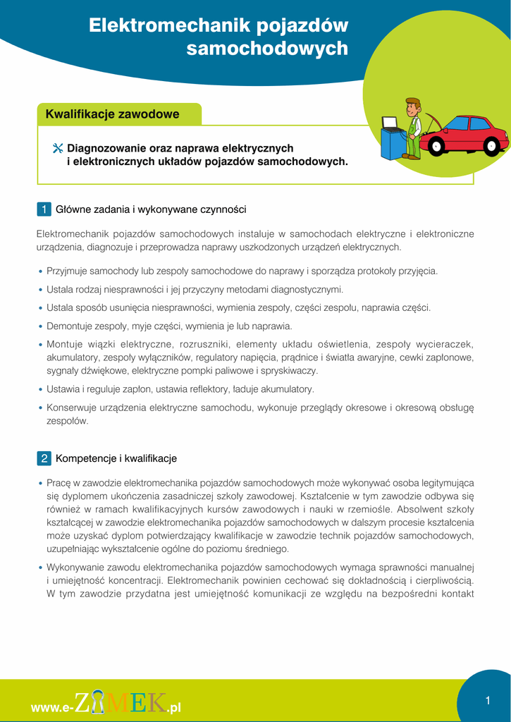 Elektromechanik pojazdów samochodowych Kwalifikacje zawodowe Diagnozowanie oraz naprawa elektrycznych i elektronicznych układów pojazdów samochodowych. 1 Główne zadania i wykonywane czynności Elektromechanik pojazdów samochodowych instaluje w samochodach elektryczne i elektroniczne urządzenia, diagnozuje i przeprowadza naprawy uszkodzonych urządzeń elektrycznych. Przyjmuje samochody lub zespoły samochodowe do naprawy i sporządza protokoły przyjęcia. Ustala rodzaj niesprawności i jej przyczyny metodami diagnostycznymi. Ustala sposób usunięcia niesprawności, wymienia zespoły, części zespołu, naprawia części. Demontuje zespoły, myje części, wymienia je lub naprawia. Montuje wiązki elektryczne, rozruszniki, elementy układu oświetlenia, zespoły wycieraczek, akumulatory, zespoły wyłączników, regulatory napięcia, prądnice i światła awaryjne, cewki zapłonowe, sygnały dźwiękowe, elektryczne pompki paliwowe i spryskiwaczy. Ustawia i reguluje zapłon, ustawia reflektory, ładuje akumulatory. Konserwuje urządzenia elektryczne samochodu, wykonuje przeglądy okresowe i okresową obsługę zespołów. 2 Kompetencje i kwalifikacje Pracę w zawodzie elektromechanika pojazdów samochodowych może wykonywać osoba legitymująca się dyplomem ukończenia zasadniczej szkoły zawodowej. Kształcenie w tym zawodzie odbywa się również w ramach kwalifikacyjnych kursów zawodowych i nauki w rzemiośle. Absolwent szkoły kształcącej w zawodzie elektromechanika pojazdów samochodowych w dalszym procesie kształcenia może uzyskać dyplom potwierdzający kwalifikacje w zawodzie technik pojazdów samochodowych, uzupełniając wykształcenie ogólne do poziomu średniego. Wykonywanie zawodu elektromechanika pojazdów samochodowych wymaga sprawności manualnej i umiejętność koncentracji. Elektromechanik powinien cechować się dokładnością i cierpliwością. W tym zawodzie przydatna jest umiejętność komunikacji ze względu na bezpośredni kontakt 1 z klientami. Elektromechanik pojazdów samochodowych powinien mieć wiedzę na temat: części maszyn i urządzeń, rodzajów połączeń, materiałów konstrukcyjnych i eksploatacyjnych, środków transportu wewnętrznego, sposobów transportu i składowania materiałów, rodzajów korozji oraz sposobów ochrony przed korozją, technik i metod wytwarzania części maszyn i urządzeń, maszyn i narzędzi do obróbki ręcznej i maszynowej, przyrządów pomiarowych stosowanych podczas obróbki ręcznej i maszynowej. Powinien także umieć wykonywać szkice części maszyn, rysunki techniczne z wykorzystaniem technik komputerowych, pomiary warsztatowe, posługiwać się dokumentacją techniczną maszyn i urządzeń, stosować programy komputerowe wspomagające wykonywanie zadań. Zawód elektromechanika pojazdów samochodowych wymaga umiejętności wykonywania czynności kontrolno-obsługowych. Elektromechanik powinien mieć prawo jazdy kategorii B. Na tym stanowisku niezbędne jest doświadczenie w ocenie stanu technicznego układów elektrycznych i elektronicznych pojazdów samochodowych, w wykonywaniu napraw układów elektrycznych i elektronicznych pojazdów samochodowych, posługiwaniu się amperomierzami, woltomierzami, urządzeniami diagnostycznymi. 3 Środowisko i charakter pracy Elektromechanik pojazdów samochodowych pracuje w warsztacie samochodowym lub zakładzie produkcyjnym najczęściej samodzielnie w systemie jednozmianowym, 8 godzin dziennie. Może mieć kontakt z klientami warsztatu. Często wykonuje zadania w wymuszonej pozycji ciała. 2