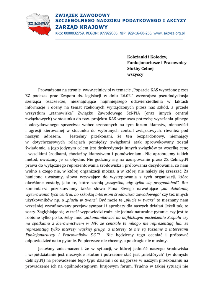 ZWIĄZEK ZAWODOWY SZCZEGÓLNEGO NADZORU PODATKOWEGO I AKCYZY ZARZĄD KRAJOWY KRS: 0000032759, REGON: 977929305, NIP: 929-16-80-256, www. akcyza.org.pl _________________________________________________________________ Koleżanki i Koledzy, Funkcjonariusze i Pracownicy Służby Celnej wszyscy Prowadzona na stronie www.celnicy.pl w temacie „Poparcie KAS wyrażone przez ZZ podczas prac Zespołu ds. legislacji w dniu 26.02.” wczorajsza pseudodyskusja szerząca oszczercze, nieznajdujące najmniejszego odzwierciedlenia w faktach informacje i oceny na temat rzekomych wyrządzonych przez nas szkód, a przede wszystkim „stanowiska” Związku Zawodowego SzNPiA (oraz innych central związkowych) w stosunku do tzw. projektu KAS wymusza potrzebę wyrażenia pilnego i zdecydowanego sprzeciwu wobec szerzonych na tym forum kłamstw, nienawiści i agresji kierowanej w stosunku do wybranych central związkowych, również pod naszym adresem. Jesteśmy przekonani, że ten bezpardonowy, niemający w dotychczasowych relacjach pomiędzy związkami atak sprowokowany został świadomie, a jego jedynym celem jest dyskredytacja innych związków za wszelką cenę i wszelkimi środkami, chociażby kłamstwem i pomówieniami. Nie aprobujemy takich metod, uważamy je za ohydne. Nie godzimy się na uzurpowanie przez ZZ Celnicy.Pl prawa do wyłącznego reprezentowania środowiska i próbowania decydowania, co nam wolno a czego nie, w której organizacji można, a w której nie należy się zrzeszać. Za haniebne uważamy, słowa wzywające do występowania z tych organizacji, które określone zostały, jako te, które zrobią „wszystko, aby tylko się przypodobać”. Bez komentarza pozostawiamy także słowa Pana Siwego nawołujące „do działania, wyzerowania tych central, bo szkodzą interesom środowiska zawodowego” czy też innych użytkowników np. o „pluciu w twarz”. Być może te „plucie w twarz” to nieznany nam wcześniej wyrafinowany przejaw sympatii i aprobaty dla naszych działań. Jeżeli tak, to sorry. Zagłębiając się w treść wypowiedzi rodzi się jednak naturalne pytanie, czy jest to robione tylko po to, żeby móc „zakomunikować na najbliższym posiedzeniu Zespołu czy na spotkaniu z kierownictwem w MF, że centrale te nikogo nie reprezentują lub, że reprezentują tylko interesy wąskiej grupy, a interesy te nie są tożsame z interesami Funkcjonariuszy i Pracowników S.C.”? Nie będziemy tego oceniać i próbować odpowiedzieć na to pytanie. Po pierwsze nie chcemy, a po drugie nie musimy. Jesteśmy zniesmaczeni, że w sytuacji, w której jedność naszego środowiska i współdziałanie jest niezwykle istotne i potrzebne stać jest „niektórych” (w domyśle Celnicy.Pl) na prowadzenie tego typu działań i co najgorsze w naszym przekonaniu na prowadzenie ich na ogólnodostępnym, krajowym forum. Trudno w takiej sytuacji nie zgodzić się ze stwierdzeniem, że zarzut o naszym działaniu na szkodę środowiska odpiera się sam. Koleżanki i Koledzy Zarząd Krajowy ZZ SzNPiA informuje, iż pomimo rozpowszechniania na swój temat na stronie www.celnicy.pl powyższych informacji nie podejmie jakiejkolwiek dyskusji i nie wpisze się w uprawianą na forum narrację kłamstwa i hejtu. Takie działanie nie przyniosłoby nikomu korzyści, a wzmogłoby tylko toczące się bezprzedmiotowe dyskusje i niepotrzebnie pogłębiłoby i tak istniejące podziały. Informujemy przy okazji, że na dzień dzisiejszy Związek Zawodowy Szczególnego Nadzoru Podatkowego i Akcyzy nie zajął jednoznacznego stanowiska w sprawie utworzenia KAS. Fałszywe jest, zatem twierdzenie, że skoro w dniu 18 lutego w Warszawie w NOT nie podpisaliśmy porozumienia oraz uczestniczymy w pracach Zespołu ds. legislacji KAS oznacza to, że jesteśmy za bezwarunkowym wprowadzeniem KAS. Od samego początku dostrzegaliśmy w przedkładanych (dostępnych) propozycjach wiele błędów i zagrożeń. Część z proponowanych rozwiązań KAS budziło i nadal budzi nasze obawy. Wypracowanie stanowiska wymaga jednak przeanalizowania wielu czynników i informacji oraz uwzględnienia stanowisk wszystkich stron i nie może być sformułowane bez przeprowadzenia szerokiej dyskusji. Zasadnicze stanowisko naszego związku w sprawie KAS zostanie wypracowane podczas najbliższego Krajowego Walnego Zebrania Delegatów w dniu 11 marca br. i bezzwłocznie przekazane do wiadomości. Oświadczamy także, że zgodnie ze statutem ZZ SzNPiA celem Związku i jego ogólnokrajowych organów jest obrona praw, godności i interesów prawnych pracowników i funkcjonariuszy celnych oraz interesów prawnych Związku a także współuczestnictwo w kształtowaniu i realizacji zadań Urzędów. Realizując ten cel mamy statutowy obowiązek „współdziałania z Ministerstwem Finansów i organami administracji publicznej, kierownictwami zakładów pracy oraz innymi związkami zawodowymi w nich działającymi”. Oznacza to, że ZZ SzNPiA nie będzie nieodpowiedzialnie blokował inicjatyw i rozwiązań, które nie godzą w godność i prawa pracownicze. Będzie natomiast podejmował zdecydowane działania w sytuacji, w której godności i prawa te mogą być zagrożone. Za Zarząd: Przewodniczący /-/ Ireneusz Grabowski Biała Podlaska, 28 lutego 2016 r.