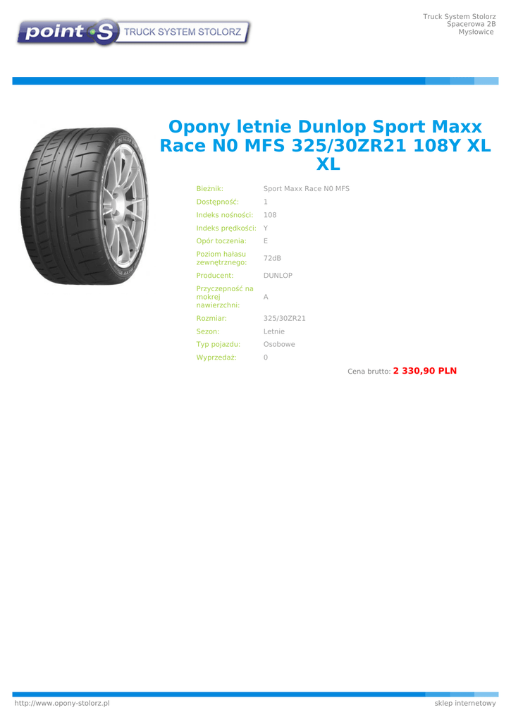 Truck System Stolorz Spacerowa 2B Mysłowice Opony letnie Dunlop Sport Maxx Race N0 MFS 325/30ZR21 108Y XL XL Bieżnik: Sport Maxx Race N0 MFS Dostępność: 1 Indeks nośności: 108 Indeks prędkości: Y Opór toczenia: E Poziom hałasu zewnętrznego: 72dB Producent: DUNLOP Przyczepność na mokrej nawierzchni: A Rozmiar: 325/30ZR21 Sezon: Letnie Typ pojazdu: Osobowe Wyprzedaż: 0 Cena brutto: http://www.opony-stolorz.pl 2 330,90 PLN sklep internetowy