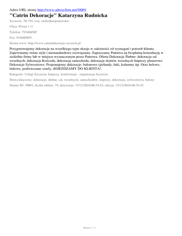 Adres URL strony http://www.adresyfirm.net/58091 "Catrin Dekoracje" Katarzyna Rudnicka Szczecin, 70-754, woj. zachodniopomorskie Ulica: Piwna 1 /1 Telefon: 793460505 Fax: 914605059 Strona www: http://www.catrindekoracje.szczecin.pl Przygotowujemy dekoracje na wszelkiego typu okazje w zależności od wymagań i potrzeb klienta. Zapewniamy różne style i niestandardowe rozwiązania. Zapraszamy Państwa na bezpłatną konsultację w siedzibie firmy lub w miejscu wyznaczonym przez Państwa. Oferta Dekoracje Ślubne: dekoracja sal weselnych, dekoracja Kościoła, dekoracja samochodu, dekoracje domów weselnych Imprezy plenerowe Dekoracje Sylwestrowe. Proponujemy dekoracje: balonowe (girlandy, łuki, kolumny itp. Oraz helowe, tiulowe, podwieszane szarfy, dOJEŻDŻAMY DO KLIENTA!. Kategorie: Usługi Szczecin, Imprezy, konferencje - organizacja Szczecin Słowa kluczowe: dekoracje, ślubne, sal, weselnych, samochodów, imprezy, dekoracja, sylwestrowa, balony Numer ID: 58091, liczba odsłon: 79, aktywacja: 15/12/2010 06:54:42, edycja: 15/12/2010 06:54:42 Strona 1 / 1