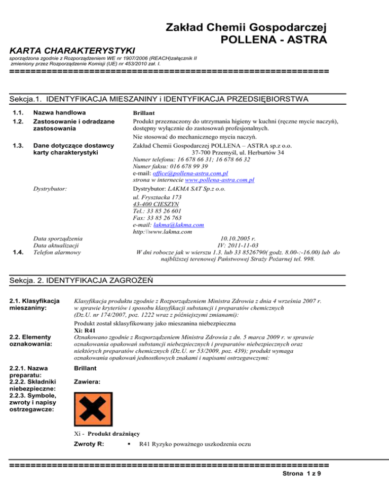 Zakład Chemii Gospodarczej POLLENA - ASTRA KARTA CHARAKTERYSTYKI sporządzona zgodnie z Rozporządzeniem WE nr 1907/2006 (REACH)załącznik II zmieniony przez Rozporządzenie Komisji (UE) nr 453/2010 zał. I. ============================================================ Sekcja.1. IDENTYFIKACJA MIESZANINY i IDENTYFIKACJA PRZEDSIĘBIORSTWA 1.1. 1.2. Nazwa handlowa Zastosowanie i odradzane zastosowania 1.3. Dane dotyczące dostawcy karty charakterystyki Dystrybutor: 1.4. Data sporządzenia Data aktualizacji Telefon alarmowy Brillant Produkt przeznaczony do utrzymania higieny w kuchni (ręczne mycie naczyń), dostępny wyłącznie do zastosowań profesjonalnych. Nie stosować do mechanicznego mycia naczyń. Zakład Chemii Gospodarczej POLLENA – ASTRA sp.z o.o. 37-700 Przemyśl, ul. Herburtów 34 Numer telefonu: 16 678 66 31; 16 678 66 32 Numer faksu: 016 678 99 39 e-mail: [email protected] strona w internecie www.pollena-astra.com.pl Dystrybutor: LAKMA SAT Sp.z o.o. ul. Frysztacka 173 43-400 CIESZYN Tel.: 33 85 26 601 Fax: 33 85 26 763 e-mail: [email protected] http:\\www.lakma.com 10.10.2005 r. IV: 2011-11-03 W dni robocze jak w wierszu 1.3. lub 33 8526790( godz. 8.00-:-16.00) lub do najbliższej terenowej Państwowej Straży Pożarnej tel. 998. Sekcja. 2. IDENTYFIKACJA ZAGROŻEŃ 2.1. Klasyfikacja mieszaniny: 2.2. Elementy oznakowania: 2.2.1. Nazwa preparatu: 2.2.2. Składniki niebezpieczne: 2.2.3. Symbole, zwroty i napisy ostrzegawcze: Klasyfikacja produktu zgodnie z Rozporządzeniem Ministra Zdrowia z dnia 4 września 2007 r. w sprawie kryteriów i sposobu klasyfikacji substancji i preparatów chemicznych (Dz.U. nr 174/2007, poz. 1222 wraz z późniejszymi zmianami): Produkt został sklasyfikowany jako mieszanina niebezpieczna Xi: R41 Oznakowano zgodnie z Rozporządzeniem Ministra Zdrowia z dn. 5 marca 2009 r. w sprawie oznakowania opakowań substancji niebezpiecznych i preparatów niebezpiecznych oraz niektórych preparatów chemicznych (Dz.U. nr 53/2009, poz. 439); produkt wymaga oznakowania opakowań jednostkowych znakami i napisami ostrzegawczymi: Brillant Zawiera: Xi - Produkt drażniący Zwroty R: R41 Ryzyko poważnego uszkodzenia oczu ============================================================ Strona 1 z 9 Zakład Chemii Gospodarczej POLLENA - ASTRA KARTA CHARAKTERYSTYKI sporządzona zgodnie z Rozporządzeniem WE nr 1907/2006 (REACH)załącznik II zmieniony przez Rozporządzenie Komisji (UE) nr 453/2010 zał. I. ============================================================ Zwroty S: • • • • 2.3. Inne zagrożenia: S2 Chronić przed dziećmi S26 Zanieczyszczone oczy przemyć natychmiast dużą ilością wody i zasięgnąć porady lekarza S39 Nosić okulary lub ochronę twarzy S46 W razie połknięcia niezwłocznie zasięgnij porady lekarza-pokaż opakowania lub etykietę Napisy • dodatkowe Nieznane Sekcja. 3. SKŁAD/INFORMACJA O SKŁADNIKACH Składniki niebezpieczne zawarte w produkcie: nr WE nr CAS Numer rejestrowy % wagowy Klasyfikacja, dyrektywa 1999/45/WE Klasyfikacja, rozporządzenie (WE) 1276/2008 Sól sodowa kwasu ABS INCI name; Sodium Dodecylobenzenesulfonate 270-115-0 68411-30-3 012119489428 -22-XXXX 10,0-:12,0 Xn: R22 Xi: R38-41 3.1-Acute Tox. 4; H302 3.2-Skin Irrit 2; H315 3.3-Eye Damage 1; H318 Sól sodowa oksyetylowanego(2) i siarczanowanego alkoholu C12-C14 INCI name; Sodium Laureth2 Sulfate Dietanoloamid kwasów z oleju kokosowego INCI name; Cocamide DEA 500-234-8 68891-38-3 012117488639 -16-XXXX 3,0-:-5,0 Xi: R38-41 3.2-Skin Irrit 2; H315 3.3-Eye Damage 1; H318 012119490100 -53-XXXX 1,0-:-2,0 Xi:R38-41 3.2-Skin irritation, 2; H315 3.3-Eye Damage, 1; H318 Nazwa substancji/INCI name nr indeksowy 931-329-6 Sekcja. 4. ŚRODKI PIERWSZEJ POMOCY 4.1. Opis środków pierwszej pomocy Uwagi ogólne : Natychmiast wyprowadzić poszkodowanego na świeże powietrze. W przypadku wystąpienia jakichkolwiek niepokojących objawów wezwać natychmiast lekarza lub odwieźć poszkodowanego do szpitala, pokazać opakowanie preparatu lub etykietę. Wdychanie: W przypadku zatrzymania oddechu zastosować sztuczne oddychanie. Zapewnić poszkodowanemu ciepło i warunki do odpoczynku. Wezwać natychmiast pomoc medyczną. Skóra: Zdjąć skażoną odzież. Natychmiast umyć skórę dużą ilością letniej wody, najlepiej bieżącej. W przypadku podrażnienia skóry (zaczerwienienie) skonsultować się natychmiast z lekarzem. Oczy: Zdjąć szkła kontaktowe. Natychmiast przemywać oczy dużą ilością letniej wody co najmniej 15 min. (przy odwiniętych powiekach), unikać silnego strumienia wody ze względu na ryzyko uszkodzenia rogówki, w przypadku zanieczyszczenia jednego oka, chronić w trakcie przemywania drugie oko przed zanieczyszczeniem. Skonsultować się natychmiast z lekarzem okulistą!. Uwaga: osoby narażone na skażenie oczu powinny być pouczone o konieczności i sposobie ich natychmiastowego płukania. Połknięcie : Wypłukać usta wodą. Nie powodować wymiotów. Podać do wypicia białka jaj kurzych, mleko lub wodę. Wezwać natychmiast pomoc medyczną. UWAGA! Pacjenta nieprzytomnego ułożyć w pozycji bocznej ustalonej, zapewnić zatrutemu spokój, chronić przed utratą ciepła, kontrolować oddech i puls. Nigdy nie wywoływać wymiotów ani nie podawać niczego doustnie osobie nieprzytomnej lub zamroczonej. ============================================================ Strona 2 z 9 Zakład Chemii Gospodarczej POLLENA - ASTRA KARTA CHARAKTERYSTYKI sporządzona zgodnie z Rozporządzeniem WE nr 1907/2006 (REACH)załącznik II zmieniony przez Rozporządzenie Komisji (UE) nr 453/2010 zał. I. ============================================================ Sekcja. 4. ŚRODKI PIERWSZEJ POMOCY 4.2. Najważniejsze ostre i opóźnione objawy oraz skutki narażenia Patrz sekcja 11 4.3. Wskazania dotyczące wszelkiej natychmiastowej pomocy lekarskiej i szczególnego postępowania z poszkodowanym Brak szczególnych wskazań Sekcja. 5. POSTĘPOWANIE W PRZYPADKU POŻARU 5.2. Zal