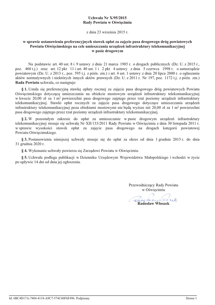 Uchwała Nr X/95/2015 Rady Powiatu w Oświęcimiu z dnia 23 września 2015 r. w sprawie ustanowienia preferencyjnych stawek opłat za zajęcie pasa drogowego dróg powiatowych Powiatu Oświęcimskiego na cele umieszczania urządzeń infrastruktury telekomunikacyjnej w pasie drogowym Na podstawie art. 40 ust. 8 i 9 ustawy z dnia 21 marca 1985 r. o drogach publicznych (Dz. U. z 2015 r., poz. 460 t.j.) oraz art. 12 pkt 11 i art. 40 ust. 1 i 2 pkt 4 ustawy z dnia 5 czerwca 1998 r. o samorządzie powiatowym (Dz. U. z 2013 r., poz. 595 t.j. z późn. zm.) i art. 4 ust. 1 ustawy z dnia 20 lipca 2000 r. o ogłaszaniu aktów normatywnych i niektórych innych aktów prawnych (Dz. U. z 2011 r. Nr 197, poz. 1172 t.j. z późn. zm.) Rada Powiatu uchwala, co następuje: § 1. Ustala się preferencyjną stawkę opłaty rocznej za zajęcie pasa drogowego dróg powiatowych Powiatu Oświęcimskiego dotyczącą umieszczania na obiekcie mostowym urządzeń infrastruktury telekomunikacyjnej w kwocie 20,00 zł za 1 m2 powierzchni pasa drogowego zajętego przez rzut poziomy urządzeń infrastruktury telekomunikacyjnej. Stawki opłat rocznych za zajęcie pasa drogowego dotyczące umieszczania urządzeń infrastruktury telekomunikacyjnej poza obiektami mostowymi nie będą wyższe niż 20,00 zł za 1 m2 powierzchni pasa drogowego zajętego przez rzut poziomy urządzeń infrastruktury telekomunikacyjnej. § 2. W pozostałym zakresie do opłat za umieszczanie w pasie drogowym urządzeń infrastruktury telekomunikacyjnej stosuje się uchwałę Nr XII/133/2011 Rady Powiatu w Oświęcimiu z dnia 30 listopada 2011 r. w sprawie wysokości stawek opłat za zajęcie pasa drogowego na drogach kategorii powiatowej Powiatu Oświęcimskiego. § 3. Postanowienia niniejszej uchwały stosuje się do opłat za okres od dnia 1 grudnia 2015 r. do dnia 31 grudnia 2020 r. § 4. Wykonanie uchwały powierza się Zarządowi Powiatu w Oświęcimiu. § 5. Uchwała podlega publikacji w Dzienniku Urzędowym Województwa Małopolskiego i wchodzi w życie po upływie 14 dni od dnia jej ogłoszenia. Przewodniczący Rady Powiatu w Oświęcimiu Radosław Włoszek Id: 6BC4D17A-7404-4118-A9C7-574C60F6F496. Podpisany Strona 1 Uzasadnienie I. Potrzeba podjĊcia uchwały W związku pismem Ministra Administracji i Cyfryzacji Andrzeja Halickiego z dnia 26.08.2015 r. w sprawie realizowanego konkursu w ramach I osi priorytetowej Powszechny dostĊp do szybkiego Internetu – Programu Operacyjnego Polska Cyfrowa (POPC), Ministerstwo proponuje ustanowienie opłaty za zajĊcie pasa drogowego dla infrastruktury telekomunikacyjnej na poziomie 20 zł/1 m2/rok i podpisanie deklaracji z mocą obowiązującą co najmniej do dnia 31.12.2020 r. Rada Powiatu w OĞwiĊcimiu uchwałą Nr XII/133/2011 z dnia 30 listopada 2011 r. okreĞliła wysokoĞü stawek opłat za zajĊcie pasa drogowego na drogach kategorii powiatowej Powiatu OĞwiĊcimskiego. Zgodnie z § 3 ust. 1 tejĪe uchwały stawki opłat rocznych za 1 m2 powierzchni pasa drogowego zajĊtego przez rzut poziomy urządzeĔ infrastruktury technicznej niezwiązanych z potrzebami zarządzania drogami lub potrzebami ruchu drogowego poza obszarem zabudowanym wynoszą – 10 zł, na obszarze zabudowanym – 20,00 zł, na obiekcie mostowym – 170,00 zł. Stawki proponowane przez Ministerstwo są wiĊc na poziomie stawek które aktualnie obowiązują w powiecie, za wyjątkiem umieszczania urządzeĔ infrastruktury telekomunikacyjnej na obiekcie mostowym. Podpisanie deklaracji o ustanowieniu preferencyjnych stawek za zajĊcie pasa drogowego spowoduje, Īe stawki te nie bĊdą mogły wzrosnąü co najmniej do dnia 31.12.2020 r. II. Oczekiwane skutki społeczne PodjĊcie przedmiotowej uchwały powinno przyczyniü siĊ do rozwoju infrastruktury telekomunikacyjnej zapewniającej dostĊp do Internetu dla wszystkich mieszkaĔców, a takĪe poprawy jego jakoĞci.