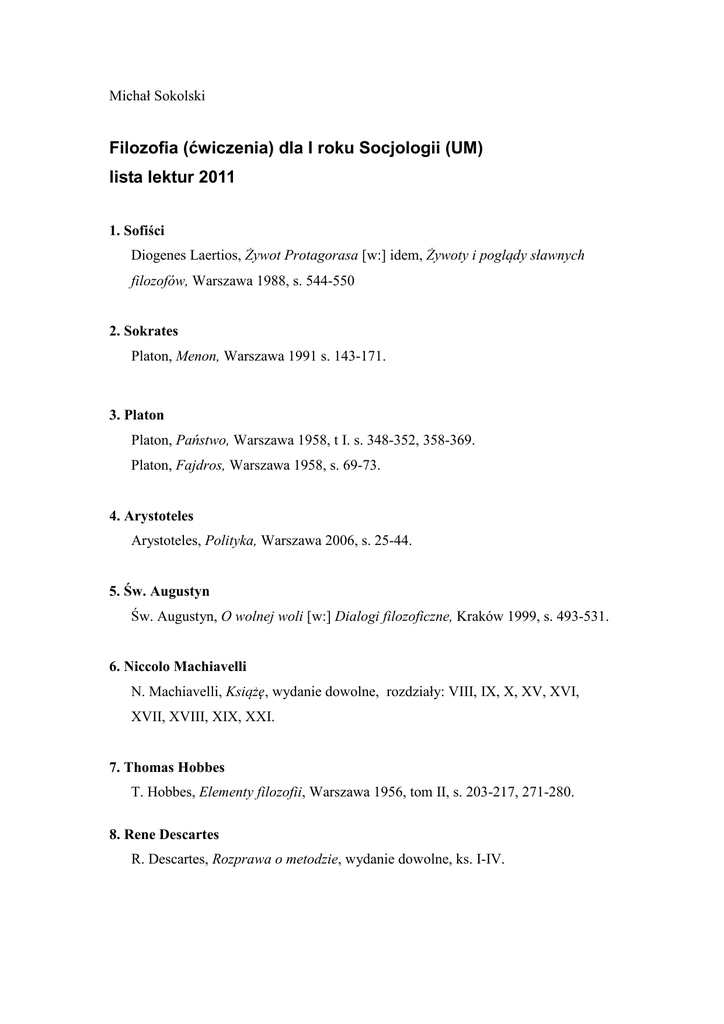 Michał Sokolski Filozofia (ćwiczenia) dla I roku Socjologii (UM) lista lektur 2011 1. Sofiści Diogenes Laertios, Żywot Protagorasa [w:] idem, Żywoty i poglądy sławnych filozofów, Warszawa 1988, s. 544-550 2. Sokrates Platon, Menon, Warszawa 1991 s. 143-171. 3. Platon Platon, Państwo, Warszawa 1958, t I. s. 348-352, 358-369. Platon, Fajdros, Warszawa 1958, s. 69-73. 4. Arystoteles Arystoteles, Polityka, Warszawa 2006, s. 25-44. 5. Św. Augustyn Św. Augustyn, O wolnej woli [w:] Dialogi filozoficzne, Kraków 1999, s. 493-531. 6. Niccolo Machiavelli N. Machiavelli, Książę, wydanie dowolne, rozdziały: VIII, IX, X, XV, XVI, XVII, XVIII, XIX, XXI. 7. Thomas Hobbes T. Hobbes, Elementy filozofii, Warszawa 1956, tom II, s. 203-217, 271-280. 8. Rene Descartes R. Descartes, Rozprawa o metodzie, wydanie dowolne, ks. I-IV. 9. David Hume D. Hume, Badania dotyczące rozumu ludzkiego, wydanie dowolne, r. II, III i VII. 10. Jean Jacques Rousseau J.J. Rousseau, Umowa społeczna, wydanie dowolne, księga I. 11. Immanuel Kant I. Kant, Krytyka czystego rozumu, Kęty 2001, s. 53-70. 12. Georg Wilhelm Friedrich Hegel H. Schnadelbach , "Hegel. Wprowadzenie", Warszawa 2006, s.11-14; G.W.F. Hegel, "Kto myśli abstrakcyjnie?" [w:] Z. Kuderowicz, „Hegel i jego uczniowie”, Warszawa 1984, s. 270-276; 13. Karol Marks K. Marks, Rękopisy ekonomiczno-filozoficzne 14. Jean Paul Sarte J.-P. Sartre, Egzystencjalizm jest humanizmem, Warszawa 1998.
