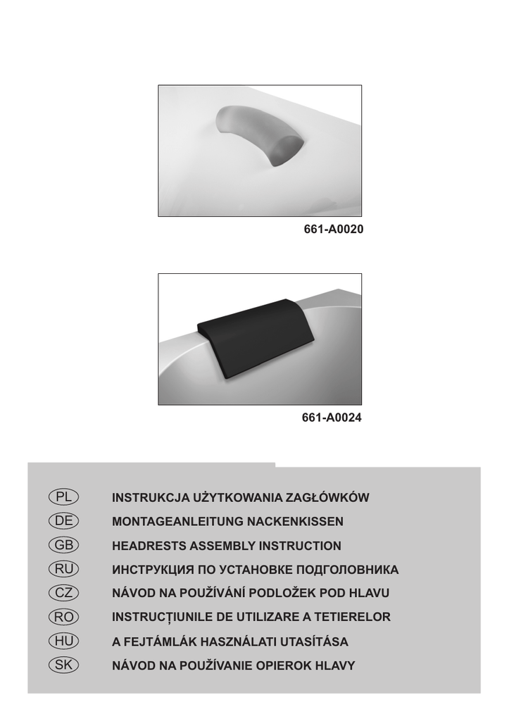 661-A0020 661-A0024 PL INSTRUKCJA U¯YTKOWANIA ZAG£ÓWKÓW DE MONTAGEANLEITUNG NACKENKISSEN GB HEADRESTS ASSEMBLY INSTRUCTION RU ÈÍÑÒÐÓÊÖÈß ÏÎ ÓÑÒÀÍÎÂÊÅ ÏÎÄÃÎËÎÂÍÈÊÀ CZ NÁVOD NA POUÍVÁNÍ PODLOEK POD HLAVU RO INSTRUCÞIUNILE DE UTILIZARE A TETIERELOR HU A FEJTÁMLÁK HASZNÁLATI UTASÍTÁSA SK NÁVOD NA POUÍVANIE OPIEROK HLAVY 661-A0020, 661-A0024 1 2 PL Wskazówki: • do czyszczenia zag³ówka u¿ywaæ wy³¹cznie wody z myd³em, • ¿r¹ce i agresywne œrodki czyszcz¹ce mog¹ uszkodziæ zag³ówek, • nie nale¿y pozostawiaæ zag³ówka pod d³ugotrwa³ym wp³ywem promieni UV (nie nadaje siê do u¿ytku zewnêtrznego), • produkt przeznaczony wy³¹cznie do u¿ytku w k¹pieli, • dla uzyskania odpowiedniej przyczepnoœci do powierzchni akrylu prosimy, zainstalowaæ zag³ówek przed nape³nieniem wanny. Uwaga: Producent zastrzega sobie prawo do wprowadzania zmian w zakresie charakterystyki technicznej oraz kolorystyki opisywanych elementów. DE Pflegehinweise: • zur Reinigung empfehlen wir ausschließlich Wasser mit Seife zu verwenden, • ätzende Reinigungsmittel können das Nackenkissen beschädigen, • das Nackenkissen sollte nicht lange der UV-Strahlenwirkung ausgesetzt werden (es kann nicht draußen eingesetzt werden), • das Nackenkissen sollte ausschließlich im Badbereich verwendet werden, • um eine gute Klebefestigkeit an die Acryloberfläche zu gewährleisten, empfehlen wir das Nackenkissen vor der Wannenfüllung zu montieren. Achtung: Der Hersteller behält sich das Recht vor, technische Änderungen und Farbenänderungen in den Produkten einzuführen. GB Warning: • only water and soap use for the headrest cleaning, • corrosive and agressive products may damage the headrest, • do not leave the headrest in long contact to uva rays (non suitable outdoor), • bath use only suitable, • for a successful adherence to the acrylic surface install it in the bath before filling up. Notice: The producer reserves the right to introduce changes of technical parameters and colours of described elements. RU Óêàçàíèÿ: • äëÿ î÷èñòêè ïîäãîëîâíèêà ïðèìåíÿòü èñêëþ÷èòåëüíî âîäó ñ ìûëîì, • åäêèå àáðàçèâíûå ÷èñòÿùèå ñðåäñòâà ìîãóò ïîâðåäèòü ïîäãîëîâíèê, • íåëüçÿ îñòàâëÿòü ïîäãîëîâíèê ïîä äëèòåëüíûì âëèÿíèåì ëó÷åé UV, • èçäåëèå ïðåäíàçíà÷åíî èñêëþ÷èòåëüíî äëÿ âàííîé êîìíàòû, • äëÿ ñîîòâåòñòâóþùåé ïðèëèï÷èâîñòè ê àêðèëîâîé ïîâåðõíîñòè ïðîñèì óñòàíîâèòü ïîäãîëîâíèê ïåðåä íàïîëíåíèåì âàííû. Âíèìàíèå: Ïðîèçâîäèòåëü îñòàâëÿåò çà ñîáîé ïðàâî èçìåíÿòü òåõíè÷åñêèå õàðàêòåðèñòèêè è öâåòîâóþ ãàììó óêàçàííûõ ýëåìåíòîâ. 2 CZ Pokyny: • k èištìní podlo ky pou ívejte výhradnì vodu s mýdlem, • íraviny a agresivní èistící prostøedky mohou podlo ku poškodit, • nevystavujte podlo ku dlouhodobì pùsobení UV záøení (nehodí se k venkovnímu pou ívání) • výrobek je urèený výhradnì k pou ívání pøi koupání, • pro získání vhodné pøilnavosti k akrylové ploše je tøeba umístit podlo ku pøed naplnìním vany, Pozor: Výrobce si vyhrazuje právo zavádìt zmìny v rozsahu technické charakteristiky a barev uvedených souèástí. RO Indicaþii: • pentru curãþarea tetierei folosiþi exclusiv apã ºi sãpun, • preparatele de curãþare acide ºi agresive pot sã distrugã suprafaþa tetierei, • tetiera nu trebuie supusã o perioadã îndelungatã de vreme la acþiune razelor UV (nu poate sã fie utilizatã în exterior), • produsul este destinat exclusiv pentru a fi utilizat la îmbãiere, • pentru obþinerea aderenþei necesare la suprafaþa acrilicã vã indicãm sã instalaþi tetiera înainte de umplerea cãzii de baie. Atenþie: Producãtorul îºi rezervã dreptul de a introduce schimbãri în domeniul caracteristicilor tehnice ºi a coloristicii elementelor descrise. HU Tanácsok: • a fejtámla tisztításához kizárólag szappanos vizet használjon, • maró és agresszív tisztítószerek károsíthatják a fejtámlát, • nem szabad a fejtámlát hosszú ideig kitenni UV sugárzás hatásának (nem való kültéri használatra), • a terméket kizárólag fürdéshez lehet használni, • az akril felülethez való megfelelõ tapadáshoz a fejtámlát a kád vízzel való feltöltése elõtt kell behelyezni, Figyelem: A gyártó fenntartja magának a jogot a bemutatott elemek mûszaki jellemzõinek és színválasztékának módosításához. SK Pokyny: • na èistenie opierky hlavy pou ívajte výhradne vodu s mydlom; • ieraviny a agresívne èistiace prostriedky mô u opierku poškodi ; • opierku nevystavujte dlhodobému pôsobeniu UV iarenia (nehodí sa na vonkajšie pou ívanie); • výrobok je urèený výhradne na pou ívanie pri kúpaní; • za úèelom dosiahnutia vhodnej pri¾navosti k akrylovej ploche opierku namontujte pred naplnením vane. Pozor: Výrobca si vyhradzuje právo na vykonávanie zmien v rozsahu technickej charakteristiky a farebného prevedenia popísaných dielov. „Sanplast” Spó³ka Akcyjna, Wymys³owice 1, 88-320 Strzelno; tel. +48 52 31 88 500, fax +48 52 31 88 501 infolinia: +48 52 31 88 600; [email protected], www.sanplast.pl 175-0286A-ML-661, Druk 11/2010 1