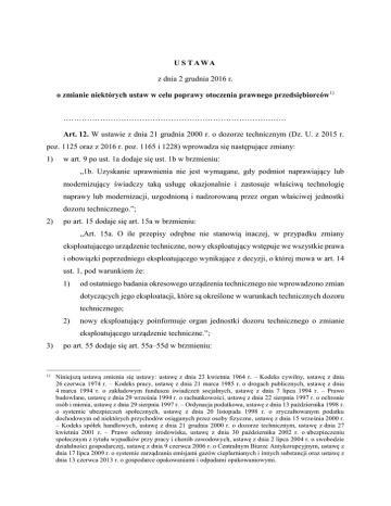 U S T AWA z dnia 2 grudnia 2016 r. o zmianie niektórych ustaw w celu poprawy otoczenia prawnego przedsiębiorców 1) …………………………………………………………………………. Art. 12. W ustawie z dnia 21 grudnia 2000 r. o dozorze technicznym (Dz. U. z 2015 r. poz. 1125 oraz z 2016 r. poz. 1165 i 1228) wprowadza się następujące zmiany: 1) w art. 9 po ust. 1a dodaje się ust. 1b w brzmieniu: „1b. Uzyskanie uprawnienia nie jest wymagane, gdy podmiot naprawiający lub modernizujący świadczy taką usługę okazjonalnie i zastosuje właściwą technologię naprawy lub modernizacji, uzgodnioną i nadzorowaną przez organ właściwej jednostki dozoru technicznego.”; 2) po art. 15 dodaje się art. 15a w brzmieniu: „Art. 15a. O ile przepisy odrębne nie stanowią inaczej, w przypadku zmiany eksploatującego urządzenie techniczne, nowy eksploatujący wstępuje we wszystkie prawa i obowiązki poprzedniego eksploatującego wynikające z decyzji, o której mowa w art. 14 ust. 1, pod warunkiem że: 1) od ostatniego badania okresowego urządzenia technicznego nie wprowadzono zmian dotyczących jego eksploatacji, które są określone w warunkach technicznych dozoru technicznego; 2) nowy eksploatujący poinformuje organ jednostki dozoru technicznego o zmianie eksploatującego urządzenie techniczne.”; 3) 1) po art. 55 dodaje się art. 55a–55d w brzmieniu: Niniejszą ustawą zmienia się ustawy: ustawę z dnia 23 kwietnia 1964 r. – Kodeks cywilny, ustawę z dnia 26 czerwca 1974 r. – Kodeks pracy, ustawę z dnia 21 marca 1985 r. o drogach publicznych, ustawę z dnia 4 marca 1994 r. o zakładowym funduszu świadczeń socjalnych, ustawę z dnia 7 lipca 1994 r. – Prawo budowlane, ustawę z dnia 29 września 1994 r. o rachunkowości, ustawę z dnia 22 sierpnia 1997 r. o ochronie osób i mienia, ustawę z dnia 29 sierpnia 1997 r. – Ordynacja podatkowa, ustawę z dnia 13 października 1998 r. o systemie ubezpieczeń społecznych, ustawę z dnia 20 listopada 1998 r. o zryczałtowanym podatku dochodowym od niektórych przychodów osiąganych przez osoby fizyczne, ustawę z dnia 15 września 2000 r. – Kodeks spółek handlowych, ustawę z dnia 21 grudnia 2000 r. o dozorze technicznym, ustawę z dnia 27 kwietnia 2001 r. – Prawo ochrony środowiska, ustawę z dnia 30 października 2002 r. o ubezpieczeniu społecznym z tytułu wypadków przy pracy i chorób zawodowych, ustawę z dnia 2 lipca 2004 r. o swobodzie działalności gospodarczej, ustawę z dnia 9 czerwca 2006 r. o Centralnym Biurze Antykorupcyjnym, ustawę z dnia 17 lipca 2009 r. o systemie zarządzania emisjami gazów cieplarnianych i innych substancji oraz ustawę z dnia 13 czerwca 2013 r. o gospodarce opakowaniami i odpadami opakowaniowymi. „Art. 55a. 1. Prezes UDT może umorzyć w całości lub w części, odroczyć lub rozłożyć na raty spłatę należności publicznoprawnych lub cywilnoprawnych UDT, jeżeli spełniony będzie co najmniej jeden z warunków: 1) należności nie odzyskano w wyniku przeprowadzonego postępowania likwidacyjnego albo upadłościowego; 2) zachodzi uzasadnione przypuszczenie, które zostało udokumentowane, że w postępowaniu egzekucyjnym nie uzyska się kwoty wyższej od kosztów dochodzenia i egzekucji należności, lub postępowanie egzekucyjne okazało się nieskuteczne; 3) łączna kwota należności od jednego podmiotu nie przekracza 100 zł; 4) nie można ustalić miejsca zamieszkania lub pobytu dłużnika będącego osobą fizyczną, albo dłużnik zmarł, nie pozostawiając żadnego majątku, lub pozostawił ruchomości niepodlegające egzekucji na podstawie odrębnych przepisów, albo pozostawił przedmioty codziennego użytku domowego, których łączna wartość nie przekracza kwoty stanowiącej trzykrotność przeciętnego miesięcznego wynagrodzenia w roku poprzedzającym umorzenie, ogłaszanego przez Prezesa Głównego Urzędu Statystycznego w Dzienniku Urzędowym Rzeczypospolitej Polskiej „Monitor Polski” dla celów naliczania odpisu na zakładowy fundusz świadczeń socjalnych; 5) egzekucja należności zagraża ważnym interesom dłużnika, w tym jego egzystencji, lub zachodzi ważny interes publiczny; 6) dłużnik będący osobą prawną lub jednostką organizacyjną nieposiadającą osobowości prawnej został wykreślony z właściwego rejestru, przy jednoczesnym braku majątku, z którego można by egzekwować należności UDT. 2. Termin spłaty całości lub części należności UDT może być odroczony albo spłata całości lub części tych należności może być rozłożona na raty, jeżeli ich egzekucja okresowo zagraża ważnym interesom dłużnika, w tym jego egzystencji, przy czym istnieje uzasadnione przypuszczenie, że dłużnik te należności w późniejszym terminie zwróci. 3. Umorzenie należności UDT, za które dłużnicy są odpowiedzialni solidarnie, może nastąpić, jeżeli okoliczności uzasadniające umorzenie zachodzą co do wszystkich dłużników. 4. Umorzenie należności UDT, odroczenie lub rozłożenie na raty ich spłaty następuje na wniosek dłużnika. 5. Prezes UDT może umorzyć należność bez wniosku dłużnika w przypadkach, o których mowa w ust. 1 pkt 1–4 i 6. 6. W przypadku gdy kwota podlegająca umorzeniu przekracza 5000 zł, informacja o tym umorzeniu, obejmująca nazwę i siedzibę dłużnika będącego osobą prawną lub imię i nazwisko oraz miejsce zamieszkania dłużnika będącego osobą fizyczną, cel udzielenia pomocy finansowej, przyczynę oraz kwotę umorzenia, jest informacją publiczną w rozumieniu przepisów o dostępie do informacji publicznej i jest niezwłocznie udostępniana w Biuletynie Informacji Publicznej. Art. 55b. 1. Wniosek, o którym mowa w art. 55a ust. 4, zawiera w szczególności: 1) nazwę, siedzibę i adres albo imię, nazwisko, miejsce zamieszkania i adres oraz numer identyfikacji podatkowej (NIP) wnioskodawcy; 2) kwotę należności, z wyodrębnieniem odsetek; 