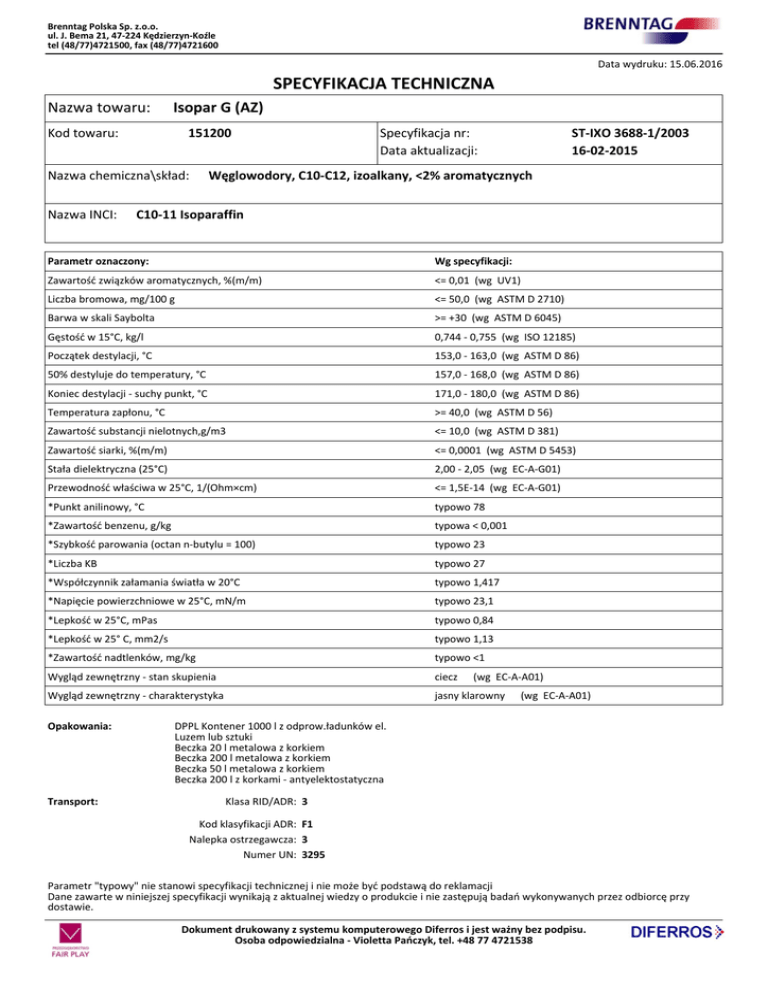 Brenntag Polska Sp. z.o.o. ul. J. Bema 21, 47-224 Kędzierzyn-Koźle tel (48/77)4721500, fax (48/77)4721600 Data wydruku: 15.06.2016 SPECYFIKACJA TECHNICZNA Nazwa towaru: Isopar G (AZ) Kod towaru: 151200 Nazwa chemiczna\skład: Nazwa INCI: Specyfikacja nr: Data aktualizacji: ST-IXO 3688-1/2003 16-02-2015 Węglowodory, C10-C12, izoalkany, <2% aromatycznych C10-11 Isoparaffin Parametr oznaczony: Wg specyfikacji: Zawartość związków aromatycznych, %(m/m) <= 0,01 (wg UV1) Liczba bromowa, mg/100 g <= 50,0 (wg ASTM D 2710) Barwa w skali Saybolta >= +30 (wg ASTM D 6045) Gęstość w 15°C, kg/l 0,744 - 0,755 (wg ISO 12185) Początek destylacji, °C 153,0 - 163,0 (wg ASTM D 86) 50% destyluje do temperatury, °C 157,0 - 168,0 (wg ASTM D 86) Koniec destylacji - suchy punkt, °C 171,0 - 180,0 (wg ASTM D 86) Temperatura zapłonu, °C >= 40,0 (wg ASTM D 56) Zawartość substancji nielotnych,g/m3 <= 10,0 (wg ASTM D 381) Zawartość siarki, %(m/m) <= 0,0001 (wg ASTM D 5453) Stała dielektryczna (25°C) 2,00 - 2,05 (wg EC-A-G01) Przewodność właściwa w 25°C, 1/(Ohm×cm) <= 1,5E-14 (wg EC-A-G01) *Punkt anilinowy, °C typowo 78 *Zawartość benzenu, g/kg typowa < 0,001 *Szybkość parowania (octan n-butylu = 100) typowo 23 *Liczba KB typowo 27 *Współczynnik załamania światła w 20°C typowo 1,417 *Napięcie powierzchniowe w 25°C, mN/m typowo 23,1 *Lepkość w 25°C, mPas typowo 0,84 *Lepkość w 25° C, mm2/s typowo 1,13 *Zawartość nadtlenków, mg/kg typowo <1 Wygląd zewnętrzny - stan skupienia ciecz Wygląd zewnętrzny - charakterystyka jasny klarowny Opakowania: Transport: (wg EC-A-A01) (wg EC-A-A01) DPPL Kontener 1000 l z odprow.ładunków el. Luzem lub sztuki Beczka 20 l metalowa z korkiem Beczka 200 l metalowa z korkiem Beczka 50 l metalowa z korkiem Beczka 200 l z korkami - antyelektostatyczna Klasa RID/ADR: 3 Kod klasyfikacji ADR: F1 Nalepka ostrzegawcza: 3 Numer UN: 3295 Parametr "typowy" nie stanowi specyfikacji technicznej i nie może być podstawą do reklamacji Dane zawarte w niniejszej specyfikacji wynikają z aktualnej wiedzy o produkcie i nie zastępują badań wykonywanych przez odbiorcę przy dostawie. Dokument drukowany z systemu komputerowego Diferros i jest ważny bez podpisu. Osoba odpowiedzialna - Violetta Pańczyk, tel. +48 77 4721538 Brenntag Polska Sp. z.o.o. ul. J. Bema 21, 47-224 Kędzierzyn-Koźle tel (48/77)4721500, fax (48/77)4721600 Przechowywanie: Przechowywać w szczelnie zamkniętych opakowaniach w chłodnym pomieszczeniu o dobrej wentylacji. Zachować ostrożność podczas transportu i przemieszczania pojemników. Otwierając, uważać na różnicę ciśnień. Pojemniki magazynowe powinny być połączone i uziemnione. Odpowiednie materiału i pokrycia: nieorganiczne powłoki cykowe, epoksyda aminowa, epoksyda poliamidowa, żywice epoksy-fenolowe, neoprenowe, stal węglowa, stal nierdzewna Nieodpowiednie materiały i pokrycia: powłoki winylowe, naturalny kauczuk, kauczuk butylowy, EPDM, polistyren Unikać zanieczyzczenia skóry. Usunąć wszystkie źródła otwartego ognia i zapłonu. Unikać iskier. Nie palić. Zastosować specjalne środki ostrożności zapobiegające powstawaniu elektryczności statycznej. Uziemić cały sprzęt. Stosować wyłącznie w pomieszczeniach o dobrej wentylacji. Unikać wycieków z opakowania w celu wyeliminowania ryzyka poślizgnięcia na rozlanym produkcie. Okres ważności: 365 dni Uwagi: *parametr dodatkowy Ten produkt nie jest jakości spożywczej, paszowej, farmaceutycznej. W związku z tym nie może być użyty jako dodatek/składnik żywności, pasz lub produktów farmaceutycznych. Użycie produktu do tych zastosowań pozostaje w zakresie odpowiedzialności klienta. Parametr "typowy" nie stanowi specyfikacji technicznej i nie może być podstawą do reklamacji Dane zawarte w niniejszej specyfikacji wynikają z aktualnej wiedzy o produkcie i nie zastępują badań wykonywanych przez odbiorcę przy dostawie. Dokument drukowany z systemu komputerowego Diferros i jest ważny bez podpisu. Osoba odpowiedzialna - Violetta Pańczyk, tel. +48 77 4721538