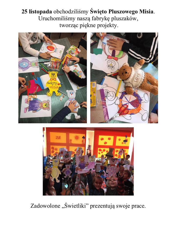25 listopada obchodziliśmy Święto Pluszowego Misia. Uruchomiliśmy naszą fabrykę pluszaków, tworząc piękne projekty. Zadowolone „Świetliki” prezentują swoje prace. Z naszymi pluszakami spędziliśmy cały dzień w świetlicy. To oni byli dziś naszymi gośćmi. Każdy pluszak był przedstawiony przez swojego właściciela. To był wyjątkowy czas