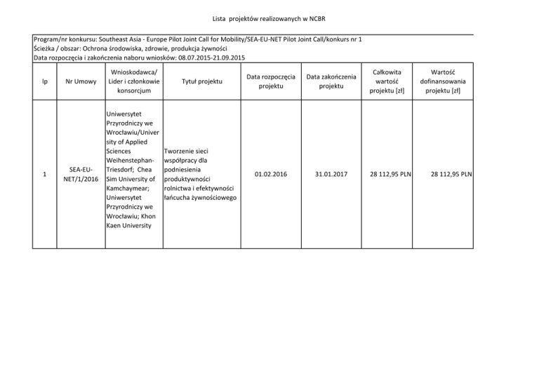Lista projektów realizowanych w NCBR Program/nr konkursu: Southeast Asia - Europe Pilot Joint Call for Mobility/SEA-EU-NET Pilot Joint Call/konkurs nr 1 Ścieżka / obszar: Ochrona środowiska, zdrowie, produkcja żywności Data rozpoczęcia i zakończenia naboru wniosków: 08.07.2015-21.09.2015 lp 1 Nr Umowy SEA-EUNET/1/2016 Wnioskodawca/ Lider i członkowie konsorcjum Uniwersytet Przyrodniczy we Wrocławiu/Univer sity of Applied Sciences WeihenstephanTriesdorf; Chea Sim University of Kamchaymear; Uniwersytet Przyrodniczy we Wrocławiu; Khon Kaen University Tytuł projektu Data rozpoczęcia projektu Data zakończenia projektu Tworzenie sieci współpracy dla podniesienia produktywności rolnictwa i efektywności łańcucha żywnościowego 01.02.2016 31.01.2017 Całkowita wartość projektu [zł] 28 112,95 PLN Wartość dofinansowania projektu [zł] 28 112,95 PLN