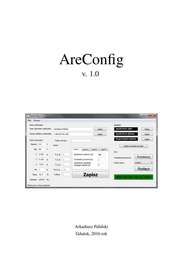 AreConfig v. 1.0 Arkadiusz Paliński Gdańsk, 2016 rok Spis treści 1. Wst˛ep . . . . . . . . . . . . . . . . . . . . . . . . . . . . . . . . . . . . . . . 2 2. Opis poszczególnych elementów programu . . . . . . . . . . . . . . . . . . 3 2.1. Menu główne . . . . . . . . . . . . . . . . . . . . . . . . . . . . . . . . 3 2.2. Dane właściciela . . . . . . . . . . . . . . . . . . . . . . . . . . . . . . 4 2.3. Numer seryjny . . . . . . . . . . . . . . . . . . . . . . . . . . . . . . . 4 2.4. Dane odczytane z Arecordera . . . . . . . . . . . . . . . . . . . . . . . 4 2.5. Pasek stanu . . . . . . . . . . . . . . . . . . . . . . . . . . . . . . . . . 4 2.6. Opcje . . . . . . . . . . . . . . . . . . . . . . . . . . . . . . . . . . . . 4 2.7. Połaczenie ˛ z Arecorderem . . . . . . . . . . . . . . . . . . . . . . . . . 5 2.8. Zapalniki . . . . . . . . . . . . . . . . . . . . . . . . . . . . . . . . . . 5 3. Opis działania . . . . . . . . . . . . . . . . . . . . . . . . . . . . . . . . . . 6 3.1. Podłaczenie ˛ Arecordera do komputera . . . . . . . . . . . . . . . . . . . 6 3.2. Programowanie i podglad ˛ parametrów . . . . . . . . . . . . . . . . . . . 6 3.3. Testowanie zapalników . . . . . . . . . . . . . . . . . . . . . . . . . . . 7 1. Wst˛ep AreConfig jest programem pozwalajacym ˛ na zmian˛e opcji oraz kalibracj˛e rejestratora danych Arecorder. Program istnieje w dwóch wersjach - przeznaczonej dla użytkownika Arecordera oraz w wersji kalibracyjnej. Areconfig umożliwia: — zmian˛e wszystkich czterech zestawów konfiguracji - wysokości, na której ma zostać wyzwolony spadochron główny, wysokości wyrzutni i opóźnienie wyzwolenia drugiego stopnia rakiety, — przetestowanie wykrywania obecności oraz wyzwalania zapalników w kontrolowanych warunkach, — zmian˛e danych właściciela Arecordera, — odczyt pomiarów z akcelerometrów, czujnika ciśnienia, czujnika temperatury i napi˛ecia zasilana oraz wyliczany na ich podstawie kat ˛ pochylenia Arecordera do pionu, — kalibracj˛e akcelerometrów oraz czujnika ciśnienia (tylko wersja kalibracyjna), — zmian˛e numeru seryjnego Arecordera (tylko wersja kalibracyjna). 2. Opis poszczególnych elementów programu Rysunek 2.1. Opis poszczególnych elementów programu. 1. menu główne 2.1, 2. dane właściciela 2.2, 3. numer seryjny 2.3, 4. dane odczytane z Arecordera 2.4, 5. pasek stanu 2.5, 6. opcje 2.6, 7. połaczenie ˛ z Arecorderem 2.7, 8. zapalniki 2.8. 2.1. Menu główne Ponieważ w AreConfigu wszystko robi si˛e z poziomu aplikacji, w menu głównym nie ma wielu opcji. Rozwijajac ˛ menu Plik jest do wyboru jedynie opcja Zakończ, która kończy działanie programu. Rozwijajac ˛ menu Pomoc jest do wyboru opcja Pomoc, która wyświetla instrukcje jak połaczyć ˛ si˛e z Arecorderem oraz opcja O programie, która wyświetla informacje o programie AreConfig, jego wersji oraz adres mailowy do twórcy oprogramowania i adresy internetowe stron poświ˛econych Arecorderowi oraz AreConfigowi. ROZDZIAŁ 2. OPIS POSZCZEGÓLNYCH ELEMENTÓW PROGRAMU 2.2. Dane właściciela W sekcji Dane właściciela można zmienić imi˛e i nazwisko jak i numer telefonu właściciela Arecordera. Dane te zapisywane sa˛ na poczatku ˛ każdego pliku z pomiarami zapisywanymi przez Arecorder. W polu Imi˛e i Nazwisko właściciela nie można używać polskich znaków diakrytycznych. 2.3. Numer seryjny W tej sekcji wyświetlany jest numer seryjny danego egzemplarza Arecordera. 2.4. Dane odczytane z Arecordera W tej sekcji prezentowane sa˛ dane odczytane z Arecordera: — Bateria - napi˛ecie na baterii zasilajacej ˛ Arecorder (podczas konfiguracji Arecorder jest zasilany przez port USB komputera i bateria nie musi być do niego dołaczona ˛ - stad ˛ pomiar napi˛ecia 0 V na baterii), — Kat ˛ - kat ˛ pochylenia Arecordera do pionu, — X - składowa akcelerometru ± 24 g wzdłuż osi Arecordera, — Y - składowa akcelerometru ± 24 g skierowana na szerokość Arecordera, — Z - składowa akcelerometru ± 24 g skierowana z od górnej strony płytki Arecordera na dolna,˛ — Ha - składowa akcelerometru ± 80 g wzdłuż osi Arecordera, — Temp - temperatura, — Ciśnienie - ciśnienie atmosferyczne aktualnie mierzone przez czujnik ciśnienia. 2.5. Pasek stanu Pasek stanu prezentuje dodatkowe informacje na temat połaczenia ˛ z Arecorderem. 2.6. Opcje W tej sekcji można dokonać konfiguracji opcji wysokości, na której ma zostać wyzwolony spadochron główny, wysokości wyrzutni i opóźnienia wyzwolenia drugiego stopnia rakiety dla każdego zestawu konfiguracji. Zestawy konfiguracji można przełaczać ˛ zakładkami w tej sekcji. Wersja kalibracyjna umożliwia także zmian˛e parametrów kalibracyjnych akcelerometrów i czujnika temperatury. Wersja dla użytkownika umożliwia jedynie podglad ˛ tych wartości. ROZDZIAŁ 2. OPIS POSZCZEGÓLNYCH ELEMENTÓW PROGRAMU 2.7. Połaczenie ˛ z Arecorderem Sekcja połaczenia ˛ z Arecorderem. W tej sekcji znajduje si˛e przycisk Połacz/Rozł ˛ acz, ˛ przycisk do skanowania dost˛epnych na komputerze portów, lista portów, do których można si˛e połaczyć ˛ oraz etykieta wskazujaca ˛ aktualny stan połaczenia. ˛ 2.8. Zapalniki W tej sekcji można podejrzeć czy do któregoś ze złacz ˛ do podłaczenia ˛ zapalników podłaczony ˛ jest zapalnik. W tej sekcji znajduja˛ si˛e również przyciski do wyzwalania wybranego zapalnika oraz przycisk wyzwalajacy ˛ wszystkie zapalniki po kolei. UWAGA - Zapalniki sa˛ wyzwalane wyłacznie ˛ zasilaniem z baterii, zasilanie z portu USB komputera zasila pozostała˛ cz˛eść Arecordera. W celu przetestowania działania zapalników - zarówno testowania podłaczenia ˛ jak i wyzwalania - konieczne jest podłaczenie ˛ zewn˛etrzengo zasilania do Arecordera. 3. Opis działania 3.1. Podłaczenie ˛ Arecordera do komputera Należy podłaczyć ˛ Arecorder poprzez kabel USB do komputera, dopiero wtedy użytkownik powinien właczyć ˛ pro