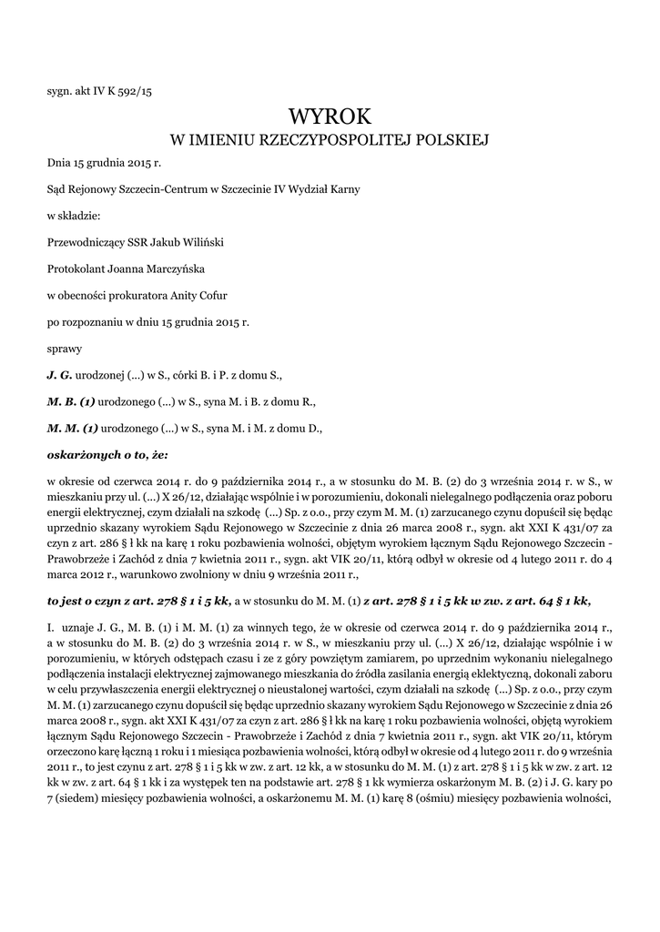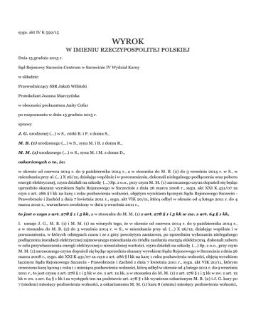 sygn. akt IV K 592/15 WYROK W IMIENIU RZECZYPOSPOLITEJ POLSKIEJ Dnia 15 grudnia 2015 r. Sąd Rejonowy Szczecin-Centrum w Szczecinie IV Wydział Karny w składzie: Przewodniczący SSR Jakub Wiliński Protokolant Joanna Marczyńska w obecności prokuratora Anity Cofur po rozpoznaniu w dniu 15 grudnia 2015 r. sprawy J. G. urodzonej (...) w S., córki B. i P. z domu S., M. B. (1) urodzonego (...) w S., syna M. i B. z domu R., M. M. (1) urodzonego (...) w S., syna M. i M. z domu D., oskarżonych o to, że: w okresie od czerwca 2014 r. do 9 października 2014 r., a w stosunku do M. B. (2) do 3 września 2014 r. w S., w mieszkaniu przy ul. (...) X 26/12, działając wspólnie i w porozumieniu, dokonali nielegalnego podłączenia oraz poboru energii elektrycznej, czym działali na szkodę (...) Sp. z o.o., przy czym M. M. (1) zarzucanego czynu dopuścił się będąc uprzednio skazany wyrokiem Sądu Rejonowego w Szczecinie z dnia 26 marca 2008 r., sygn. akt XXI K 431/07 za czyn z art. 286 § ł kk na karę 1 roku pozbawienia wolności, objętym wyrokiem łącznym Sądu Rejonowego Szczecin Prawobrzeże i Zachód z dnia 7 kwietnia 2011 r., sygn. akt VIK 20/11, którą odbył w okresie od 4 lutego 2011 r. do 4 marca 2012 r., warunkowo zwolniony w dniu 9 września 2011 r., to jest o czyn z art. 278 § 1 i 5 kk, a w stosunku do M. M. (1) z art. 278 § 1 i 5 kk w zw. z art. 64 § 1 kk, I. uznaje J. G., M. B. (1) i M. M. (1) za winnych tego, że w okresie od czerwca 2014 r. do 9 października 2014 r., a w stosunku do M. B. (2) do 3 września 2014 r. w S., w mieszkaniu przy ul. (...) X 26/12, działając wspólnie i w porozumieniu, w których odstępach czasu i ze z góry powziętym zamiarem, po uprzednim wykonaniu nielegalnego podłączenia instalacji elektrycznej zajmowanego mieszkania do źródła zasilania energią eklektyczną, dokonali zaboru w celu przywłaszczenia energii elektrycznej o nieustalonej wartości, czym działali na szkodę (...) Sp. z o.o., przy czym M. M. (1) zarzucanego czynu dopuścił się będąc uprzednio skazany wyrokiem Sądu Rejonowego w Szczecinie z dnia 26 marca 2008 r., sygn. akt XXI K 431/07 za czyn z art. 286 § ł kk na karę 1 roku pozbawienia wolności, objętą wyrokiem łącznym Sądu Rejonowego Szczecin - Prawobrzeże i Zachód z dnia 7 kwietnia 2011 r., sygn. akt VIK 20/11, którym orzeczono karę łączną 1 roku i 1 miesiąca pozbawienia wolności, którą odbył w okresie od 4 lutego 2011 r. do 9 września 2011 r., to jest czynu z art. 278 § 1 i 5 kk w zw. z art. 12 kk, a w stosunku do M. M. (1) z art. 278 § 1 i 5 kk w zw. z art. 12 kk w zw. z art. 64 § 1 kk i za występek ten na podstawie art. 278 § 1 kk wymierza oskarżonym M. B. (2) i J. G. kary po 7 (siedem) miesięcy pozbawienia wolności, a oskarżonemu M. M. (1) karę 8 (ośmiu) miesięcy pozbawienia wolności, II. na podstawie art. 69 § 1 i 2 kk i art. 70 § 1 pkt 1 kk – w zw. z art. 4 § 1 kk – wykonanie orzeczonej kary pozbawienia wolności warunkowo zawiesza oskarżonemu M. B. (2) na okres próby 4 (czterech) lat, III. na podstawie art. 624 § 1 kpk zwalnia oskarżonych w całości od ponoszenia kosztów sądowych. sygn. akt IV K 592/15 UZASADNIENIE Oskarżeni M. M. (1) i J. G. – wraz z ich wspólnym dzieckiem – oraz oskarżony M. B. (1) zamieszkiwali w lokalu mieszkalnym przy ul. (...) (...) w S.. W czerwcu 2014 r. mieszkanie to odłączone zostało od zasilania energią elektryczną. Wówczas oskarżeni postanowili dokonać nielegalnego podłączenia instalacji elektrycznej mieszkania do zasilającej instalacji elektrycznej budynku. Dostawcą energii elektrycznej była (...) S.A. Nielegalne podłączenie wykonał w czerwcu 2014 r. oskarżony M. B. (1). Od tego czasu wszyscy oskarżeni korzystali z energii elektrycznej, którą zasilali znajdujące się w mieszkaniu odbiorniki elektryczne. Dowody: - wyjaśnienia oskarżonej J. G., k. 50, - wyjaśnienia oskarżonego M. B. (1), k. 53, - wyjaśnienia oskarżonego M. M. (3), k. 59-60. W dniu 9 października 2014 r. pracownicy (...) S.A. Rejonu (...) w S. udali się na kontrolę instalacji elektrycznej mieszkania przy ul. (...) X 26/12 w S.. Po przybyciu na miejsce kontrolerzy w mieszkaniu stwierdzili brak układu pomiarowego na tablicy licznikowej. Do listwy piętrowej na klatce schodowej był za to podłączony sztukowany przewód elektryczny, który poprowadzono z klatki schodowej do mieszkania. Za pomocą tego przewodu instalacja elektryczna mieszkania podłączona została do instalacji zasilającej. W chwili kontroli pomiar natężenia prądu elektrycznego wynosił 8,48 A. W mieszkaniu ujawniono szereg sprawnych odbiorników elektrycznych jak telewizor, kuchenka elektryczna, pralka, lodówka, czajnik, kuchenka mikrofalowa i inne. Obecna przy kontroli oskarżona J. G. odmówiła podpisania protokołu kontroli. Nielegalne podłączenie instalacji elektrycznej mieszkania zostało przez kontrolerów usunięte. Dowody: - zeznania świadka S. D., k. 21, - zeznania świadka K. O., k. 25, - wyjaśnienia oskarżonej J. G., k. 50, - protokół kontroli, k. 4-8, - dokumentacja zdjęciowa, k. 9-13. J. G. ma 32 lata. Jest panną. Na utrzymaniu posiada jedno dziecko w wieku 9 lat. Pozostaje bezrobotna. Utrzymuje się z prac dorywczych, świadczenia rodzinnego i pomocy (...). Oskarżona była uprzednio dwa razy karana sądownie. Dowody: - wyjaśnienia oskarżonej, k. 50, - dane o karalności, k. 74. M. M. (3) ma 33 lata. Jest kawalerem. Na utrzymaniu posiada jedno dziecko w wieku 9 lat. Oskarżony był uprzednio wielokrotnie karany sądownie w tym wyrokiem Sądu Rejonowego w Szczecinie z dnia 26 marca 2008 r., sygn. akt XXI K 431/07 za czyn z art. 286 § 1 kk na karę 1 roku pozbawienia wolności, objętą wyrokiem łącznym Sądu Rejonowego Szczecin - Prawobrzeże i Zachód z dnia 7 kwietnia 2011 r., sygn. akt VIK 20/11, którym orzeczono karę łączną 1 roku i 1 miesiąca pozbawienia wolności, którą odbył w okresie od 4 lutego 2011 r. do 9 
