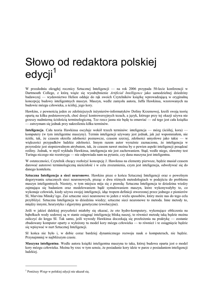 Słowo od redaktora polskiej 1 edycji W przededniu okrągłej rocznicy Sztucznej Inteligencji — na rok 2006 przypada 50-lecie konferencji w Dartmouth College, z którą wiąŜe się wyodrębnienie Artificial Intelligence jako samodzielnej dziedziny badawczej — wydawnictwo Helion oddaje do rąk swoich Czytelników ksiąŜkę wprowadzającą w oryginalną koncepcję budowy inteligentnych maszyn. Maszyn, wedle zamysłu autora, Jaffa Hawkinsa, wzorowanych na budowie mózgu człowieka, a ściślej, jego kory. Hawkins, z pewnością jeden ze zdolniejszych inŜynierów-informatyków Doliny Krzemowej, kreśli swoją teorię opartą na kilku podstawowych, choć dosyć kontrowersyjnych tezach, a język, którego przy tej okazji uŜywa nie grzeszy nadmierną ścisłością terminologiczną. Tez rzecz jasna nie będę tu omawiać — od tego jest cała ksiąŜka — zatrzymam się jednak przy nakreśleniu kilku terminów. Inteligencja. Cała teoria Hawkinsa oscyluje wokół trzech terminów: inteligencja — mózg (ściślej, kora) — komputery (w tym inteligentne maszyny). Termin inteligencji uŜywany jest jednak, jak juŜ wspomniałem, nie ściśle, tak, Ŝe czasem określa zdolności poznawcze, czasem szerzej, zdolności umysłowe jako takie — w większości przypadków ludzkie zdolności. Innym razem autor wyraźnie zaznaczona, Ŝe inteligencja w przyrodzie jest stopniowalnym atrybutem, tak, Ŝe czasem nawet moŜna by o pewien aspekt inteligencji posądzać rośliny. Jednak, w myśl wykładu Hawkinsa, inteligencja nie jest zachowaniem. Stąd, wedle niego, sławetny test Turinga niczego nie rozstrzyga — nie odpowiada nam na pytanie, czy dana maszyna jest inteligentna. W ostateczności, Czytelnik chcący rozłoŜyć koncepcję J. Hawiknsa na elementy pierwsze, będzie musiał czasem darować autorowi terminologiczną nieścisłość i w celu zrozumienia, czym jest inteligencja, odwoływać się do danego kontekstu. Sztuczna Inteligencja a sieci neuronowe. Hawkins pisze o końcu Sztucznej Inteligencji oraz o powolnym dogorywaniu sztucznych sieci neuronowych, pisząc o dwu róŜnych metodologiach w podejściu do problemu maszyn inteligentnych. Niestety, w tym miejscu mija się z prawdą: Sztuczna Inteligencja to dziedzina wiedzy zajmująca się badaniem oraz modelowaniem bądź symulowaniem maszyn, które wykonywałyby to, co wykonuje człowiek, kiedy uŜywa swojej inteligencji, idąc tropem definicji stworzonej przez jednego z pionierów SI, Marvina Minsky’ego. Zaś sztuczne sieci neuronowe to jeden z wielu sposobów, który moŜe nas do tego celu przybliŜyć. Sztuczna Inteligencja to dziedzina wiedzy; sztuczne sieci neuronowe to metoda. Inne metody to, między innymi, heurystyka i algorytmy genetyczne (ewolucyjne). Jeśli w jakieś dalekiej przyszłości miałoby się okazać, Ŝe oto hydro-komputery, wykonujące obliczenia na bąbelkach wody sodowej są w stanie osiągnąć inteligencję bliską naszej, to równieŜ metodę taką będzie moŜna zaliczyć do kręgu SI. Tak samo, jeśli wywody Hawkinsa doczekają się przełoŜenia na praktykę — zostanie zbudowany komputer oparty o wyłoŜony tu model kory mózgu człowieka — to równieŜ i te osiągnięcie będzie się wpisywać w nurt Sztucznej Inteligencji. SI końca nie było i, w dobie coraz bardziej dynamicznego rozwoju nauk o komputerach, nie będzie. Przynajmniej w najbliŜszym czasie. Maszyna inteligentna. Wedle autora ksiąŜki inteligentna maszyna to taka, której budowa oparta jest o model kory mózgu człowieka. MoŜna by rzec w tym sensie, Ŝe posiadanie kory idzie w parze z posiadaniem inteligencji ludzkiej. 1 PoniŜszy Wstęp w polskiej edycji nie ukazał się. Historia SI posiada juŜ klasyczne rozstrzygnięcie problemu, kiedy maszyna jest inteligentna (czy raczej, kiedy maszyna myśli), jest nią rzecz jasna sławetny test Turinga: ZałóŜmy oto, Ŝe kolejny dzień prowadzimy dialog przez nasz ulubiony komunikator (program typu Instant Messager). Jeśli po któreś z dłuŜszych rozmów, okazałoby się, Ŝe naszym współrozmówcą była maszyna, a nie człowiek, a faktu tego nie mogliśmy dowieść w czasie trwania samej rozmowy (program tak samo sprawnie rozmawiał, jak to zwykli robić ludzie), wówczas naleŜałoby stwierdzić, Ŝe tego typu maszyna… no właśnie — myśli. Hawkinsowi odpowiedź Turinga nie przypadła do gustu; choć i nie przypadł mu równieŜ i argument „chińskiego pokoju” autorstwa Johna Searle’a, mający zdyskredytować sens testu Turinga. Pisze, Ŝe inteligencja to nie zachowanie, stąd na podstawie przeprowadzonej rozmowy nie moŜna stwierdzić, czy po drugiej stronie znajduje się jakaś… inteligencja. Zatem, co umoŜliwiłoby oszacowanie czy dana maszyna jest inteligentna, i w jakich sytuacjach moŜemy mówić o inteligentnych maszynach? Odpowiedź jest prosta: maszyna musiałaby działać tak, jak działa nasza kora mózgowa. Co to znaczy w kontekście zdolności psychicznych? Aby odpowiedzieć na to pytanie, zapraszam juŜ do lektury: J. Hawkins, S. Blakeslee, Istota inteligencji. Marek J. Kasperski Gdańsk, sierpień 2005