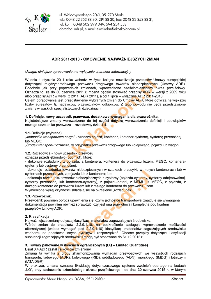 ul. Wołodyjowskiego 20/1, 05-270 Marki tel.: 0048 22 353 88 30, 219 88 30, fax: 0048 22 353 88 31, tel. kom. 0048 602 399 049, 694 254 558 doradca-adr.pl, e-mail: [email protected] ADR 2011-2013 - OMÓWIENIE NAJWAśNIEJSZYCH ZMIAN Uwaga: niniejsze opracowanie ma wyłącznie charakter informacyjny W dniu 1 stycznia 2011 roku wchodzi w Ŝycie kolejna nowelizacja przepisów Umowy europejskiej dotyczącej międzynarodowego przewozu drogowego towarów niebezpiecznych (Umowy ADR). Podobnie jak przy poprzednich zmianach, wprowadzono sześciomiesięczny okres przejściowy. Oznacza to, Ŝe do 30 czerwca 2011 r. moŜna będzie stosować przepisy ADR w wersji z 2009 roku albo przepisy ADR w wersji z 2011 (ADR 2011), a od 1 lipca – wyłącznie ADR 2011-2013. Celem opracowania jest przedstawienie wybranych zmian do Umowy ADR, które dotyczą największej liczby adresatów, tj. nadawców, przewoźników, odbiorców. Z tego powodu nie będą przedstawione zmiany w wąskich specjalistycznych dziedzinach. 1. Definicje, nowy uczestnik przewozu, dodatkowe wymagania dla przewoźnika. Najistotniejsze zmiany wprowadzone do tej części dotyczą wprowadzenia definicji i obowiązków nowego uczestnika przewozu – rozładowcy dział 1.4. 1.1. Definicje (wybrane): „Jednostka transportowa cargo” - oznacza pojazd, kontener, kontener-cysternę, cysternę przenośną lub MEGC; „Środek transportu” oznacza, w przypadku przewozu drogowego lub kolejowego, pojazd lub wagon. 1.2. Rozładowca - nowy uczestnik przewozu oznacza przedsiębiorstwo (podmiot), które: - dokonuje rozładunku z pojazdu, z kontenera, kontenera do przewozu luzem, MEGC, konteneracysterny lub cysterny przenośnej; - dokonuje rozładunku towarów niebezpiecznych w sztukach przesyłki, w małych kontenerach lub w cysternach przenośnych, z pojazdu lub z kontenera; lub - dokonuje rozładunku towarów niebezpiecznych z cysterny (pojazdu-cysterny, cysterny odejmowalnej, cysterny przenośnej lub kontenera-cysterny), z pojazdu-baterii, z MEMU, z MEGC, z pojazdu, z duŜego kontenera do przewozu luzem lub z małego kontenera do przewozu luzem. Wymienione wyŜej czynności składają się na określenie „rozładunek”. 1.3. Przewoźnik. Przewoźnik powinien oprócz upewnienia się, czy w jednostce transportowej znajduje się wymagana dokumentacja powinien równieŜ sprawdzić, czy jest ona prawidłowa i kompletna pod kontem przepisów Umowy ADR. 2. Klasyfikacja NajwaŜniejsze zmiany dotyczą klasyfikacji materiałów zagraŜających środowisku. Wśród zmian do przepisów 2.2.9.1.10, na podkreślenie zasługuje wprowadzenie moŜliwości alternatywnej (wobec wymagań pod 2.2.9.1.10) klasyfikacji materiałów zagraŜających środowisku wodnemu na podstawie innych dyrektyw i rozporządzeń. Obecne przepisy dotyczące klasyfikacji substancji zagraŜających środowisku mogą być stosowane do 31.12.2012 r. 3. Towary pakowane w ilościach ograniczonych (LQ – Limited Quantities) Dział 3.4 ADR zastał całkowicie zmieniony. Zmiana ta wynika z próby zharmonizowania wymagań przewozowych we wszystkich rodzajach transportu: lądowego (ADR), kolejowego (RID), śródlądowego (ADN), morskiego (IMDG) i lotniczym (IATA DGR). W praktyce, zmiana oznacza likwidację dotychczasowego systemu zwolnień opartego na kodach „LQ”, przy zachowaniu czteroletniego okresu przejściowego - do dnia 30 czerwca 2015 r., w którym Opracowała: Maria Nicopulos, DGSA, 25.11.2010 r. Strona 1 ul. Wołodyjowskiego 20/1, 05-270 Marki tel.: 0048 22 353 88 30, 219 88 30, fax: 0048 22 353 88 31, tel. kom. 0048 602 399 049, 694 254 558 doradca-adr.pl, e-mail: [email protected] dozwolone będzie stosowanie przepisów obecnych (ADR 2009). lub lub lub lub 3.1. Limity towarów niebezpiecznych znajdujących się w opakowaniach wewnętrznych będą inne niŜ określone obecnie za pomocą kodów i podane bezpośrednio w wykazie towarów w miejsce dotychczasowych kodów „LQ”. 3.2. Przed rozpoczęciem przewozu, nadawcy towarów niebezpiecznych pakowanych w ilościach ograniczonych powinni poinformować przewoźnika o całkowitej masie brutto nadawanych towarów. 3.3. Osoby biorące udział w przewozie towarów pakowanych w ilościach ograniczonych mają obowiązek uczestniczyć w cyklicznych szkoleniach. 3.4. Zaostrzone zostają wymagania wobec opakowań. 3.5. Sztuki przesyłki zawierające towary niebezpieczne pakowane w ilościach ograniczonych powinny być zaopatrzone w znak pokazany poniŜej. Znak ten powinien być dobrze widoczny, trwały i odporny na działanie czynników atmosferycznych. Jego minimalne wymiary wynoszą 100 mm x 100 mm, a grubość linii obrzeŜa 2 mm. JeŜeli jest to uzasadnione wielkością sztuki przesyłki, to podane wymiary mogą być zmniejszone, pod warunkiem, Ŝe znak nie będzie mniejszy niŜ 50 mm x 50 mm i pozostanie dobrze widoczny. 3.6. Jednostki transportowe (pojazdy samochodowe z przyczepą lub bez) przewoŜące powyŜej 8 ton brutto towarów niebezpiecznych pakowanych w ilościach ograniczonych, powinny być oznakowane z przodu i z tyłu takim samym znakiem, przy czym jego minimalne wymiary wynoszą wówczas 250 mm x 250 mm. W przypadku kontenerów powiększone znaki umieszcza sie na czterech ścianach bocznych. JeŜeli oznakowanie kontenerów jest widoczne z zewnątrz jednostki transportowej, to jej oznakowanie nie jest wymagane. Wymiennie moŜna zastosować oznakowanie gładkimi tablicami barwy pomarańczowej lub tablicą z napisem „Ltd Qty”. 3.7. Nowy znak dla towarów pakowanych w ilościach ograniczonych dotyczy sztuk przesyłki (opakowań z zawartością w postaci mniejszych opakowań wewnętrznych lub przedmiotów niewymagających opakowania, np. aerozoli), kontenerów i pojazdów. Sztuki przesyłki nadawane do przewozu lotniczego powinny być zaopatrzone w znak z literą „Y”. Opracowała: Maria Nicopulos, DGSA, 25.11.2010 r. Strona 2 ul. Wołodyjowskiego 20/1, 05-270 Marki tel.: 0048 22 353 88 30, 219 88 30, fax: 0048 22 353 88 3