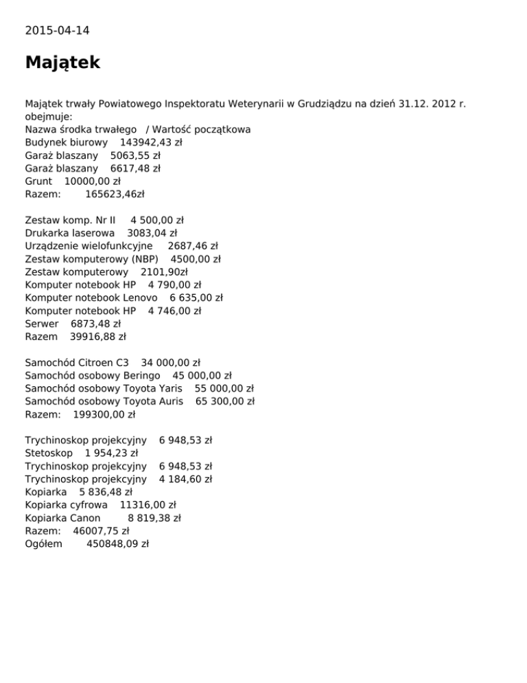 2015-04-14 Majątek Majątek trwały Powiatowego Inspektoratu Weterynarii w Grudziądzu na dzień 31.12. 2012 r. obejmuje: Nazwa środka trwałego / Wartość początkowa Budynek biurowy 143942,43 zł Garaż blaszany 5063,55 zł Garaż blaszany 6617,48 zł Grunt 10000,00 zł Razem: 165623,46zł Zestaw komp. Nr II 4 500,00 zł Drukarka laserowa 3083,04 zł Urządzenie wielofunkcyjne 2687,46 zł Zestaw komputerowy (NBP) 4500,00 zł Zestaw komputerowy 2101,90zł Komputer notebook HP 4 790,00 zł Komputer notebook Lenovo 6 635,00 zł Komputer notebook HP 4 746,00 zł Serwer 6873,48 zł Razem 39916,88 zł Samochód Citroen C3 34 000,00 zł Samochód osobowy Beringo 45 000,00 zł Samochód osobowy Toyota Yaris 55 000,00 zł Samochód osobowy Toyota Auris 65 300,00 zł Razem: 199300,00 zł Trychinoskop projekcyjny 6 948,53 zł Stetoskop 1 954,23 zł Trychinoskop projekcyjny 6 948,53 zł Trychinoskop projekcyjny 4 184,60 zł Kopiarka 5 836,48 zł Kopiarka cyfrowa 11316,00 zł Kopiarka Canon 8 819,38 zł Razem: 46007,75 zł Ogółem 450848,09 zł