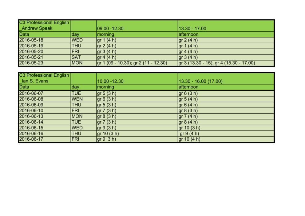 C3 Professional English _Andrew Speak Data 2016-05-18 2016-05-19 2016-05-20 2016-05-21 2016-05-23 C3 Professional English _Ian S. Evans Data 2016-06-07 2016-06-08 2016-06-09 2016-06-10 2016-06-13 2016-06-14 2016-06-15 2016-06-16 2016-06-17 day WED THU FRI SAT MON 09.00 -12.30 morning gr 1 (4 h) gr 2 (4 h) gr 3 (4 h) gr 4 (4 h) gr 1 (09 - 10.30); gr 2 (11 - 12.30) 13.30 - 17.00 afternoon gr 2 (4 h) gr 1 (4 h) gr 4 (4 h) gr 3 (4 h) gr 3 (13.30 - 15); gr 4 (15.30 - 17.00) day TUE WEN THU FRI MON TUE WED THU FRI 10.00 -12.30 morning gr 5 (3 h) gr 6 (3 h) gr 5 (3 h) gr 7 (3 h) gr 8 (3 h) gr 7 (3 h) gr 9 (3 h) gr 10 (3 h) gr 9 3 h) 13.30 - 16.00 (17.00) afternoon gr 6 (3 h) gr 5 (4 h) gr 6 (4 h) gr 8 (3 h) gr 7 (4 h) gr 8 (4 h) gr 10 (3 h) gr 9 (4 h) gr 10 (4 h)