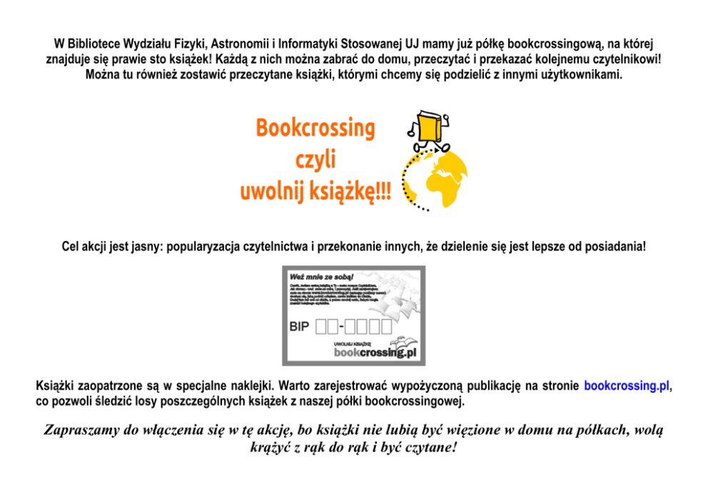 W Bibliotece Wydziału Fizyki, Astronomii i Informatyki Stosowanej UJ mamy już półkę bookcrossingową, na której znajduje się prawie sto książek! Każdą z nich można zabrać do domu, przeczytać i przekazać kolejnemu czytelnikowi! Można tu również zostawić przeczytane książki, którymi chcemy się podzielić z innymi użytkownikami. Cel akcji jest jasny: popularyzacja czytelnictwa i przekonanie innych, że dzielenie się jest lepsze od posiadania! Książki zaopatrzone są w specjalne naklejki. Warto zarejestrować wypożyczoną publikację na stronie bookcrossing.pl, co pozwoli śledzić losy poszczególnych książek z naszej półki bookcrossingowej. Zapraszamy do włączenia się w tę akcję, bo książki nie lubią być więzione w domu na półkach, wolą krążyć z rąk do rąk i być czytane!