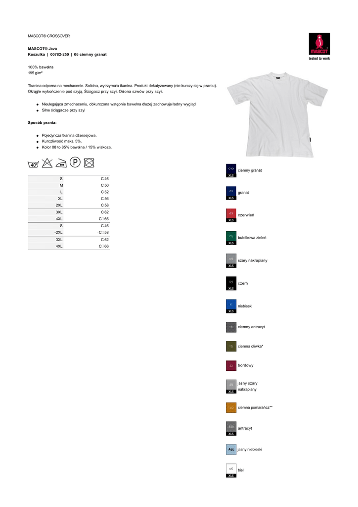 MASCOT® CROSSOVER MASCOT® Java Koszulka | 00782-250 | 06 ciemny granat 100% bawełna 195 g/m² Tkanina odporna na mechacenie. Solidna, wytrzymała tkanina. Produkt dekatyzowany (nie kurczy się w praniu). Okrągłe wykończenie pod szyją. Ściągacz przy szyi. Osłona szwów przy szyi. l Nieulegająca zmechaceniu, obkurczona wstępnie bawełna dłużej zachowuje ładny wygląd l Silne ściągacze przy szyi Sposób prania: l Pojedyncza tkanina dżersejowa. l Kurczliwość maks. 5%. l Kolor 08 to 85% bawełna / 15% wiskoza. ciemny granat S C 46 M C 50 L C 52 XL C 56 2XL C 58 3XL C 62 4XL C66 S C 46 -2XL -C58 3XL C 62 4XL C66 granat czerwień butelkowa zieleń szary nakrapiany czerń niebieski ciemny antracyt ciemna oliwka* bordowy jasny szary nakrapiany ciemna pomarańcz** antracyt jasny niebieski biel