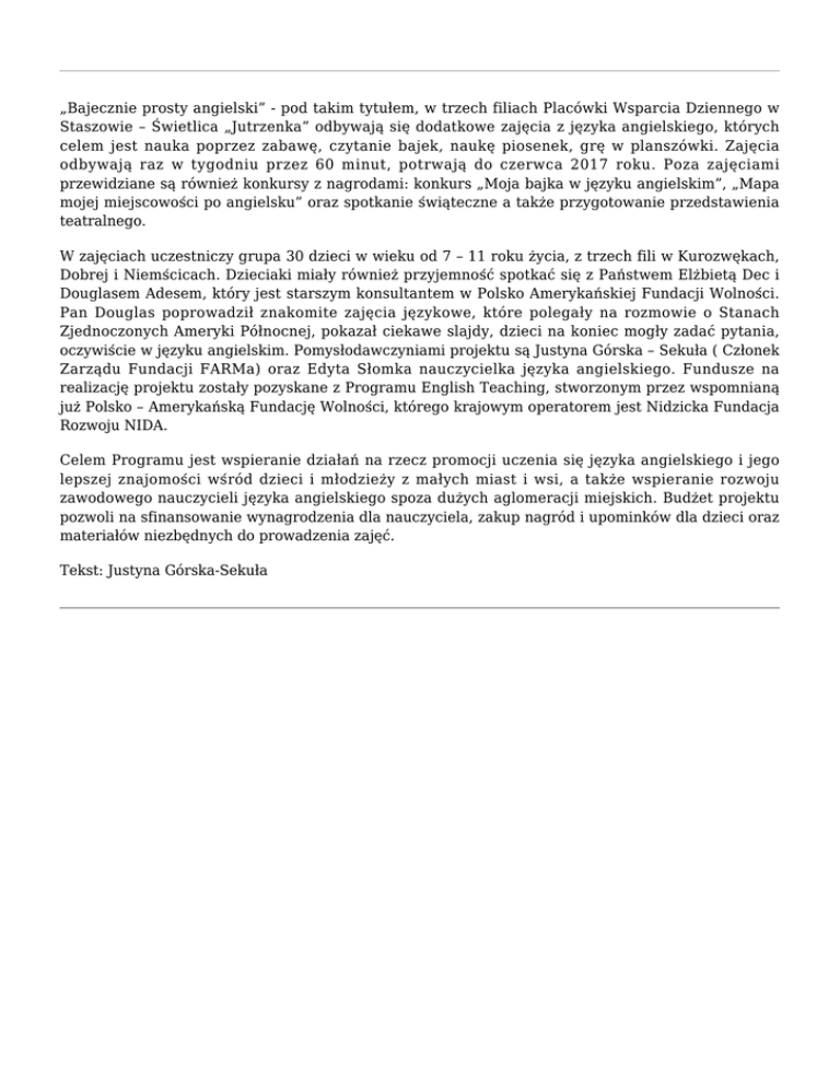 „Bajecznie prosty angielski” - pod takim tytułem, w trzech filiach Placówki Wsparcia Dziennego w Staszowie – Świetlica „Jutrzenka” odbywają się dodatkowe zajęcia z języka angielskiego, których celem jest nauka poprzez zabawę, czytanie bajek, naukę piosenek, grę w planszówki. Zajęcia odbywają raz w tygodniu przez 60 minut, potrwają do czerwca 2017 roku. Poza zajęciami przewidziane są również konkursy z nagrodami: konkurs „Moja bajka w języku angielskim”, „Mapa mojej miejscowości po angielsku” oraz spotkanie świąteczne a także przygotowanie przedstawienia teatralnego. W zajęciach uczestniczy grupa 30 dzieci w wieku od 7 – 11 roku życia, z trzech fili w Kurozwękach, Dobrej i Niemścicach. Dzieciaki miały również przyjemność spotkać się z Państwem Elżbietą Dec i Douglasem Adesem, który jest starszym konsultantem w Polsko Amerykańskiej Fundacji Wolności. Pan Douglas poprowadził znakomite zajęcia językowe, które polegały na rozmowie o Stanach Zjednoczonych Ameryki Północnej, pokazał ciekawe slajdy, dzieci na koniec mogły zadać pytania, oczywiście w języku angielskim. Pomysłodawczyniami projektu są Justyna Górska – Sekuła ( Członek Zarządu Fundacji FARMa) oraz Edyta Słomka nauczycielka języka angielskiego. Fundusze na realizację projektu zostały pozyskane z Programu English Teaching, stworzonym przez wspomnianą już Polsko – Amerykańską Fundację Wolności, którego krajowym operatorem jest Nidzicka Fundacja Rozwoju NIDA. Celem Programu jest wspieranie działań na rzecz promocji uczenia się języka angielskiego i jego lepszej znajomości wśród dzieci i młodzieży z małych miast i wsi, a także wspieranie rozwoju zawodowego nauczycieli języka angielskiego spoza dużych aglomeracji miejskich. Budżet projektu pozwoli na sfinansowanie wynagrodzenia dla nauczyciela, zakup nagród i upominków dla dzieci oraz materiałów niezbędnych do prowadzenia zajęć. Tekst: Justyna Górska-Sekuła