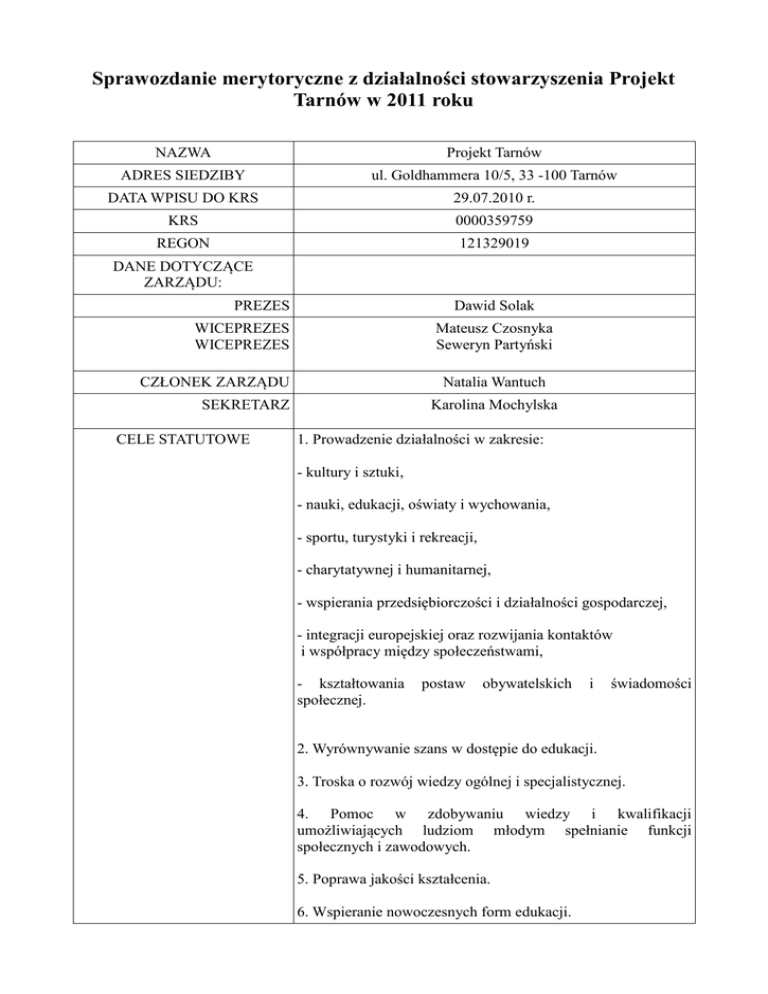 Sprawozdanie merytoryczne z działalności stowarzyszenia Projekt Tarnów w 2011 roku NAZWA Projekt Tarnów ADRES SIEDZIBY ul. Goldhammera 10/5, 33 -100 Tarnów DATA WPISU DO KRS 29.07.2010 r. KRS 0000359759 REGON 121329019 DANE DOTYCZĄCE ZARZĄDU: PREZES Dawid Solak WICEPREZES WICEPREZES Mateusz Czosnyka Seweryn Partyński CZŁONEK ZARZĄDU Natalia Wantuch SEKRETARZ CELE STATUTOWE Karolina Mochylska 1. Prowadzenie działalności w zakresie: - kultury i sztuki, - nauki, edukacji, oświaty i wychowania, - sportu, turystyki i rekreacji, - charytatywnej i humanitarnej, - wspierania przedsiębiorczości i działalności gospodarczej, - integracji europejskiej oraz rozwijania kontaktów i współpracy między społeczeństwami, - kształtowania społecznej. postaw obywatelskich i świadomości 2. Wyrównywanie szans w dostępie do edukacji. 3. Troska o rozwój wiedzy ogólnej i specjalistycznej. 4. Pomoc w zdobywaniu wiedzy i kwalifikacji umożliwiających ludziom młodym spełnianie funkcji społecznych i zawodowych. 5. Poprawa jakości kształcenia. 6. Wspieranie nowoczesnych form edukacji. 7. Promocja i organizacja wolontariatu. 8. Działalność wspomagająca rozwój gospodarczy regionu,w tym: rozwój przedsiębiorczości, promocję zatrudnienia i aktywizację zawodową. 9. Aktywizacja zawodowa . 10. Wspieranie startu zawodowego młodzieży i studentów. 11. Inspirowanie młodych do podejmowania działalności gospodarczej. 12. Pomoc we wszechstronnym rozwoju młodego człowieka. 13. Działania na rzecz rozwoju społeczeństwa obywatelskiego. 14. Podtrzymywanie tradycji narodowej, kulturowej i obywatelskiej. 15. Organizowanie życia młodzieżowego. 16. Propagowanie idei samorządności wśród ludzi młodych. 17. Działanie na rzecz zwiększenia udziału ludzi młodych w życiu publicznym. 18. Działalność wspomagająca rozwój wspólnot i społeczności lokalnych. 19. Upowszechnianie postaw proeuropejskich wśród ludzi młodych. 20. Ułatwianie młodym kontaktów z instytucjami i organizacjami międzynarodowymi. 21. Tworzenie partnerstwa z samorządami lokalnymi. 22. Promocja ekologii i ochrony środowiska. 23. Działanie na rzecz osób niepełnosprawnych. 24. Troska o swoich członków . ZASADY I FORMA DZIAŁALNOŚCI STATUTOWEJ Stowarzyszenie realizuje swoje cele poprzez: - organizację, realizację i wspieranie finansowe projektów edukacyjnych, kulturalnych i sportowych, o zasięgu lokalnym, krajowym i międzynarodowym. - fundowanie stypendiów. - organizowanie, udział, finansowanie: spotkań, zebrań, zjazdów, sympozjów, konferencji, prelekcji, pogadanek, dyskusji, kursów, szkoleń, zlotów, obozów, rozgrywek i zawodów sportowych, koncertów, konkursów, przeglądów. - działalność wydawniczą. - współpracę regionalną i ponadregionalną. - współpracę ze szkołami, uczelniami wyższymi, samorządami, mediami, organizacjami pozarządowymi. - współpracę i uczestnictwo w organizacjach krajowych, zagranicznych i międzynarodowych. - aktywny udział w życiu społecznym publicznym regionu i kraju. - podejmowanie innych działań zmierzających do osiągnięcia celów stowarzyszenia. - gromadzenie środków finansowych na cele statutowe stowarzyszenia. PODJĘTE DZIAŁANIA „Europejskie Forum Młodych Liderów Lokalnych” W forum wzięli udział przedstawiciele organizacji pozarządowych, samorządów studenckich, uniwersyteckich organizacji i kół naukowych, młodzieżowych rad, Polskiej Rady Organizacji Młodzieżowych, a także tarnowska młodzież. Do udziału w panelach dyskusyjnych zostali zaproszeni decydenci polityczni i eksperci, stąd na forum obecni byli Posłowie do PE, Posłowie na Sejm RP, przedstawiciele administracji rządowej i samorządowej, przedstawiciele uniwersytetów i ośrodków badawczych. Do uczestników forum zwrócił się ze specjalnym przesłaniem Przewodniczący Parlamentu Europejskiego prof. Jerzy Buzek. Dyskusje odbywały się w ramach trzech sesji tematycznych: priorytety polskiej prezydencji; aktualna kondycja polityczna, społeczna i gospodarcza UE oraz polityka młodzieżowa. Punkt odniesienia w dyskusjach stanowiły oficjalne dokumenty i stanowiska UE. Honorowym Ambasadorem EFMLL była Pani Urszula Augustyn, Poseł na Sejm RP. W skład Komitetu Honorowego EFMLL weszli: Pan Aleksander Grad, Minister Skarbu Państwa; Urszula Gacek, Stały Przedstawiciel RP przy Radzie Europy; Pan Czesław Siekierski, Poseł do PE; Pan Stanisław Kracik, Wojewoda Małopolski; Pan Ryszard Ścigała, Prezydent Miasta Tarnowa; Pan Mieczysław Kras, Starosta Tarnowski oraz Pan Krzysztof Szczerski, Doradca EKIR. Przewodniczącym EFMLL był Mateusz Czosnyka, Wiceprezes Stowarzyszenia Projekt Tarnów. Forum zostało zorganizowane we współpracy z Europejskim Parlamentem Młodzieży EYP Poland, Klubem Jagiellońskim oraz Koalicją na rzecz rozwoju i było współfinansowane ze środków Programu „Młodzież w działaniu”. Na stronie oficjalnej stowarzyszenia można znaleźć konkluzje oraz inne dokumenty powstałe w wyniku przeprowadzenia Forum. „Tarnowski streetbasket” Tarnowski Streetbasket to inicjatywa skierowana bezpośrednio do młodzieży naszego miasta. Jej celem było stworzenie ciekawej propozycji w ramach infrastruktury czasu wolnego dla Młodych, a także popularyzacja koszykówki jako dyscypliny sportowej. Turniej odbył się 10 września 2011 roku i został zorganizowany we współpracy z Zespołem Niepublicznych Niepłatnych Szkół w Tarnowie. INFORMACJA O PROWADZONEJ DZIAŁALNOŚCI GOSPODARCZEJ Nie prowadzi INFORMACJA O STATUSIE OPP Nie posiada ODPISY UCHWAŁ WALNEGO ZGROMADZENIA Uchwała nr 1/02/2011/W