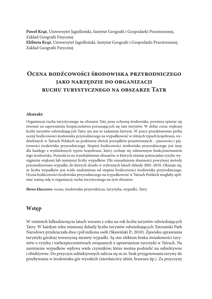 Paweł Krąż, Uniwersytet Jagielloński, Instytut Geografii i Gospodarki Przestrzennej, Zakład Geografii Fizycznej Elżbieta Krąż, Uniwersytet Jagielloński, Instytut Geografii i Gospodarki Przestrzennej, Zakład Geografii Fizycznej Ocena bodźcowości środowiska przyrodniczego jako narzędzie do organizacji ruchu turystycznego na obszarze Tatr Abstrakt: Organizacja ruchu turystycznego na obszarze Tatr, poza ochroną środowiska, powinna opierać się również na zapewnieniu bezpieczeństwa poruszających się tam turystów. W dobie coraz większej liczby turystów odwiedzających Tatry nie jest to zadaniem łatwym. W pracy przedstawiono próbę oceny bodźcowości środowiska przyrodniczego na wypadkowość w różnych typach krajobrazu, wydzielonych w Tatrach Polskich na podstawie dwóch porządków przestrzennych – pasowości i piętrowości środowiska przyrodniczego. Stopień bodźcowości środowiska przyrodniczego jest inny dla każdego z wydzielonych typów krajobrazu, który cechuje się odmiennym funkcjonowaniem tego środowiska. Pozwala to na wyodrębnienie obszarów, w których istnieje potencjalne ryzyko wystąpienia większej lub mniejszej liczby wypadków. Dla uzasadnienia słuszności powyższej metody przeanalizowano wypadki, do których doszło w wybranych latach dekady 2001–2010. Okazuje się, że liczba wypadków jest ściśle uzależniona od stopnia bodźcowości środowiska przyrodniczego. Ocena bodźcowości środowiska przyrodniczego na wypadkowość w Tatrach Polskich mogłaby spełniać ważną rolę w organizacji ruchu turystycznego na tym obszarze. Słowa kluczowe: ocena, środowisko przyrodnicze, turystyka, wypadki, Tatry Wstęp W ostatnich kilkudziesięciu latach wzrasta z roku na rok liczba turystów odwiedzających Tatry. W każdym roku minionej dekady liczba turystów odwiedzających Tatrzański Park Narodowy przekraczała dwa i pół miliona osób (Skawiński P., 2010). Zjawisku uprawiania turystyki górskiej towarzyszą niestety wypadki. Są one efektem braku świadomości turystów o ryzyku i niebezpieczeństwach związanych z uprawianiem turystyki w Tatrach. Na zaistnienie wypadków wpływa wiele czynników, które można podzielić na subiektywne i obiektywne. Do przyczyn subiektywnych zalicza się m.in. brak przygotowania turysty do przebywania w środowisku gór wysokich (niewłaściwy ubiór, brawura itp.). Za przyczyny 136 Współczesne zagadnienia, problemy i wyzwania w badaniach geograficznych t. I obiektywne uznać można zróżnicowane warunki środowiska przyrodniczego, implikujące nieszczęśliwe wypadki (Krąż E., Balon J., 2012). O wypadkach w górach mówi się zwykle niewiele. Zazwyczaj po jakimś nieszczęśliwym wydarzeniu dopiero wybuchają różnego rodzaju dyskusje, tak jak miało to miejsce 28 stycznia 2003 roku, kiedy wydarzył się tragiczny wypadek licealistów z Tych. Dyskusje te często mają charakter bardzo burzliwy i zwykle można o nich usłyszeć w mediach, trwają one pewien czas i cichną. Organizacja ruchu turystycznego w Tatrach, która uwzględniałaby minimalizację liczby wypadków, nie należy dzisiaj do zadań łatwych. Należy zwrócić uwagę, że wszelkiego rodzaju działania podejmowane na obszarze parków narodowych winny być podporządkowane w pierwszej kolejności idei ochrony przyrody (Sondel J., 2006). Tatrzański Park Narodowy, Tatrzańskie Ochotnicze Pogotowie Ratunkowe oraz inne organizacje prowadzą akcję informacyjną, dotyczącą zagrożenia turystów w górach, niestety docierają one jednak do wąskiej grupy turystów. Przy organizacji takiego ruchu turystycznego, którego jednym z priorytetów byłoby minimalizowanie liczby nieszczęśliwych wypadków, należy uwzględniać warunki środowiska przyrodniczego, które mają wpływ na ich zaistnienie. Rozpoznanie czynników środowiskowych mogłoby być jednym z narzędzi przy organizacji i zarządzaniu ruchem turystycznym na obszarze Tatrzańskiego Parku Narodowego. Celem autorów jest ocena bodźcowości warunków środowiska przyrodniczego polskich Tatr, które wpływają na zaistnienie wypadków, a także propozycja jej praktycznego zastosowania w zarządzaniu ruchem turystycznym. Obszar badań Obszar badań obejmuje polską część Tatr o powierzchni około 190 km2. Pod względem fizycznogeograficznym Tatry Polskie są częścią makroregionu, należącego do podprowincji Centralne Karpaty Zachodnie. W obrębie tego makroregionu można wyróżnić dwie mniejsze jednostki (mezoregiony): Tatry Wysokie (Wschodnie) i Tatry Zachodnie (Kondracki J., 1994; Balon J. i in., 1995). Tatry zbudowane są ze skał trzonu krystalicznego (granitoidy, gnejsy i łupki metamorficzne) oraz z okalającej go od północy osłony skał mezozoicznych i paleogeńskich (Książkiewicz M., 1953). Współczesna rzeźba Tatr jest związana z działalnością lodowców w plejstocenie, procesów krasowych oraz współczesnych procesów fluwialnych (Klimaszewski M., 1988). Tatry leżą w strefie umiarkowanej ciepłej, w klimacie przejściowym. Charakterystyczną cechą klimatu Tatr jest jego pionowa zmienność, która warunkuje występowanie pięter klimatycznych (Hess M., 1965). Na obszarze Tatr występuje bogactwo oraz różnorodność zjawisk wodnych (rzeki, jeziora, wodospady, przepływy podziemne itp.), które nagromadzone są na niewielkiej powierzchni i rozwijają się pod wpływem bardzo zróżnicowanego środowiska przyrodniczego (Ziemońska Z., 1974). Budowa geologiczna oraz klimat są w Tatrach głównymi czynnikami glebotwórczymi. Głównymi typami gleb na tym obszarze są gleby inicjalne oraz szkieletowe – położone w wyższych piętrach 137 Sympozjum geograficzne w Gdańsku gór (Skiba S., 1995). Specyficzne warunki środowiska przyrodniczego Tatr pozwalają na występowanie tutaj niepowtarzalnej bioróżnorodności gatunkowej, zarówno w szacie roślinnej, jak i świecie zwierząt (Radwańska-Paryska Z., 1974; Głowaciński Z., 1996). Meto