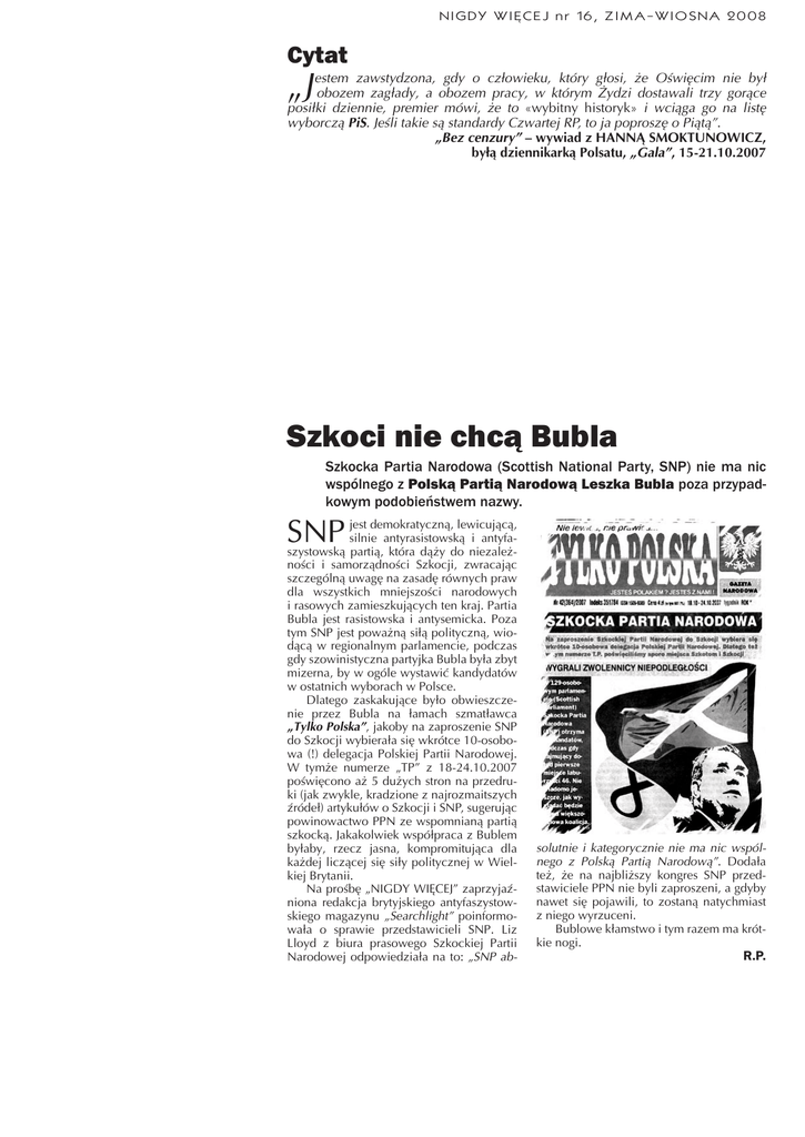 NIGDY WIĘCEJ nr 16, ZIMA-WIOSNA 2008 Cytat „J estem zawstydzona, gdy o człowieku, który głosi, że Oświęcim nie był obozem zagłady, a obozem pracy, w którym Żydzi dostawali trzy gorące posiłki dziennie, premier mówi, że to «wybitny historyk» i wciąga go na listę wyborczą PiS. Jeśli takie są standardy Czwartej RP, to ja poproszę o Piątą”. „Bez cenzury” – wywiad z HANNĄ SMOKTUNOWICZ, byłą dziennikarką Polsatu, „Gala”, 15-21.10.2007 Szkoci nie chcą Bubla Szkocka Partia Narodowa (Scottish National Party, SNP) nie ma nic wspólnego z Polską Partią Narodową Leszka Bubla poza przypadkowym podobieństwem nazwy. SNP jest demokratyczną, lewicującą, silnie antyrasistowską i antyfaszystowską partią, która dąży do niezależności i samorządności Szkocji, zwracając szczególną uwagę na zasadę równych praw dla wszystkich mniejszości narodowych i rasowych zamieszkujących ten kraj. Partia Bubla jest rasistowska i antysemicka. Poza tym SNP jest poważną siłą polityczną, wiodącą w regionalnym parlamencie, podczas gdy szowinistyczna partyjka Bubla była zbyt mizerna, by w ogóle wystawić kandydatów w ostatnich wyborach w Polsce. Dlatego zaskakujące było obwieszczenie przez Bubla na łamach szmatławca „Tylko Polska”, jakoby na zaproszenie SNP do Szkocji wybierała się wkrótce 10-osobowa (!) delegacja Polskiej Partii Narodowej. W tymże numerze „TP” z 18-24.10.2007 poświęcono aż 5 dużych stron na przedruki (jak zwykle, kradzione z najrozmaitszych źródeł) artykułów o Szkocji i SNP, sugerując powinowactwo PPN ze wspomnianą partią szkocką. Jakakolwiek współpraca z Bublem byłaby, rzecz jasna, kompromitująca dla każdej liczącej się siły politycznej w Wielkiej Brytanii. Na prośbę „NIGDY WIĘCEJ” zaprzyjaźniona redakcja brytyjskiego antyfaszystowskiego magazynu „Searchlight” poinformowała o sprawie przedstawicieli SNP. Liz Lloyd z biura prasowego Szkockiej Partii Narodowej odpowiedziała na to: „SNP ab- solutnie i kategorycznie nie ma nic wspólnego z Polską Partią Narodową”. Dodała też, że na najbliższy kongres SNP przedstawiciele PPN nie byli zaproszeni, a gdyby nawet się pojawili, to zostaną natychmiast z niego wyrzuceni. Bublowe kłamstwo i tym razem ma krótkie nogi. R.P.