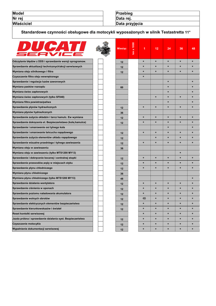 Model Nr rej Właściciel Przebieg Data rej. Data przyjęcia 12 12 Sprawdzenie wizualne przedniego i tylnego zawieszenia 12 Wymiana oleju w zawieszeniu 36 * * * 12 Sprawdzenie zużycia elementów układu napędowego * Sprawdzenie i smarowanie łańcucha napędowego * Sprawdzenie i smarowenie osi tylnego koła 12 Sprawdzenie wolnych obrotów 12 Sprawdzenie elektrycznych elementów bezpieczeństwa 12 Sprawdzenie kierunkowskazów i świateł 12 Reset kontolki serwisowej Jazda próbna i sprawdzenie działania syst. Bezpieczeństwa 12 Czyszczenie motocykla 12 Wypełnienie dokumentacji serwisowej 12 * * * * * * * * * Sprawdzenie poziomu naładowania akumulatora * * * * * * * * * * * 12 * * * * 12 Sprawdzenie ciśnienia w oponach * * * * * * * * * * 48 Sprawdzenie działania wentylatora * * * 36 Wymiana płynu chłodniczego (tylko MTS1200 MY13) * * * * * * * * * * 12 Wymiana płynu chłodniczego * * * 12 Sprawdzenie płynu chłodniczego * * * * * * * * * * 12 Sprawdzenie przewodów,węży w miejscach styku * * * Sprawdzenie i dokręcenie bocznej i centralnej stopki * * * * * * 8 * * * Wymiana oleju w zawieszeniu (tylko MTS1200 MY13) * * * * * * 12 Sprawdzenie dokręcenia el. Bezpieczeństawa (koła,hamulce) * 36 Sprawdzenie zużycia okładzin i tarcz hamulc. Ew wymiana * * 12 Wymiana płynów hydraulicznych * * Sprawdzenie płynów hydraulicznych * Wymiana filtra powietrza/paliwa 48 * * * * * * * Wymiana świec zapłonowych (tylko SF848) * 60 Wymiana świec zapłonowych * Wymiana pasków rozrządu * * Sprawdzenie i regulacja luzów zaworowych 36 * * * 12 Czyszczenie filtra oleju wewnętrznego * * * Wymiana oleju silnikowego i filtra * * * * * * 12 24 * * * * * * 12 Sprawdzenie aktualizacji technicznych/akcji serwisowych 12 * * * Odczytanie błędów z DDS i sprawdzenie wersji oprogramow. 1 * * * * Miesiąc km x 1000 Standardowe czynności obsługowe dla motocykli wyposażonych w silnik Testastretta 11° 24 12 Smarowanie dzwigni sterujących Sprawdzenie płynu chłodniczego 12 Wymiana płynu chłodniczego 36 * * * * * Sprawdzenie działania systemu dopalnia Sprawdzenie działania wentylatora 12 Sprawdzenie ciśnienia w oponach 12 Sprawdzenie poziomu naładowania akumulatora 12 Sprawdzenie elektrycznych elementów bezpieczeństwa 12 Sprawdzenie kierunkowskazów i świateł 12 Reset kontolki serwisowej Jazda próbna i sprawdzenie działania syst. Bezpieczeństwa 12 Czyszczenie motocykla 12 Wypełnienie dokumentacji serwisowej 12 * * * * * * * * * * 12 Sprawdzenie przewodów,węży w miejscach styku * * * * * * * * * * Sprawdzenie wolnych obrotów * * * * * 36 Sprawdzenie dokręcenia wachacza,ramy,silmika * * * * * * * * * 12 Wymiana oleju w zawieszeniu * * * * * 12 Sprawdzenie wizualne przedniego i tylnego zawieszenia * * * * * * * * * * 24 Sprawdzenie wizualne przewodów paliwowych * * Sprawdzenie łożysk główki ramy/ew wymiana * * * * * 12 Sprawdzenie dokręcenia wymiennika ciepła * * * * * * * * * 12 Sprawdzenie dokręcenia uchwytów tłumika * * 12 Sprawdzenie/napęcia i smarowanie łańcucha napędowego * * * * * 12 Sprawdzenie zuycia ślizgaczy łąńcucha napędowego * * * * * * * * * Sprawdzenie dokręcenia śrub zębatek * * * * * Sprawdzenie tłumika tylnej piasty * * * * * 12 Sprawdzenie łożysk przedniej i tylnej piasty * * 12 Sprawdzenie dokręcenia kół * 12 Sprawdzenie dokręcenia el. Bezpieczeństawa (koła,hamulce) * * * 24 Sprawdzenie zużycia okładzin i tarcz hamulc. Ew wymiana * 12 Wymiana płynów hydraulicznych * * * Sprawdzenie płynów hydraulicznych Sprawdzenie i smarowenie osi tylnego koła * * * Sprawdzenie dokrcenia pokrywy sprzęgła Sprawdzenie dokręcnia miski olejowej * * * * * * * * * * * * * * Wymiana filtra powietrza/paliwa * * * * * Czyszczenie filtra powietrza * * * * * * * Sprawdzenie zużycia elementów rozrżądu oraz łańcucha Wymiana świec zapłonowych * * * * Sprawdzenie i regulacja luzów zaworowych 48 * * * * * * * * * * * * * * 12 Wymiana filtra wewnętznego 36 * * * 12 Wymiana oleju silnikowego i filtra 24 * * * * * 12 12 * * * Odczytanie błędów z DDS i sprawdzenie wersji oprogramow. Sprawdzenie aktualizacji technicznych/akcji serwisowych 1 * * * Miesiąc km x 1000 Model Przebieg Nr rej Data rej. Właściciel Data przyjęcia Standardowe czynności obsługowe dla motocykli wyposażonych w silnik Superquadro Model Nr rej Właściciel Przebieg Data rej. Data przyjęcia 12 Sprawdzenie dokręcenia el. Bezpieczeństawa (koła,hamulce) 12 Sprawdzenie łożysk główki ramy i piast kół 24 Sprawdzenie tłumika tylnej piasty 24 * Sprawdzenie tarczek sprzęgłowych/kosz ew.wymiana 36 Sprawdzenie działania wentylatora 12 Sprawdzenie stanu przewodów paliwowych 12 Smarowanie elementów obrotowych 12 Sprawdzenie ciśnienia w oponach 12 Sprawdzenie poziomu naładowania akumulatora 12 * * * 12 Wymiana płynu chłodniczego * * * * * * * * * * * * 12 Sprawdzenie płynu chłodniczego Sprawdzenie elektrycznych elementów bezpieczeństwa 12 12 Reset kontolki serwisowej Jazda próbna i sprawdzenie działania syst. Bezpieczeństwa 12 Czyszczenie motocykla 12 Wypełnienie dokumentacji serwisowej 12 * * * * * * Sprawdzenie/regulacja układu wtryskowego Sprawdzenie kierunkowskazów i świateł * * * 12 Sprawdzenie przewodów,węży w miejscach styku * * * 36 Sprawdzenie i dokręcenie bocznej i centralnej stopki * * * * * * * * * * * * 12 Wymiana oleju w zawieszeniu * * * 12 Sprawdzenie wizualne przedniego i tylnego zawieszenia * * * * * 12 Sprawdzenie zużycia elementów układu napędowego * * * Sprawdzenie i smarowenie osi tylnego koła Sprawdzenie i smarowanie łańcucha napędowego * * * * * * * * * * * 12 Sprawdzenie zużycia okałdzin i tarcz hamulc. Ew wymiana * * * * * * * * * * * * * * * * 12 Sprawdzenie i smarowanie linek gazu/startu * 36 Sprawdzenie i regulacja dzwigni hamulca i sprzęgła * * * * 12 Wymiana płynów hydraulicznych * 24 Sprawdzenie płynów hydraulicznych * * Wymiana filtra powietrza/paliwa * * * * * * * * * * * 24 Czyszczenie/Sprawdz