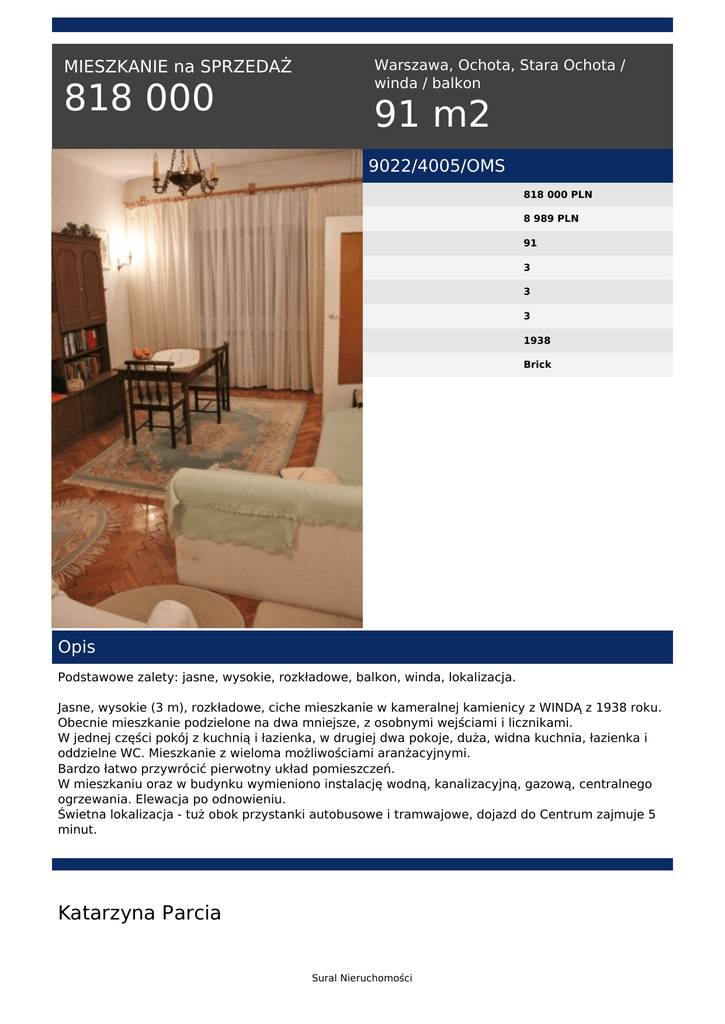 MIESZKANIE na SPRZEDAŻ 818 000 Warszawa, Ochota, Stara Ochota / winda / balkon 91 m2 9022/4005/OMS 818 000 PLN 8 989 PLN 91 3 3 3 1938 Brick Opis Podstawowe zalety: jasne, wysokie, rozkładowe, balkon, winda, lokalizacja. Jasne, wysokie (3 m), rozkładowe, ciche mieszkanie w kameralnej kamienicy z WINDĄ z 1938 roku. Obecnie mieszkanie podzielone na dwa mniejsze, z osobnymi wejściami i licznikami. W jednej części pokój z kuchnią i łazienka, w drugiej dwa pokoje, duża, widna kuchnia, łazienka i oddzielne WC. Mieszkanie z wieloma możliwościami aranżacyjnymi. Bardzo łatwo przywrócić pierwotny układ pomieszczeń. W mieszkaniu oraz w budynku wymieniono instalację wodną, kanalizacyjną, gazową, centralnego ogrzewania. Elewacja po odnowieniu. Świetna lokalizacja - tuż obok przystanki autobusowe i tramwajowe, dojazd do Centrum zajmuje 5 minut. Katarzyna Parcia Sural Nieruchomości tel. 695255876 tel. 224066750 email: [email protected] Sural Nieruchomości Powered by TCPDF (www.tcpdf.org)