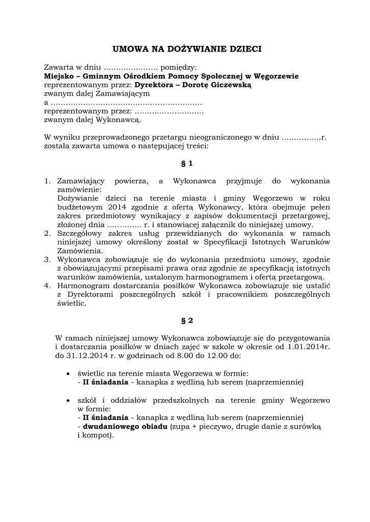 UMOWA NA DOŻYWIANIE DZIECI Zawarta w dniu …………………. pomiędzy: Miejsko – Gminnym Ośrodkiem Pomocy Społecznej w Węgorzewie reprezentowanym przez: Dyrektora – Dorotę Giczewską zwanym dalej Zamawiającym a ……………………………………………………. reprezentowanym przez: ………………………. zwanym dalej Wykonawcą. W wyniku przeprowadzonego przetargu nieograniczonego w dniu …………….r. została zawarta umowa o następującej treści: §1 1. Zamawiający powierza, a Wykonawca przyjmuje do wykonania zamówienie: Dożywianie dzieci na terenie miasta i gminy Węgorzewo w roku budżetowym 2014 zgodnie z ofertą Wykonawcy, która obejmuje pełen zakres przedmiotowy wynikający z zapisów dokumentacji przetargowej, złożonej dnia ………….. r. i stanowiącej załącznik do niniejszej umowy. 2. Szczegółowy zakres usług przewidzianych do wykonania w ramach niniejszej umowy określony został w Specyfikacji Istotnych Warunków Zamówienia. 3. Wykonawca zobowiązuje się do wykonania przedmiotu umowy, zgodnie z obowiązującymi przepisami prawa oraz zgodnie ze specyfikacją istotnych warunków zamówienia, ustalonym harmonogramem i ofertą przetargową. 4. Harmonogram dostarczania posiłków Wykonawca zobowiązuje się ustalić z Dyrektorami poszczególnych szkół i pracownikiem poszczególnych świetlic. §2 W ramach niniejszej umowy Wykonawca zobowiązuje się do przygotowania i dostarczania posiłków w dniach zajęć w szkole w okresie od 1.01.2014r. do 31.12.2014 r. w godzinach od 8.00 do 12.00 do: świetlic na terenie miasta Węgorzewa w formie: - II śniadania - kanapka z wędliną lub serem (naprzemiennie) szkół i oddziałów przedszkolnych na terenie gminy Węgorzewo w formie: - II śniadania - kanapka z wędliną lub serem (naprzemiennie) - dwudaniowego obiadu (zupa + pieczywo, drugie danie z surówką i kompot). Prognozowana dzienna ilość posiłków dla poszczególnych szkół i przedszkoli oraz świetlic: Szkoła Podstawowa w Perłach – 50 posiłki Zespół Szkół w Radziejach(szkoła podstawowa i gimnazjum)– 40 posiłki Szkoła Podstawowa w Węgielsztynie – 25 posiłków Oddział przedszkolny przy szkole w Perłach – 9 posiłków Oddział przedszkolny przy szkole w Radziejach – 5 posiłków Oddział przedszkolny przy szkole w Węgielsztynie – 5 posiłków Świetlica Socjoterapeutyczna „DOM” przy Szkole Podstawowej nr 1 w Węgorzewie – 25 posiłków Ognisko Wychowawcze „Przyjazny Kącik” przy Szkole Podstawowej nr 2 w Węgorzewie – 17 posiłków §3 2. 3. 4. 5. 6. 1. Zamawiający zobowiązuje się do zapłaty wynagrodzenia za dostarczone posiłki według ceny jednostkowej określonej w ofercie Wykonawcy tj. - w szkole za cenę brutto ………….. (słownie………………….……) za jeden posiłek (II śniadanie + obiad); - w przedszkolu za cenę brutto ……… (słownie:…………………) za jeden posiłek (II śniadanie + obiad) oraz - w świetlicach za cenę brutto …………..(słownie: ………………..)za jeden posiłek (II śniadanie) wraz z wszystkimi kosztami z nimi związanymi (przygotowanie, dowóz, itp.). Maksymalna wartość umowy wynosi …………………… zł brutto (słownie: ………………………………………………………………………………) i obejmuje całkowity koszt niezbędny do zrealizowania zamówienia. Wynagrodzenie należne Wykonawcy jest iloczynem rzeczywiście dostarczonych posiłków i określonych w umowie cen jednostkowych. Zamawiający dopuszcza zmianę wartości umowy do wysokości 30% (art. 67 ust. 1 pkt 6) w sytuacji, gdy wzrośnie liczba dożywianych dzieci w świetlicach, szkołach lub przedszkolach objętych w/w zamówieniem. Posiłki powinny być dostarczane w specjalistycznych termosach gwarantujących utrzymanie odpowiedniej temperatury oraz jakości i higieny przewożonych potraw. Wykonawca jest zobowiązany zapewnić naczynia jednorazowego użytku, w których będą spożywane dostarczone posiłki oraz opakowanie kanapki (II śniadanie). Koszt tych naczyń i opakowania kanapki jest uwzględniony w cenie jednostkowej określonej w § 3 ust. 1. Wykonawca zobowiązany jest dbać o czystość termosów oraz do odbierania resztek posiłków i zużytych naczyń jednorazowego użytku. §4 1. Wykonawca zobowiązany jest dostarczać posiłki urozmaicone, o wysokiej wartości odżywczej, przygotowane zgodnie z zasadami żywienia dzieci, smaczne i atrakcyjne pod względem organoleptycznym. Urozmaicenie posiłków będzie dotyczyć: doboru posiłków, barwy, smaku, zapachu, konsystencji i sposobu przyrządzania potraw. 2. Przy planowaniu posiłków Wykonawca uwzględniać będzie zlecaną wartość energetyczną dla dzieci w wieku szkolnym i przedszkolnym oraz normy produktów dla każdej z grup, będzie brać również pod uwagę wartość odżywczą przygotowanych posiłków. 3. Każdy posiłek powinien zawierać odpowiednią gramaturę dla poszczególnych grup dożywianych dzieci. Posiłek do szkół: II śniadanie - bułka 80 g z wędliną lub serem naprzemiennie (każda kanapka musi być opakowana np. owinięta folią spożywczą, w woreczku śniadaniowym) Dwudaniowy obiad: - jedna porcja zupy musi posiadać objętość min. 300 ml + pieczywo 100g, - porcja drugiego dania musi posiadać gramaturę nie mniejszą niż 400 g: * w tym mięso i surówka po 100 gram (co najmniej raz w tygodniu ryba) oraz ziemniaki lub zamiennik (ryż, kasza, makaron, itp.) 200 gram; * jeden raz w tygodniu drugie danie mogą stanowić pierogi, naleśniki, kopytka, gołąbki lub krokiety o wadze 300 gram; * do każdego obiadu musi być kompot lub napój 200 ml; * kaloryczność każdego posiłku nie może być mniejsza niż 800 kcal. Posiłek do przedszkoli: II śniadanie - bułka 45 g z wędliną lub serem naprzemiennie (każda kanapka musi być opakowana np. owinięta folią spożywczą, w woreczku śniadaniowym) Dwudaniowy obiad: - jedn