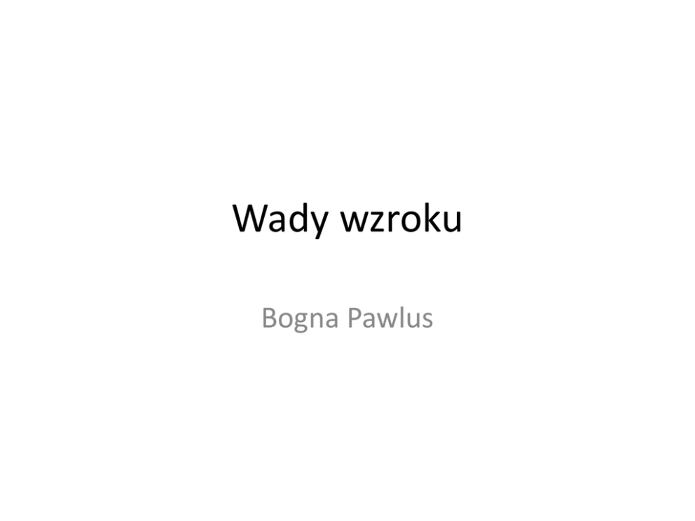 Wady wzroku Bogna Pawlus Jak działa ludzkie oko? • 1) Na początku światło przechodzi przez rogówkę (czyli przednią część twardówki) • 2) Wpada do oka przez źrenicę • 3) Przechodzi przez soczewkę, która skupia promienie na siatkówce • 4) Na siatkówce powstaje obraz, który jest przekazywany do mózgu Bardzo ogólna budowa oka Zdrowe oko Krótkowzroczność • Najczęstszy powód: za krótka długość gałki ocznej; • Promienie świetlne skupiają się przed siatkówką, Oko krótkowidza Nadwzroczność • Powód: zbyt krótka gałka oczna • Promienie świetlne skupiają się za siatkówką • W wyniku akomodacji oka (napięcia mięśni ocznych) dalekowidz może dobrze widzieć bliskie rzeczy Oko dalekowidza Astygmatyzm • Lustro astygmatyczne