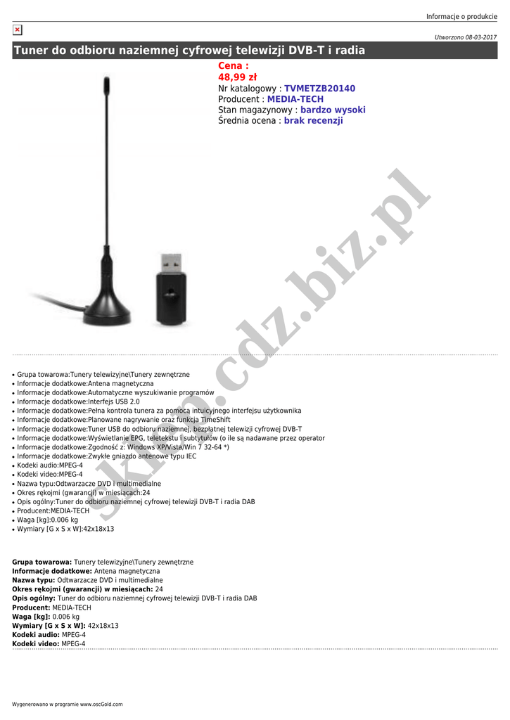 Informacje o produkcie Utworzono 08-03-2017 Tuner do odbioru naziemnej cyfrowej telewizji DVB-T i radia Cena : 48,99 zł ● ● ● ● ● ● ● ● ● ● ● ● ● ● ● .c ● Grupa towarowa:Tunery telewizyjne\Tunery zewnętrzne Informacje dodatkowe:Antena magnetyczna Informacje dodatkowe:Automatyczne wyszukiwanie programów Informacje dodatkowe:Interfejs USB 2.0 Informacje dodatkowe:Pełna kontrola tunera za pomocą intuicyjnego interfejsu użytkownika Informacje dodatkowe:Planowane nagrywanie oraz funkcja TimeShift Informacje dodatkowe:Tuner USB do odbioru naziemnej, bezpłatnej telewizji cyfrowej DVB-T Informacje dodatkowe:Wyświetlanie EPG, teletekstu i subtytułów (o ile są nadawane przez operator Informacje dodatkowe:Zgodność z: Windows XP/Vista/Win 7 32-64 *) Informacje dodatkowe:Zwykłe gniazdo antenowe typu IEC Kodeki audio:MPEG-4 Kodeki video:MPEG-4 Nazwa typu:Odtwarzacze DVD i multimedialne Okres rękojmi (gwarancji) w miesiącach:24 Opis ogólny:Tuner do odbioru naziemnej cyfrowej telewizji DVB-T i radia DAB Producent:MEDIA-TECH Waga [kg]:0.006 kg Wymiary [G x S x W]:42x18x13 le p ● sk ● dz .b iz .p l Nr katalogowy : TVMETZB20140 Producent : MEDIA-TECH Stan magazynowy : bardzo wysoki Średnia ocena : brak recenzji Grupa towarowa: Tunery telewizyjne\Tunery zewnętrzne Informacje dodatkowe: Antena magnetyczna Nazwa typu: Odtwarzacze DVD i multimedialne Okres rękojmi (gwarancji) w miesiącach: 24 Opis ogólny: Tuner do odbioru naziemnej cyfrowej telewizji DVB-T i radia DAB Producent: MEDIA-TECH Waga [kg]: 0.006 kg Wymiary [G x S x W]: 42x18x13 Kodeki audio: MPEG-4 Kodeki video: MPEG-4 Wygenerowano w programie www.oscGold.com