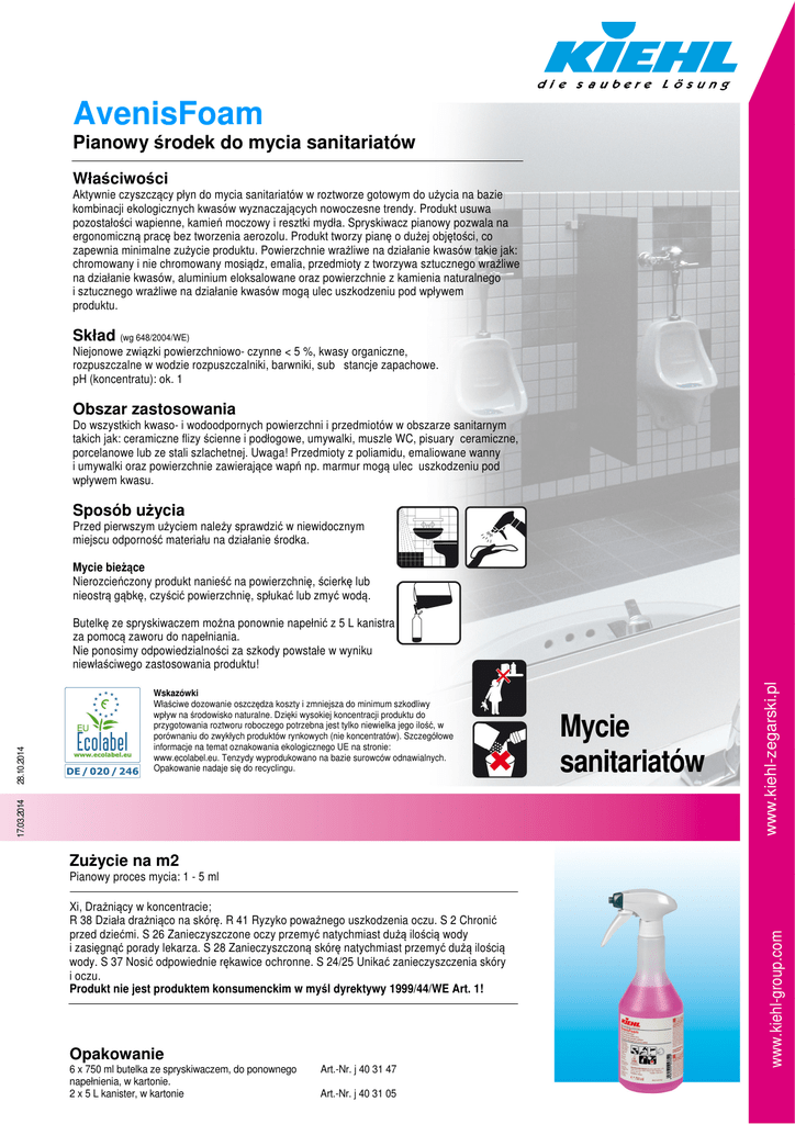 AvenisFoam Pianowy środek do mycia sanitariatów Właściwości Aktywnie czyszczący płyn do mycia sanitariatów w roztworze gotowym do użycia na bazie kombinacji ekologicznych kwasów wyznaczających nowoczesne trendy. Produkt usuwa pozostałości wapienne, kamień moczowy i resztki mydła. Spryskiwacz pianowy pozwala na ergonomiczną pracę bez tworzenia aerozolu. Produkt tworzy pianę o dużej objętości, co zapewnia minimalne zużycie produktu. Powierzchnie wrażliwe na działanie kwasów takie jak: chromowany i nie chromowany mosiądz, emalia, przedmioty z tworzywa sztucznego wrażliwe na działanie kwasów, aluminium eloksalowane oraz powierzchnie z kamienia naturalnego i sztucznego wrażliwe na działanie kwasów mogą ulec uszkodzeniu pod wpływem produktu. Skład (wg 648/2004/WE) Niejonowe związki powierzchniowo- czynne < 5 %, kwasy organiczne, rozpuszczalne w wodzie rozpuszczalniki, barwniki, sub stancje zapachowe. pH (koncentratu): ok. 1 Obszar zastosowania Do wszystkich kwaso- i wodoodpornych powierzchni i przedmiotów w obszarze sanitarnym takich jak: ceramiczne flizy ścienne i podłogowe, umywalki, muszle WC, pisuary ceramiczne, porcelanowe lub ze stali szlachetnej. Uwaga! Przedmioty z poliamidu, emaliowane wanny i umywalki oraz powierzchnie zawierające wapń np. marmur mogą ulec uszkodzeniu pod wpływem kwasu. Sposób użycia Przed pierwszym użyciem należy sprawdzić w niewidocznym miejscu odporność materiału na działanie środka. Mycie bieżące Nierozcieńczony produkt nanieść na powierzchnię, ścierkę lub nieostrą gąbkę, czyścić powierzchnię, spłukać lub zmyć wodą. Mycie sanitariatów www.kiehl-zegarski.pl Wskazówki Właściwe dozowanie oszczędza koszty i zmniejsza do minimum szkodliwy wpływ na środowisko naturalne. Dzięki wysokiej koncentracji produktu do przygotowania roztworu roboczego potrzebna jest tylko niewielka jego ilość, w porównaniu do zwykłych produktów rynkowych (nie koncentratów). Szczegółowe informacje na temat oznakowania ekologicznego UE na stronie: www.ecolabel.eu. Tenzydy wyprodukowano na bazie surowców odnawialnych. Opakowanie nadaje się do recyclingu. 17.03.2014 Zużycie na m2 Pianowy proces mycia: 1 - 5 ml Xi, Drażniący w koncentracie; R 38 Działa drażniąco na skórę. R 41 Ryzyko poważnego uszkodzenia oczu. S 2 Chronić przed dziećmi. S 26 Zanieczyszczone oczy przemyć natychmiast dużą ilością wody i zasięgnąć porady lekarza. S 28 Zanieczyszczoną skórę natychmiast przemyć dużą ilością wody. S 37 Nosić odpowiednie rękawice ochronne. S 24/25 Unikać zanieczyszczenia skóry i oczu. Produkt nie jest produktem konsumenckim w myśl dyrektywy 1999/44/WE Art. 1! Opakowanie 6 x 750 ml butelka ze spryskiwaczem, do ponownego napełnienia, w kartonie. 2 x 5 L kanister, w kartonie Art.-Nr. j 40 31 47 Art.-Nr. j 40 31 05 www.kiehl-group.com 28.10.2014 Butelkę ze spryskiwaczem można ponownie napełnić z 5 L kanistra za pomocą zaworu do napełniania. Nie ponosimy odpowiedzialności za szkody powstałe w wyniku niewłaściwego zastosowania produktu!