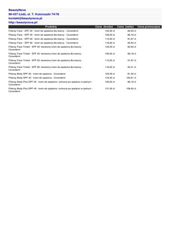 BeautyNova 90-437 Łódź, ul. T. Kościuszki 74/78 [email protected] http://beautynova.pl/ Produkty Cena (brutto) Cena (netto) Filteray Face - SPF 20 - krem do opalania dla twarzy - Coverderm 102,00 zł 82,93 zł Filteray Face - SPF 40 - krem do opalania dla twarzy - Coverderm 106,00 zł 86,18 zł Filteray Face - SPF 60 - krem do opalania dla twarzy - Coverderm 113,00 zł 91,87 zł Filteray Face - SPF 80 - krem do opalania dla twarzy - Coverderm 118,00 zł 95,94 zł Filteray Face Tinted - SPF 20 -barwiony krem do opalania dla twarzy Coverderm 102,00 zł 82,93 zł Filteray Face Tinted - SPF 40 -barwiony krem do opalania dla twarzy Coverderm 106,00 zł 86,18 zł Filteray Face Tinted - SPF 60 -barwiony krem do opalania dla twarzy Coverderm 113,00 zł 91,87 zł Filteray Face Tinted - SPF 80 -barwiony krem do opalania dla twarzy Coverderm 116,00 zł 94,31 zł Filteray Body SPF 20 - krem do opalania - Coverderm 100,00 zł 81,30 zł Filteray Body SPF 40 - krem do opalania - Coverderm 124,00 zł 100,81 zł Filteray Body Plus SPF 20 - krem do opalania i ochrona po opalaniu w jednym Coverderm 106,00 zł 86,18 zł Filteray Body Plus SPF 40 - krem do opalania i ochrona po opalaniu w jednym Coverderm 131,00 zł 106,50 zł Cena promocyjna