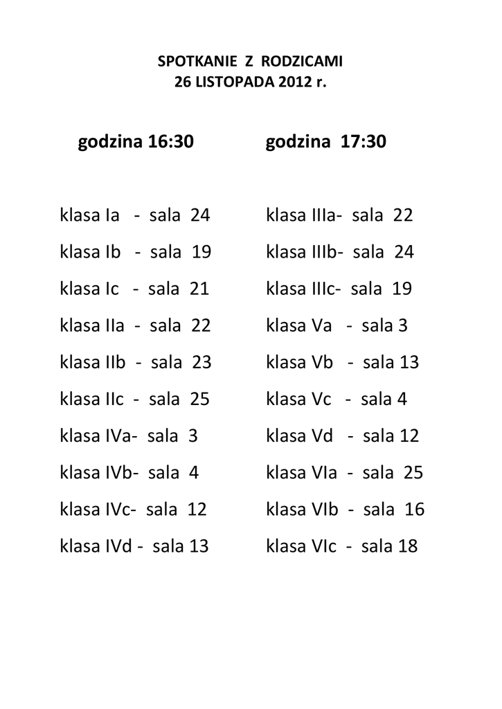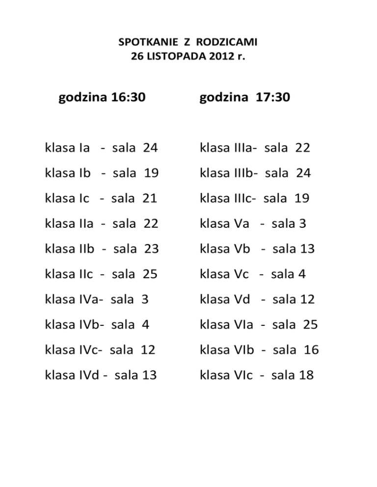 godzina 16:30 klasa Ia - sala 24 klasa Ib - sala 19 klasa Ic