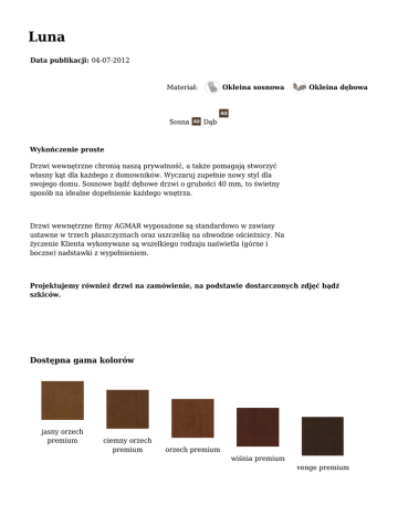Luna Data publikacji: 04-07-2012 Okleina sosnowa Materiał: Sosna Okleina dębowa Dąb Wykończenie proste Drzwi wewnętrzne chronią naszą prywatność, a także pomagają stworzyć własny kąt dla każdego z domowników. Wyczaruj zupełnie nowy styl dla swojego domu. Sosnowe bądź dębowe drzwi o grubości 40 mm, to świetny sposób na idealne dopełnienie każdego wnętrza. Drzwi wewnętrzne firmy AGMAR wyposażone są standardowo w zawiasy ustawne w trzech płaszczyznach oraz uszczelkę na obwodzie ościeżnicy. Na życzenie Klienta wykonywane są wszelkiego rodzaju naświetla (górne i boczne) nadstawki z wypełnieniem. Projektujemy również drzwi na zamówienie, na podstawie dostarczonych zdjęć bądź szkiców. Dostępna gama kolorów jasny orzech premium ciemny orzech premium orzech premium wiśnia premium venge premium palisander premium afromozja premium teak premium jasny dąb premium ciemny dąb premium złoty dąb premium dąb premium Przekrój drzwi wewnętrznych zawierający następujące elementy: ● ● ● ● ● ● ramiak z drewna klejonego warstwowo grubości 40 mm naturalny obłóg sosnowy lub dębowy kaseton ozdobny uszczelka ościeżnica regulowana listwa regulacyjna; zakres regulacji 15 mm Rozkład drzwi prawych i lewych N in ie js z y sc hemat przedstawia sposób otwierania się drzwi wewnętrznych prawych oraz lewych. Dane techniczne Opis Materiał Drzwi wewnętrzne przylgowe grub. 40 mm sosna, dąb Konstrukcja Wykończenie Wymiary Szklenie ramowo-płycinowa, ościeżnica i ramiak skrzydła wykonane z drewna klejonego warstwowo i naprzemiennie, oklejane płytą warstwową, ościeżnica o wymiarach 105 x 60 mm, ramiak o grubości 40 mm, istnieje możliwość wykonania za dopłatą ościeżnicy regulowanej o rozmiarze pełnej szerokości muru system pięciopowłokowy; impregnacja, podkładowanie, izolant, dwukrotne malowanie lakierem nawierzchniowym, nakładanie odbywa się metodą hydrodynamiczną farbami transparentnymi (lazurami) w 12 kolorach lub farbami z palety RAL (kryjącymi) typowe 2070 mm x 920 mm oraz wymiary niestandardowe, bez dopłat, do wysokości drzwi 2100 mm i szerokości 920 mm szkło ornamentowe w różnych wzorach i odcieniach oraz matowe bezpieczne (klejone) w drzwiach istnieje możliwość zamiany płyciny drewnianej na pakiet szybowy i odwrotnie, w drzwiach typu WC istnieje możliwość wykonania otworów wentylacyjnych, drzwi wewnętrzne mogą być wykonane również jako przesuwne lub wahadłowe Wyposażenie standardowe Wyposażenie dodatkowe, za dopłatą Wymiar wkładki Opcje rozbudowy dwa zawiasy regulowane w trzech płaszczyznach, uszczelka na obwodzie ościeżnicy, jeden zamek (klucz, wkładka, blokada WC) lub opcja bez zamka (otwór tylko pod klamkę), szkło ornamentowe produkcji polskiej (delta PL, deszczyk, kora, kornik, chinchila) klamki, szyldy, pochwyty, tuleje wentylacyjne WC, nakładki na zawiasy 31 / 36 dostawki boczne; imitacje lub otwierane, naświetla górne