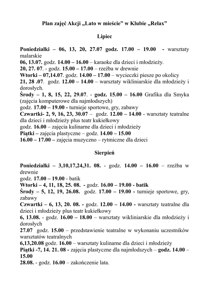 Plan zajęć Akcji „Lato w mieście” w Klubie „Relax” Lipiec Poniedziałki – 06, 13, 20, 27.07 godz. 17.00 – 19.00 - warsztaty malarskie 06, 13.07. godz. 14.00 – 16.00 – karaoke dla dzieci i młodzieży. 20, 27. 07. - godz. 15.00 – 17.00 – rzeźba w drewnie Wtorki – 07,14.07. godz. 14.00 – 17.00 – wycieczki piesze po okolicy 21, 28 .07. godz. 12.00 – 14.00 – warsztaty wikliniarskie dla młodzieży i dorosłych. Środy – 1, 8, 15, 22, 29.07. - godz. 15.00 – 16.00 Grafika dla Smyka (zajęcia komputerowe dla najmłodszych) godz. 17.00 – 19.00 - turnieje sportowe, gry, zabawy Czwartki- 2, 9, 16, 23, 30.07 – godz. 12.00 – 14.00 - warsztaty teatralne dla dzieci i młodzieży plus teatr kukiełkowy godz. 16.00 – zajęcia kulinarne dla dzieci i młodzieży Piątki – zajęcia plastyczne – godz. 14.00 – 15.00 16.00 – 17.00 – zajęcia muzyczno – rytmiczne dla dzieci Sierpień Poniedziałki – 3,10,17,24,31. 08. - godz. 14.00 – 16.00 – rzeźba w drewnie godz. 17.00 – 19.00 - batik Wtorki – 4, 11, 18, 25. 08. - godz. 16.00 – 19.00 - batik Środy – 5, 12, 19, 26.08. godz. 17.00 – 19.00 - turnieje sportowe, gry, zabawy Czwartki – 6, 13, 20. 08. - godz. 12.00 – 14.00 - warsztaty teatralne dla dzieci i młodzieży plus teatr kukiełkowy 6, 13.08. - godz. 16.00 – 18.00 – warsztaty wikliniarskie dla młodzieży i dorosłych 27.07 godz. 15.00 – przedstawienie teatralne w wykonaniu uczestników warsztatów teatralnych 6,13,20.08 godz. 16.00 – warsztaty kulinarne dla dzieci i młodzieży Piątki -7, 14. 21. 08 - zajęcia plastyczne dla najmłodszych – godz. 14.00 – 15.00 28.08. - godz. 16.00 – zakończenie lata.