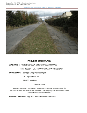 Załącznik nr 1 do SIWZ – charakterystyka obiektu Postępowanie nr ZDP. 2000/AZ/07/2016 „ Przebudowa drogi powiatowej nr 3226D - ul. Nowy Świat w Kłodzku” PROJEKT BUDOWLANY ZADANIE : PRZEBUDOWA DROGI POWIATOWEJ NR 3226D – UL. NOWY ŚWIAT W KŁODZKU. INWESTOR: Zarząd Dróg Powiatowych Ul. Objazdowa 20 57-300 Kłodzko OŚWIADCZENIE NA PODSTAWIE ART. 20 USTAWY „PRAWO BUDOWLANE” OŚWIADCZAM, ŻE PROJEKT ZOSTAŁ SPORZĄDZONY ZGODNIE Z OBOWIĄZUĄCYMI PRZEPISAMI ORAZ ZASADAMI WIEDZY TECHNICZNEJ OPRACOWANIE: mgr inż. Aleksander Ruczkowski 1 Załącznik nr 1 do SIWZ – charakterystyka obiektu Postępowanie nr ZDP. 2000/AZ/07/2016 „ Przebudowa drogi powiatowej nr 3226D - ul. Nowy Świat w Kłodzku” OPRACOWANIE ZAWIERA : - Opis techniczny - mapy ewidencyjne i wypisy z rejestru gruntów Część rysunkową : - projekt zagospodarowania terenu Skala 1: 500, rys. nr 1 - przekrój konstrukcyjny A-A Skala 1: 25, rys. nr 2 - przekrój konstrukcyjny B-B Skala 1: 25, rys. nr 3 - przekrój konstrukcyjny C-C Skala 1: 25, rys. nr 4 2 Załącznik nr 1 do SIWZ – charakterystyka obiektu Postępowanie nr ZDP. 2000/AZ/07/2016 „ Przebudowa drogi powiatowej nr 3226D - ul. Nowy Świat w Kłodzku” OPIS TECHNICZNY 1. Opis przedmiotu zamówienia Projekt przewiduje wykonanie przebudowy drogi powiatowej nr 3226D ulica Nowy Świat i skrzyżowanie z ul. Półwiejską w Kłodzku w km 8+348 – 8+990 w lokalnym kilometrażu projektu [ HM 0+00 do 5+54 ] o łącznej długości 554 m, wraz ze wzmocnieniem istniejącej podbudowy, ułożeniem nowej nawierzchni z masy mineralno-asfaltowej, przebudową zjazdów, chodników i elementów odwodnienia. Przebudowa zaplanowana jest w obrębie istniejącego pasa drogowego - działka nr 7 obręb Twierdza AM 3, działka nr 20 obręb Twierdza AM 2 i działki nr 105 obręb Twierdza AM 1 będących własnością Powiatu Kłodzkiego. 2. Projektowane zagospodarowanie terenu. Przebudowa drogi zaprojektowana jest po istniejącym terenie i na wysokości zbliżonej do rzędnych terenu z niezbędną korektą łuków poziomych i pionowych. Przebudowie podlegać będzie istniejąca jezdnia, zjazdy do posesji (w obrębie pasa drogowego), chodniki oraz istniejące elementy odwodnienia – studzienki ściekowe i przykanaliki. 3. ZAKRES OPRACOWANIA Projekt niniejszy obejmuje swoim zakresem następujące zagadnienia: a. Rozbiórkę istniejącej nawierzchni bitumicznej wraz z rozbiórką krawężników, obrzeży i nawierzchni na chodnikach b. Wykonanie nowych studzienek ściekowych w miejscu starych c. Wykonanie koryta o głębokości 20 cm e. Wykonanie dolnej warstwy podbudowy z mieszanki kamiennej o grubości 5- 20 cm f. Wykonanie podbudowy z betonu o grubości 20 cm g. Wykonanie podbudowy z kruszyw łamanych na chodnikach o grubości 10 - 20 cm h. Wykonanie nawierzchni z masy mineralno-asfaltowej grubość 6 cm warstwa wiążąca i. Nawierzchnia z masy mineralno-asfaltowej grubość 4 cm warstwa ścieralna ii. Ścieki z kostki kamiennej rozbiórkowej 9-11 cm na ławie betonowej j. Ułożenie krawężników betonowych i kamiennych na ławie betonowej z oporem k. Ułożenie obrzeży betonowych na ławie betonowej l. Wykonanie nawierzchni na chodnikach z kostki betonowej grubości 8 cm, kolorowej m. Wykonanie oznakowania poziomego grubowarstwowego. 4. STAN ISTNIEJĄCY 3 Załącznik nr 1 do SIWZ – charakterystyka obiektu Postępowanie nr ZDP. 2000/AZ/07/2016 „ Przebudowa drogi powiatowej nr 3226D - ul. Nowy Świat w Kłodzku” Projektowany odcinek drogi na długości 554 m rozpoczyna się w km 0+000 za skrzyżowaniem z ul. Widok, przebiega w kierunku ul. Noworudzkiej i kończy się na skrzyżowaniu z ta ulicą. Droga na całym odcinku w : • posiada nawierzchnię z betonu asfaltowego w złym stanie technicznym. W wielu miejscach istniejąca droga ma zniszczoną nawierzchnię, elementy odwodnienia zamulone lub brak. Występują podłużne koleiny i poprzeczne nierówności. Posiada przekrój poprzeczny uliczny i ma przebieg stokowy na całej długości. Chodniki z płytek betonowych w złym stanie technicznym. Istniejąca kanalizacja deszczowa wymaga lokalnej przebudowy głównie w postaci studzienek ściekowych. Zjazdy na przyległe działki wymagają przebudowy. Urządzenia inne : studnie kanalizacyjne, studnie telekomunikacyjne wymagają regulacji do nowoprojektowanych rzędnych nawierzchni. 5. ZAŁOŻENIA PROJEKTOWE Przebudowa drogi na całej długości przebiega w granicach istniejącego pasa drogowego. Opracowanie przebiega w obrębie działek będących własnością Powiatu Kłodzkiego. Zgodnie z wybraną koncepcją przebieg projektowanych dróg prowadzony jest po istniejącym terenie i na wysokości zbliżonej do rzędnych terenu z niezbędną korektą łuków poziomych i pionowych. Droga na całym odcinku ma przekrój uliczny i przebieg stokowy. 6.1. ROZWIĄZANIE SYTUACYJNE Przebudowa drogi na całej długości przebiega w granicach istniejącego pasa drogowego. Opracowanie przebiega w obrębie działek będących własnością Powiatu Kłodzkiego. Zgodnie z wybraną koncepcją przebieg projektowanych dróg prowadzony jest po istniejącym terenie i na wysokości zbliżonej do rzędnych terenu z niezbędną korektą łuków poziomych i pionowych. Droga na całym odcinku ma przekrój uliczny i przebieg stokowy. 6.2. ROZWIĄZANIA WYSOKOŚCIOWE Niweleta drogi dostosowana jest do istniejącego terenu, spadki poprzeczne - na prostej 2-3 %. Spadki podłużne drogi wynikają ze spadków istniejącej drogi i wynoszą od 2,0% do 4,0%. 6.3. ROZWIĄZANIA KONSTRUKCYJNE. Ze względu na rodzaj i zakres zniszczeń istniejącej nawierzchni i podbudowy zaprojektowano: 4 Załącznik nr 1 do SIWZ – charakterystyka obiektu Postępowanie nr ZDP. 2000/AZ/07/2016 „ Przebudowa drogi powiatowej nr 3226D - ul. Nowy Świat w Kłodzku” • • • • • Frezowanie istniejącej nawierzchni bitumicznej na głębokość 5 cm z pozostawieniem materiału z frezowania na miejscu a następnie na