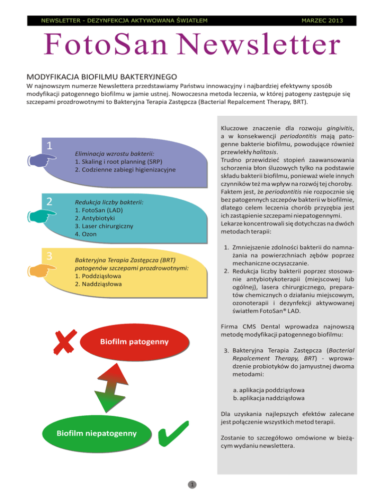 NEWSLETTER - DEZYNFEKCJA AKTYWOWANA ŒWIAT£EM MARZEC 2013 FotoSan Newsletter MODYFIKACJA BIOFILMU BAKTERYJNEGO W najnowszym numerze Newslettera przedstawiamy Pañstwu innowacyjny i najbardziej efektywny sposób modyfikacji patogennego biofilmu w jamie ustnej. Nowoczesna metoda leczenia, w której patogeny zastêpuje siê szczepami prozdrowotnymi to Bakteryjna Terapia Zastêpcza (Bacterial Repalcement Therapy, BRT). 1 K 2 K 3 K Kluczowe znaczenie dla rozwoju gingivitis, a w konsekwencji periodontitis maj¹ patogenne bakterie biofilmu, powoduj¹ce równie¿ przewlek³y halitosis. Trudno przewidzieæ stopieñ zaawansowania schorzenia b³on œluzowych tylko na podstawie sk³adu bakterii biofilmu, poniewa¿ wiele innych czynników te¿ ma wp³yw na rozwój tej choroby. Faktem jest, ¿e periodontitis nie rozpocznie siê bez patogennych szczepów bakterii w biofilmie, dlatego celem leczenia chorób przyzêbia jest ich zast¹pienie szczepami niepatogennymi. Lekarze koncentrowali siê dotychczas na dwóch metodach terapii: Eliminacja wzrostu bakterii: 1. Skaling i root planning (SRP) 2. Codzienne zabiegi higienizacyjne Redukcja liczby bakterii: 1. FotoSan (LAD) 2. Antybiotyki 3. Laser chirurgiczny 4. Ozon 1. Zmniejszenie zdolnoœci bakterii do namna¿ania na powierzchniach zêbów poprzez mechaniczne oczyszczanie. 2. Redukcja liczby bakterii poprzez stosowanie antybiotykoterapii (miejscowej lub ogólnej), lasera chirurgicznego, preparatów chemicznych o dzia³aniu miejscowym, ozonoterapii i dezynfekcji aktywowanej œwiat³em FotoSan® LAD. Bakteryjna Terapia Zastêpcza (BRT) patogenów szczepami prozdrowotnymi: 1. Poddzi¹s³owa 2. Naddzi¹s³owa Firma CMS Dental wprowadza najnowsz¹ metodê modyfikacji patogennego biofilmu: Biofilm patogenny 3. Bakteryjna Terapia Zastêpcza (Bacterial Repalcement Therapy, BRT) - wprowadzenie probiotyków do jamyustnej dwoma metodami: a. aplikacja poddzi¹s³owa b. aplikacja naddzi¹s³owa Dla uzyskania najlepszych efektów zalecane jest po³¹czenie wszystkich metod terapii. Biofilm niepatogenny Zostanie to szczegó³owo omówione w bie¿¹cym wydaniu newslettera. 1 NEWSLETTER - DEZYNFEKCJA AKTYWOWANA ŒWIAT£EM MARZEC 2013 Probiotyki do stosowania w jamie ustnej: Obiecuj¹ca wizja czy skuteczna metoda terapii w nowoczesnej stomatologii? Probiotyki stosowania s¹ coraz szersze. Bardzo dobrze znane jest W wiêkszoœci krajów probiotyki kojarz¹ siê z produktami zastosowanie w gastroenterologii, jednak nie wszyscy spo¿ywczymi na bazie mleka lub fermentowanych wiedz¹, ¿e probiotyki stosowane s¹ tak¿e w terapii warzyw. Powszechnie wiadomo, ¿e probiotyki mog¹ chorób uk³adu oddechowego, alergiach, atopowych dzia³aæ korzystnie na ¿o³¹dek, jelita oraz poprawiaæ zapaleniach skóry, zapaleniach ogólny stan zdrowia. pêcherza moczowego, kontroli Termin i znaczenie s³owa probiotyk Def. WHO: poziomu cholesterolu, kolki jelitozdefiniowali w 1965 r. Lilley Probiotyki s¹ definiowane jako ¿ywe wej niemowl¹t i wielu innych. i Stillwell. W 1994 r. WHO og³osi³o, mikroorganizmy, które konsumowane Probiotyki w jamie ustnej mog¹ ¿e probiotyki bêd¹ w przysz³oœci na przez ludzi wywieraj¹ korzystny efekt zwiêkszaæ ró¿norodnoœæ flory bakdrugim miejscu najwa¿niejszych na zdrowie poprzez iloœciowy i jakoœcio- teryjnej oraz pomagaæ w rozczynników nabytej odpowiedzi wy wp³yw na mikroflorê. wi¹zywaniu problemów spowodoimmunologicznej jako, ¿e antybiowanych nieprawid³owym sk³adem tyki coraz czêœciej staj¹ siê nieskuteczne wobec mikroflory. Wskazaniem do zastosowania probiotyków narastaj¹cego problemu lekoopornoœci. jest próchnica, gingivitis, periodontitis i halitosis, które Zastosowanie probiotyków staje siê coraz bardziej maj¹ podobn¹ etiologiê. powszechne w ró¿nych schorzeniach, a wskazania do ich N MECHANIZM DZIA£ANIA PROBIOTYKÓW Inhibicja konkurencyjna: adhezja i agregacja in situ, kompetycja o sk³adniki pokarmowe i czynniki wzrostu Produkcja substancji przeciwbakteryjnych tj. kwasy, nadtlenek wodoru i bakteriocyny Inhibicja kolagenazy. Redukcja stanów zapalnych. Wzmocnienie odpowiedzi immunologicznej Zahamowanie adhezji, kolonizacji i formowania biofilmu patogenów Zahamowany wzrost patogenów Wp³yw na system immunologiczny Dzia³anie antagonistyczne przeciw patogenom Zmniejszenie stanów zapalnych i zapobieganie degradacji tkanek 2 NEWSLETTER - DEZYNFEKCJA AKTYWOWANA ŒWIAT£EM Co nauka mówi o probiotykach? Spoœród 12 opublikowanych prac badawczych (str. 7) w 11 uzyskano pozytywne rezultaty, a w 1 nie by³o ró¿nicy pomiêdzy grup¹ kontroln¹ a leczon¹ probiotykami. Dotychczas opublikowano ok. 5-6 badañ na temat stosowania probiotyków w jamie ustnej. Najbardziej kompleksowe badania, które rekomendujemy do przeczytania, przedstawili Gupta, Devine i Haukioja. Wyniki s¹ bardzo obiecuj¹ce, ale istnieje potrzeba przeprowadzenia dalszych badañ, które pozwol¹ wytypowaæ najskuteczniejszy szczep i metodê aplikacji. Korzyœci¹ terapii probiotykami jest niew¹tpliwie brak skutków ubocznych. Brak powodów, dla których nie powinniœmy stosowaæ probiotyków. Cztery zalety terapii ProlacSan®: 2. 3. N 1. Wyselekcjonowano 2 najkorzystniejsze szczepy spoœród 600 bakterii 2. Lekarz kontroluje przebieg leczenia 3. Dodatkowy element pe³nej procedury konwencjonalnego leczenia 4. Zastosowanie pod - i naddzi¹s³owe (¿el i tabletki) w formie ¿elu do kieszonek dzi¹s³owych lub tabletek do ssania, wolno uwalniaj¹cych bakterie w czasie 5 minut do wnêtrza jamy ustnej. Efekty dzia³ania probiotyków Probiotyki maj¹ 3 schematy dzia³ania (przedstawione na str. 2) 1. MARZEC 2013 Jak nale¿y po³¹czyæ terapiê ProlacSan® z innymi metodami leczenia? Zahamowanie rozwoju patogenów poprzez rywalizacjê o miejsce do rozwoju i sk³adniki od¿ywcze. Uwalnianie specyficznych i niespecyficznych zwi¹zków bakteryjnych. Wp³yw na procesy zapalne. Ka¿de leczenie nale¿y poprzedziæ protoko³em SRP: skaling i root planning. P