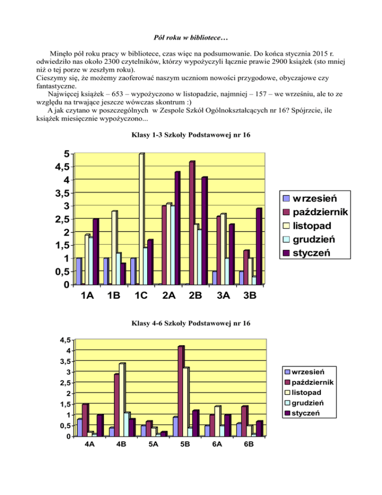 Pół roku w bibliotece… Minęło pół roku pracy w bibliotece, czas więc na podsumowanie. Do końca stycznia 2015 r. odwiedziło nas około 2300 czytelników, którzy wypożyczyli łącznie prawie 2900 książek (sto mniej niż o tej porze w zeszłym roku). Cieszymy się, że możemy zaoferować naszym uczniom nowości przygodowe, obyczajowe czy fantastyczne. Najwięcej książek – 653 – wypożyczono w listopadzie, najmniej – 157 – we wrześniu, ale to ze względu na trwające jeszcze wówczas skontrum :) A jak czytano w poszczególnych w Zespole Szkół Ogólnokształcących nr 16? Spójrzcie, ile książek miesięcznie wypożyczono... Klasy 1-3 Szkoły Podstawowej nr 16 5 4,5 4 3,5 3 2,5 2 1,5 1 0,5 0 wrzesień październik listopad grudzień styczeń 1A 1B 1C 2A 2B 3A 3B Klasy 4-6 Szkoły Podstawowej nr 16 4,5 4 3,5 wrzesień październik listopad grudzień styczeń 3 2,5 2 1,5 1 0,5 0 4A 4B 5A 5B 6A 6B Gimnazjum nr 16 2,5 2 wrzesień październik listopad grudzień styczeń 1,5 1 0,5 0 1A 1B 2A 2B 3A 3B VIII Liceum Ogólnokształcące 4,5 4 3,5 3 wrzesień 2,5 paździenik listopad 2 grudzień 1,5 styczeń 1 0,5 0 1 2 3 Na podstawie powyższych „słupków” można pokusić się o porównanie, która klasa wiedzie prym w czytaniu, a uczniowie której klasy omijają naszą bibliotekę (należy jednak zwrócić uwagę, że „najsłabszy” wynik w klasach I-III SP jest jednocześnie najlepszym wynikiem w gimnazjum!). Liczymy na poprawę tych danych ;) W nawiasie podajemy liczbę książek przypadających na jednego ucznia w klasie. Szkoła podstawowa Gimnazjum Liceum I – III IV – VI I – III I – III Najlepiej czytają uczniowie klas: II A (13,5) V B (10,9) II B (5,7) II A (9) Najsłabiej czytają uczniowie klas: I B (5,8) IV B (1,4) I A (1,3) I A (5,3) A kto wyróżnił się w czytaniu w poszczególnych klasach? Oto najlepsi czytelnicy: Szkoła Podstawowa Marika Kańduła – klasa 1 A Zuzia Kowalczuk – klasa 1 B Lilianna Haponik – klasa 1C Klaudia Ziaja – klasa 2 A Oliwia Mermela – klasa 2 B Julia Kowalczyk – klasa 3 A Wiktor Witczak – klasa 3 B Kacper Krawczyk – klasa 4 A Weronika Urbańska – klasa 4 B Jakub Danak – klasa 5 A Julia Piątek – klasa 5 B Dominika Śliwa – klasa 6 A Martyna Wołczyk – klasa 6 B Gimnazjum Natalia Krawczyk i Anastasiya Krokh – klasa 1 A Darek Zgondek – klasa 1 B Anita Rąblewska – klasa 2 A Filip Krygier – klasa 2 B Michał Pączkowski – klasa 3 A Wiktoria Urbaniak – klasa 3 B Liceum Dagmara Derda – klasa 1 Łukasz Matecki – klasa 2 Sandra Kurzawa – klasa 3 Gdyby pokusić się o sporządzenie TOP LISTY CZYTELNIKÓW ZSO 16 , wyglądałaby ona następująco: 1. Julia Piątek, kl. 5B 2. Oliwia Mermela, kl. 2B SP 3. Oliwia Mularska, kl. 2B SP 4. Lilianna Haponik, kl. 1C SP 5. Dominika Śliwa, kl. 6A 6. Dagmara Derda, kl. 1 LO 7. Iga Aniukiewicz, kl. 5B 8. Anita Rąglewska, kl. 2A Gim. 9. Wiktoria Urbaniak, kl. 3B Gim. oraz Sandra Kurzawa, kl. 3 LO 10. Paulina Szlingert, kl. 3 LO Dziękujemy za każdą miłą rozmowę, chwilę u nas spędzoną. Zapraszamy – bez Was nie ma nas ;))) Aneta Buchmiet Jowita Kotomska
