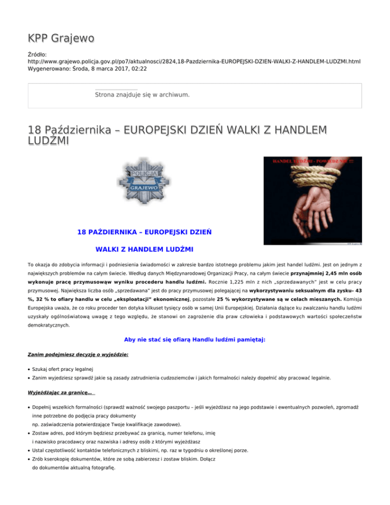 KPP Grajewo Źródło: http://www.grajewo.policja.gov.pl/po7/aktualnosci/2824,18-Pazdziernika-EUROPEJSKI-DZIEN-WALKI-Z-HANDLEM-LUDZMI.html Wygenerowano: Środa, 8 marca 2017, 02:22 Strona znajduje się w archiwum. 18 Października – EUROPEJSKI DZIEŃ WALKI Z HANDLEM LUDŹMI 18 PAŹDIERNIKA – EUROPEJSKI DZIEŃ WALKI Z HANDLEM LUDŹMI To okazja do zdobycia informacji i podniesienia świadomości w zakresie bardzo istotnego problemu jakim jest handel ludźmi. Jest on jednym z największych problemów na całym świecie. Według danych Międzynarodowej Organizacji Pracy, na całym świecie przynajmniej 2,45 mln osób wykonuje pracę przymusowąw wyniku procederu handlu ludźmi. Rocznie 1,225 mln z nich „sprzedawanych” jest w celu pracy przymusowej. Największa liczba osób „sprzedawana” jest do pracy przymusowej polegającej na wykorzystywaniu seksualnym dla zysku– 43 %, 32 % to ofiary handlu w celu „eksploatacji” ekonomicznej, pozostałe 25 % wykorzystywane są w celach mieszanych. Komisja Europejska uważa, że co roku proceder ten dotyka kilkuset tysięcy osób w samej Unii Europejskiej. Działania dążące ku zwalczaniu handlu ludźmi uzyskały ogólnoświatową uwagę z tego względu, że stanowi on zagrożenie dla praw człowieka i podstawowych wartości społeczeństw demokratycznych. Aby nie stać się ofiarą Handlu ludźmi pamiętaj: Zanim podejmiesz decyzję o wyjeździe: ● Szukaj ofert pracy legalnej ● Zanim wyjedziesz sprawdź jakie są zasady zatrudnienia cudzoziemców i jakich formalności należy dopełnić aby pracować legalnie. Wyjeżdżając za granicę… ● Dopełnij wszelkich formalności (sprawdź ważność swojego paszportu – jeśli wyjeżdżasz na jego podstawie i ewentualnych pozwoleń, zgromadź inne potrzebne do podjęcia pracy dokumenty np. zaświadczenia potwierdzające Twoje kwalifikacje zawodowe). ● Zostaw adres, pod którym będziesz przebywać za granicą, numer telefonu, imię i nazwisko pracodawcy oraz nazwiska i adresy osób z którymi wyjeżdżasz ● Ustal częstotliwość kontaktów telefonicznych z bliskimi, np. raz w tygodniu o określonej porze. ● Zrób kserokopię dokumentów, które ze sobą zabierzesz i zostaw bliskim. Dołącz do dokumentów aktualną fotografię. ● Ubezpiecz się Zabierz ze sobą ! ● Adres i numer telefonu najbliższego konsulatu w kraju, do którego jedziesz. ● Numer telefonu Poland direct z kraju do którego jedziesz. Jeśli staniesz się ofiarą przestępstwa… ● Jakiegokolwiek przestępstwa (np. kradzież, gwałt, pobicie, zmuszanie do prostytucji lub pracy niewolniczej) bez względu na legalność pobytu masz prawo do bezpieczeństwa, ochrony i pomocy prawnej. Możesz zwrócić się do organów ścigania, a także konsula. Zanim wyjedziesz, dowiedz się jak najwięcej nt. warunków zatrudniania w kraju, do którego jedziesz. Możesz do zrobić kontaktując się z: 1. Wojewódzkim Urzędem Pracy w Białymstoku, ul. Pogodna 22, (85) 749-72-35 2. Oddziałem Terenowym WUP w Łomży, ul. Nowogrodzka 1, (86) 216-74-79 3. Oddziałem Terenowy WUP w Suwałkach, ul. Przytorowa 9B, (87) 566-66-01 ponadto informacje na temat zatrudnienia za granicą znajdziesz: www.kraz.praca.gov.pl www.msz.gov.pl www.cpk.org.pl Nie pozwól, żebyś stał(a) się towarem POMOCY MOŻESZ SZUKAĆ: Organizacje: 1. La Strada Fundacja Przeciwko Handlowi Ludźmi i Niewolnictwu, Warszawa, telefon zaufania 022 628 99 99 http://www.strada.org.pl/ 1. Telefon Zaufania dla Kobiet, Warszawa, tel. 022 635 93 92 1. Centrum Pomocy Emigrantom i Uchodźcom Caritas Archidiecezji Białostockiej, Białystok, ul Warszawska 32 tel. 085 651 90 08 1. ELEOS Prawosławny Ośrodek Miłosierdzia Diecezji Białostocko – Gdańskiej, 15-062 Białystok, ul. Warszawska 47, tel. 085 742 65 00 e-mail: [email protected], [email protected] 1. ITAKA – Centrum Poszukiwań Ludzi Zaginionych Telefon zaufania: 0048 22 - 654 70 70, LINIA WSPARCIA - 0 801 24 70 70 http://www.itaka.org.pl/ Instytucje: 1. Ośrodek Interwencji Kryzysowej, Białystok, ul. Włókiennicza 7, tel. 085 744 50 27 (czynny całą dobę) Ambasady w woj. Podlaskim: 1. Ambasada Republiki Białorusi Konsulat Generalny, Białystok, ul Elektryczna 9 1. Ambasada Republiki Litewskiej Konsulat, 16-500 Sejny, ul. 22 Lipca 9, tel. 087 5173790 Jeśli uważasz, że zostało popełnione przestępstwo lub szukasz pomocy zgłoś się do najbliższej jednostki policji lub zadzwoń: 997 lub 112 (tel. kom) Komenda Powiatowa Policji w Grajewie ZAŁĄCZNIKI DO STRONY Fundacja Dzieci Niczyje 5.12 MB Ocena: 0/5 (0) Tweetnij