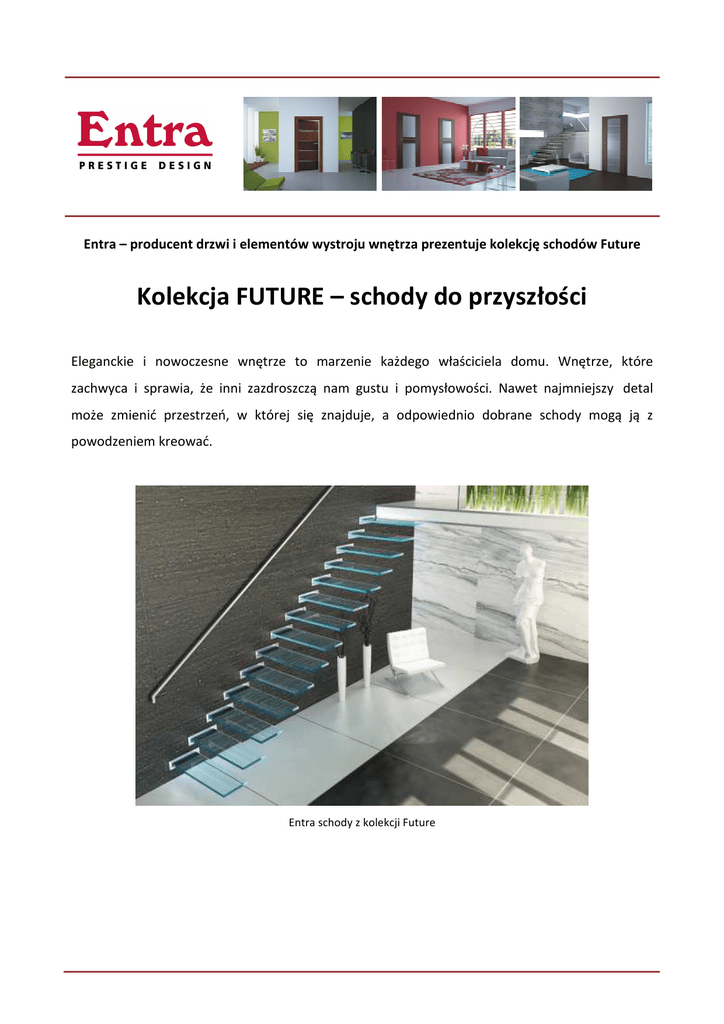 Entra – producent drzwi i elementów wystroju wnętrza prezentuje kolekcję schodów Future Kolekcja FUTURE – schody do przyszłości Eleganckie i nowoczesne wnętrze to marzenie każdego właściciela domu. Wnętrze, które zachwyca i sprawia, że inni zazdroszczą nam gustu i pomysłowości. Nawet najmniejszy detal może zmienić przestrzeń, w której się znajduje, a odpowiednio dobrane schody mogą ją z powodzeniem kreować. Entra schody z kolekcji Future Na szczególną uwagę zasługuje jeden z modeli schodów proponowanych przez firmę Entra, producenta drzwi i elementów wystroju wnętrza. Nowoczesny design oraz nowatorskie wykonanie schodów Future sprawia, że jest to propozycja dla klientów nie bojących się innowacyjnych i śmiałych rozwiązań. Schody Future to idealna kolekcja dla tych, którzy cenią sobie nowoczesne trendy w aranżacji wnętrz i mają odwagę się na nie otworzyć. Entra schody z kolekcji Future Efektowna prostota i wszechobecny minimalizm przejawiają się w każdym detalu. Delikatne oświetlenie szklanych stopni tworzy aurę wyjątkowości i magii, podkreślając jednocześnie unikalny i futurystyczny charakter wnętrza. Entra schody z kolekcji Future www.entra.pl
