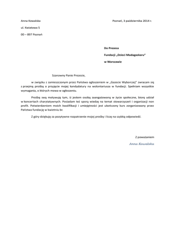 Anna Kowalska Poznań, 3 października 2014 r. ul. Kwiatowa 5 00 – 897 Poznań Do Prezesa Fundacji „Dzieci Madagaskaru” w Warszawie Szanowny Panie Prezesie, w związku z zamieszczonym przez Państwa ogłoszeniem w „Gazecie Wyborczej” zwracam się z przejmą prośbą o przyjęcie mojej kandydatury na wolontariusza w fundacji. Spełniam wszystkie wymagania, o których mowa w ogłoszeniu. Prośbę swą motywuję tym, iż jestem osobą zaangażowaną w życie społeczne, biorę udział w koncertach charytatywnych. Posiadam też sporą wiedzę na temat stowarzyszeń i organizacji non profit. Potwierdzeniem moich kwalifikacji i umiejętności jest ukończony kurs zorganizowany przez Państwa fundację w kwietniu br. Z góry dziękuję za pozytywne rozpatrzenie mojej prośby i liczę na szybką odpowiedź. Z poważaniem Anna Kowalska
