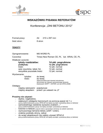 WSKAZÓWKI PISANIA REFERATÓW Konferencja: „DNI BETONU 2012” Format pracy: A4 210 x 297 mm Ilość stron: 8 stron TEKSTY Oprogramowanie: MS WORD PL Czcionka: Times New Roman CE, PL lub ARIAL CE, PL Wielkość czcionki: tytuły rozdziałów: podtytuły: treść: opis rysunków, tabel, fot. wszystkie pozostałe treści Wyrównanie: tytułów: treść: 14 pkt. pogrubione 12 pkt. pogrubione 12 pkt. normal 12 pkt. normal 12 pkt. normal do lewej do lewej (dopuszczalne jest również obustronne ale proszę nie używać wymuszonego łamania klawiszami SHIFT + ENTER, ani też SPACJAMI) Odstępy: między wierszami: pojedyncze między akapitem: przed i po ustawić na „0” Prosimy nie używać: - stylów, nagłówków, - większych odstępów tworzonych za pomocą spacji niż 1 x (przy przeformatowaniu pracy SPACJE nie będą usunięte i powstaną dziury w tekście) - samodzielnego dzielenia wyrazów znakiem „-” (przy przeformatowaniu pauzy nie będą usunięte i pozostaną w tekście) kolorów w tekście (użycie koloru spowoduje zamianę na odcień szarości), wymuszonego łamania tekstu (shift + enter), znaków podziału strony, sekcji do wcięć akapitowych nie należy używać SPACJI (przy przeformatowaniu pracy SPACJE nie będą usunięte i powstaną dziury w tekście) 1|S t r o n a natomiast należy: - do robienia odstępów pomiędzy wierszami używać klawisz ENTER (pojedyncza linia) - wcięcia akapitowe – 1 x TAB - do tworzenia wypunktowania prosimy używać pauzy (znak „minus”) lub znaku graficznego „•” (kod znaku lewy alt 0149 – cyfry z klawiatury numerycznej) (przy przeformatowaniu pracy, inne zastosowane znaki będą usunięte) FOTOGRAFIE Fotografie, rysunki, schematy prosimy zapisywać w osobnych plikach – nie należy umieszczać fotografii lub innych skanowanych obrazów w MS WORD. W treści należy podać tylko numer i tytuł rysunku lub fotografii. Format fotografii i rysunków: Format pliku: Rozdzielczość: szerokość nie większa niż 124 mm CDR, JPG, TIF, PSD 250 - 300 dpi (dotyczy fotografii, obrazów skanowanych) W przypadku braku możliwości ze skanowania fotografii, rysunków prosimy o dostarczenie oryginałów do siedziby biura organizacyjnego. Dostarczone materiały po wykorzystaniu są do zwrotu. PRACE W FORMIE ELEKTRONICZNEJ NALEŻY PRZESYŁAĆ WRAZ Z ZAŁĄCZONYM WYDRUKIEM NA ADRES BIURA ORGANIZACYJNEGO Stowarzyszenie Producentów Cementu ul. Lubelska 29, 30-003 Kraków tel. 012 423 33 55, fax: 012 423 33 45 e-mail: [email protected] lub pocztą elektroniczną pliki a wydruk pocztą tradycyjną. Przy braku wydruku i możliwości sprawdzenia referatu wg oryginału redakcja nie ponosi odpowiedzialności za ewentualne błędy składu. Ewentualne pytania dotyczące składu prosimy kierować pod adres biura z dopiskiem redakcja lub pod adres poczty elektronicznej. Artur Darłak redakcja: 012 423-33-55 [email protected] Kraków, 20-03-2012 redakcja SPC 2|S t r o n a tytuł naukowy, Imię i Nazwisko reprezentowana uczelnia, firma Tytuł referatu – j. polski Tytuł referatu – j. angielski Streszczenie W 2000 roku Stowarzyszenie Producentów Cementu i Wapna wspólnie ze Spółką Polski Cement zorganizowało konferencję naukowo-techniczną „Beton na progu nowego milenium”. Konferencja ta cieszyła się dużym zainteresowaniem środowiska naukowców i praktyków – wzięło w niej udział blisko 300 osób. Już w trakcie trwania Konferencji uczestnicy zgłaszali potrzebę kontynuacji podobnych spotkań. Wychodząc naprzeciw oczekiwaniom osób i firm zajmujących się problematyką betonu Spółka Polski Cement rozpoczyna w 2002 roku organizację cyklicznej Konferencji pn. DNI BETONU. Pragniemy, aby Konferencja ta stała się platformą dyskusji świata nauki i praktyków, aby nowe osiągnięcia badawcze znajdowały coraz częściej zastosowanie w praktyce przemysłowej. Abstract Streszczenie w języku angielskim streszczenie w języku angielskim streszczenie w języku angielskim streszczenie w języku angielskim streszczenie w języku angielskim streszczenie w języku angielskim streszczenie w języku angielskim streszczenie w języku angielskim streszczenie w języku angielskim streszczenie w języku angielskim streszczenie w języku angielskim streszczenie w języku angielskim streszczenie w języku angielskim streszczenie w języku angielskim streszczenie w języku angielskim streszczenie w języku angielskim streszczenie w języku angielskim streszczenie w języku angielskim streszczenie w języku angielskim streszczenie w języku angielskim streszczenie w języku angielskim streszczenie w języku angielskim streszczenie w języku angielskim streszczenie w języku angielskim. 3|S t r o n a 1. Rozdział W 2000 roku Stowarzyszenie Producentów Cementu i Wapna wspólnie ze Spółką Polski Cement zorganizowało konferencję naukowo-techniczną „Beton na progu nowego milenium”. Konferencja ta cieszyła się dużym zainteresowaniem środowiska naukowców i praktyków – wzięło w niej udział blisko 300 osób. Już w trakcie trwania Konferencji uczestnicy zgłaszali potrzebę kontynuacji podobnych spotkań. Rys.1. Tytuł rysunku. Fot. 1. Tytuł fotografii. Wychodząc naprzeciw oczekiwaniom osób i firm zajmujących się problematyką betonu Spółka Polski Cement rozpoczyna w 2002 roku organizację cyklicznej Konferencji pn. DNI BETONU. Pragniemy, aby Konferencja ta stała się platformą dyskusji świata nauki i praktyków, aby nowe osiągnięcia badawcze znajdowały coraz częściej zastosowanie w praktyce przemysłowej. 1.1 Podrozdział W 2000 roku Stowarzyszenie Producentów Cementu i Wapna wspólnie ze Spółką Polski Cement zorganizowało konferencję naukowo-techniczną „Beton na progu nowego milenium”. Konferencja ta cieszyła się dużym zainteresowaniem środowiska naukowców i praktyków – wzięło w niej udział blisko 300 osób. Już w trakcie trwania Konferencji uczestnicy zgłaszali potrzebę kontynuacji podobnych