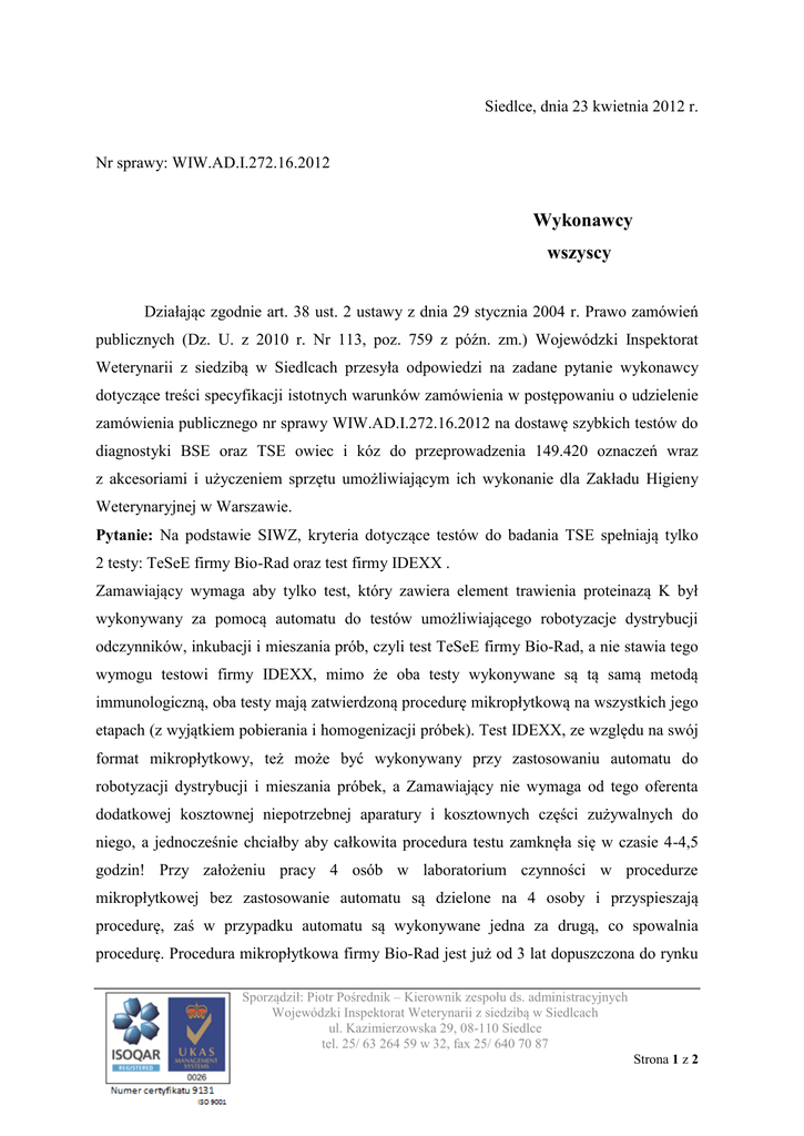 Siedlce, dnia 23 kwietnia 2012 r. Nr sprawy: WIW.AD.I.272.16.2012 Wykonawcy wszyscy Działając zgodnie art. 38 ust. 2 ustawy z dnia 29 stycznia 2004 r. Prawo zamówień publicznych (Dz. U. z 2010 r. Nr 113, poz. 759 z późn. zm.) Wojewódzki Inspektorat Weterynarii z siedzibą w Siedlcach przesyła odpowiedzi na zadane pytanie wykonawcy dotyczące treści specyfikacji istotnych warunków zamówienia w postępowaniu o udzielenie zamówienia publicznego nr sprawy WIW.AD.I.272.16.2012 na dostawę szybkich testów do diagnostyki BSE oraz TSE owiec i kóz do przeprowadzenia 149.420 oznaczeń wraz z akcesoriami i użyczeniem sprzętu umożliwiającym ich wykonanie dla Zakładu Higieny Weterynaryjnej w Warszawie. Pytanie: Na podstawie SIWZ, kryteria dotyczące testów do badania TSE spełniają tylko 2 testy: TeSeE firmy Bio-Rad oraz test firmy IDEXX . Zamawiający wymaga aby tylko test, który zawiera element trawienia proteinazą K był wykonywany za pomocą automatu do testów umożliwiającego robotyzacje dystrybucji odczynników, inkubacji i mieszania prób, czyli test TeSeE firmy Bio-Rad, a nie stawia tego wymogu testowi firmy IDEXX, mimo że oba testy wykonywane są tą samą metodą immunologiczną, oba testy mają zatwierdzoną procedurę mikropłytkową na wszystkich jego etapach (z wyjątkiem pobierania i homogenizacji próbek). Test IDEXX, ze względu na swój format mikropłytkowy, też może być wykonywany przy zastosowaniu automatu do robotyzacji dystrybucji i mieszania próbek, a Zamawiający nie wymaga od tego oferenta dodatkowej kosztownej niepotrzebnej aparatury i kosztownych części zużywalnych do niego, a jednocześnie chciałby aby całkowita procedura testu zamknęła się w czasie 4-4,5 godzin! Przy założeniu pracy 4 osób w laboratorium czynności w procedurze mikropłytkowej bez zastosowanie automatu są dzielone na 4 osoby i przyspieszają procedurę, zaś w przypadku automatu są wykonywane jedna za drugą, co spowalnia procedurę. Procedura mikropłytkowa firmy Bio-Rad jest już od 3 lat dopuszczona do rynku Sporządził: Piotr Pośrednik – Kierownik zespołu ds. administracyjnych Wojewódzki Inspektorat Weterynarii z siedzibą w Siedlcach ul. Kazimierzowska 29, 08-110 Siedlce tel. 25/ 63 264 59 w 32, fax 25/ 640 70 87 Strona 1 z 2 bez konieczności zastosowania automatu, co znajduje swoje odzwierciedlenie w aktualnej opinii PIWET i dopuszczeniu przez VLA - laboratorium referencyjne UE. Mając powyższe na uwadze - czy Zamawiający dopuści w przypadku testu zawierającego element trawienia z proteinazą K zastosowania manualnej procedury mikropłytkowej (tak jak w przypadku testu IDEX ) na wszystkich etapach tego testu bez konieczności użycia automatu do robotyzacji dystrybucji odczynników i mieszania prób? Uzasadnienie. Automat nie przyspiesza procedury, nie usprawnia jej, podraża ją i ma znaczenie historyczne, kiedy walidacja testu z proteinazą K i dopuszczenie do rynku testu TeSeE było możliwe tylko w oparciu o ten automat. Obecnie manualna procedura testu firmy Bio-Rad jest skrócona i absolutnie nie wymaga automatu, tak jak nie wymaga jej test firmy IDEXX. Procedura całkowitego wykonania testu w manualnym formacie mikropłytkowym bez automatu jest dopuszczona do stosowania przez Ref laboratorium VLA i PIWET. Biorąc pod uwagę wymagania w SIWZ dotyczące dostarczenia automatu tylko w przypadku testu z etapem proteinazy K są sprzeczne z zasadami konkurencji i równego traktowania oferentów Takie postanowienie SIWZ uniemożliwia firmie Bio-Rad złożenie ważnej oferty, ponieważ zastosowanie automatu, czego domaga się Zamawiający powoduje wydłużenie procedury testu ponad wymagany w SIWZ czas 4-4,5 godz. obejmujący procedurę testu bez pobrania i homogenizacji. Firma Eskulap z testem firmy IDEXX może spełnić ten wymóg stosując wyłącznie manualną procedurę mikropłytkową bez konieczności zastosowania automatu. Bez korekty tego zapisu SIWZ Zamawiający umożliwia złożenie ważnej oferty tylko firmie Eskulap-dystrybutorowi testu IDEXX czyniąc przetarg nieograniczony tylko z nazwy, a praktycznie stanowi zakup z wolnej ręki. Odpowiedź: Zamawiający wyraża zgodę aby oferowany przez Wykonawcę test, który zawiera element trawienia proteinazą K był wykonywany bez pomocy automatu do testów umożliwiającego robotyzację dystrybucji odczynników, inkubacji i mieszania prób. Stosowna zmiana zostanie naniesiona do treści specyfikacji istotnych warunków zamówienia. Sporządził: Piotr Pośrednik – Kierownik zespołu ds. administracyjnych Wojewódzki Inspektorat Weterynarii z siedzibą w Siedlcach ul. Kazimierzowska 29, 08-110 Siedlce tel. 25/ 63 264 59 w 32, fax 25/ 640 70 87 Strona 2 z 2