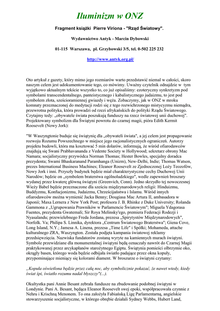 Iluminizm w ONZ Fragment książki Pierre Viriona - "Rząd Światowy". Wydawnictwo Antyk - Marcin Dybowski 01-115 Warszawa, pl. Grzybowski 3/5, tel. 0-502 225 232 http://www.antyk.org.pl/ Oto artykuł z gazety, który mimo jego rozmiarów warto przedstawić niemal w całości, skoro naszym celem jest udokumentowanie tego, co mówimy. Uważny czytelnik odnajdzie w tym wyjątkowo aktualnym tekście wszystko to, co już opisaliśmy: ezoteryczny synkretyzm pod symbolami transcendentalnego, panteistycznego i kabalistycznego judaizmu, to jest pod symbolem złota, sześcioramiennej gwiazdy i węża. Zobaczymy, jak w ONZ w mroku komnaty przeznaczonej do medytacji rodzi się z tego rozwichrzonego mistycyzmu niemądra, przewrotna polityka, która prowadzi od rzezi afrykańskich do polityki Rządu Światowego. Czytajmy tedy: „obywatele świata poszukują funduszy na rzecz światowej unii duchowej". Projektowany symbolizm dla Świątyni powrotu do czarnej magii, pióra Edith Kermit Roosevelt (Nowy Jork): "W Waszyngtonie buduje się świątynię dla „obywateli świata", a jej celem jest propagowanie rozwoju Rozumu Powszechnego w miejsce jego racjonalistycznych ograniczeń. Autorzy projektu budowli, która ma kosztować 5 min dolarów, informują, że wśród ofiarodawców znajdują się Swani Prabhavananda z Vedente Society w Hollywood; sekretarz obrony Mac Namara; socjalistyczny przywódca Norman Thomas; Hester Bowles, specjalny doradca prezydenta; Swami Bhaskaranand Paramhanga (Unizm), New-Delhi, Indie; Thomas Watson, prezes International Business Machines; Eleanor Roosevelt ze Zjednoczonej Loży Teozofów, Nowy Jork i inni. Przyszły budynek będzie miał charakterystyczne cechy Duchowej Unii Narodów; będzie on „symbolem braterstwa ogólnoludzkiego", wedle zapewnień broszury wydanej przez kwaterę główną świątyni (Greenvich, Conn). Jedno skrzydło tej nowoczesnej Wieży Babel będzie przeznaczone dla sześciu międzynarodowych religii: Hinduizmu, Buddyzmu, Konfucjonizmu, Judaizmu, Chrześcijaństwa i Islamu. Wśród innych ofiarodawców można wymienić Jacka Benny; Dougiasa Mac Artura II, ambasadora w Japonii; Maxa Lernera z New York Post; profesora J. B. Rhinke z Duke University; Rolanda Gammona z „Ugrupowania Prawników w Parlamencie Światowym"; Miguela Ydagorasa Fuentes, prezydenta Gwatemali; Sir Roya Melinsky'ego, premiera Federacji Rodezji i Nyasalandu; przewielebnego Freda Jordana, prezesa „Spirytystów Międzynarodowych", Norfolk. Va; Philipa S. Linnika, dyrektora „Centrum Światowego Braterstwa"; Giena Cove, Long Island, N.Y.; Jamesa A. Linena, prezesa „Time Life" i Spółki; Mohameda, attache kulturalnego ZRA, Waszyngton. Została podjęta kampania światowej reklamy przedsięwzięcia. Nazwiska fundatorów zostaną wyryte na kamiennych murach świątyni. Symbole przewidziane dla monumentalnej świątyni będą oznaczały nawrót do Czarnej Magii praktykowanej przez arcykapłanów starożytnego Egiptu. Świątynia pomieści olbrzymie oko, okrągły basen, którego woda będzie odbijała światło padające przez okna kopuły, przypominające mieniący się kolorami diament. W broszurze o świątyni czytamy: „Kopuła oświetlona będzie przez całą noc, aby symbolicznie pokazać, że nawet wtedy, kiedy świat śpi, światło rozumu nadal błyszczy"(...). Okultystka pani Annie Besant zebrała fundusze na zbudowanie podobnej świątyni w Londynie. Pani A. Besant, będąca Eleanor Roosevelt swej epoki, współpracowała czynnie z Nehru i Krischną Menonem. To ona założyła Fabiańską Ligę Parlamentarną, angielskie stowarzyszenie socjalistyczne, w którego obrębie działali Sydney Webbs, Hubert Land, H.E.Hampion i George Bernard Shaw. Świątynię pani Besant charakteryzowało sześć symbolicznych obrazów sześciu wielkich międzynarodowych religii umieszczonych w sali konferencyjnej. Odwiedzający ją adepci mogli w niej oglądać na murze sześcioramienną gwiazdę teozoficzną złożoną z dwóch trójkątów, oplecionych przez węża. Ten motyw jest powtórzony w „Świątyni Rozumu". Broszura informuje nas, że sześć murów świątyni będzie zawierać szereg „odblasków diamentu prawdy". W Nowym Jorku „Przyjaciele Komnaty Medytacji" zbierają się regularnie na długich spotkaniach w Komnacie Medytacji ONZ. W centrum tej świątyni promień światła igra na wypolerowanym złocie. 24 kwietnia 1957 roku, gdy „Komnata Medytacji" została ponownie otwarta, Dag Hammarskjold, sekretarz generalny ONZ, określił ten pogański kamień jako ołtarz Uniwersalnej Religii. „Ołtarz jest symbolem Boga wszechrzeczy" - powiedział. Świątynia Rozumu będzie również posiadała komnatę medytacji, tak zwany „Hall Iluminacji". W tym miejscu iluminaci, „Mistrzowie Mądrości", nasi przewodnicy w Świątyni Rozumu, zamierzają zapoznawać publiczność z nowym kultem humanistycznym. „Hall Iluminacji" będzie miejscem zebrań, wyświetlania filmów l urządzania kursów na temat wielkich religii świata. Jest rzeczą interesującą, że od pewnego czasu grupa, określająca siebie jako „Nową Grupę Sług Świata", zbiera się podczas pełni księżyca na spotkania poświęcone medytacji, mianowicie w Narodowym Centrum Fundacji Carnegiego w Nowym Jorku. 21 grudnia 1961 roku autorka tego artykułu uczestniczyła w takim zebraniu, podczas którego rozdano ulotki opisujące „Nową Religię Światową". Broszura pod tytułem „Światowa Dobra Wola" przedstawia to, co zapewne mają na myśli twórcy Świątyni Rozumu: „Zaczyna się cieszyć uznaniem nowy rodzaj mistyki: jego znamieniem jest potrzeba zajęcia się swym rozwojem i skłonność do uznania obecności Boga we wszystkich religiach, a nie jedynie w swoim ognisku wiary religijnej". Tam, gdzie ta przypuszczalna elita międzynarodowa zbiera się, aby w atmosferze spisku organizować Rząd Światowy, usłyszałam pewną grupę „sług świata", jak pod przewodnictwem Fostera Baileya śpiewała c