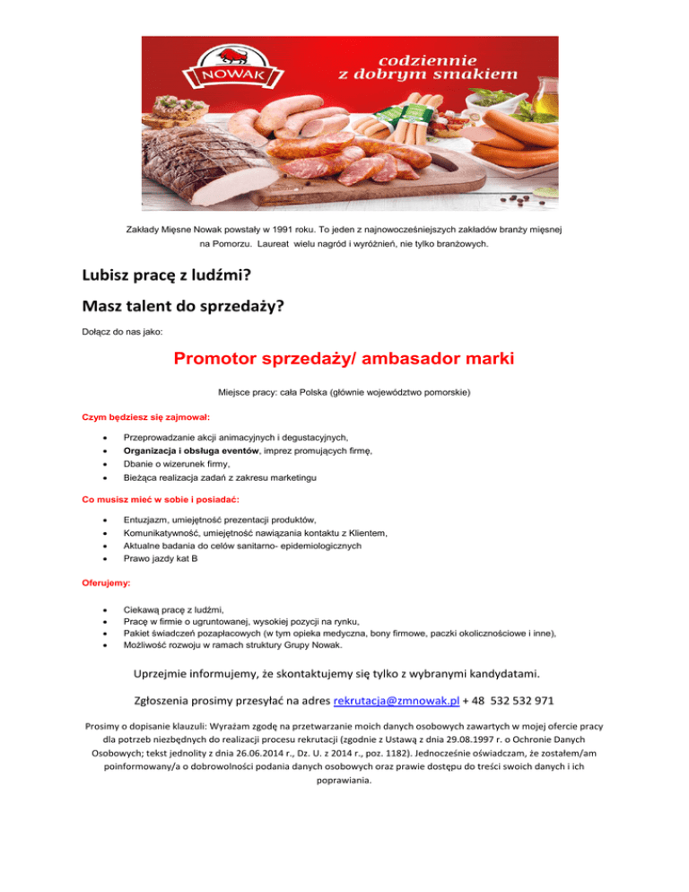 Zakłady Mięsne Nowak powstały w 1991 roku. To jeden z najnowocześniejszych zakładów branży mięsnej na Pomorzu. Laureat wielu nagród i wyróżnień, nie tylko branżowych. Lubisz pracę z ludźmi? Masz talent do sprzedaży? Dołącz do nas jako: Promotor sprzedaży/ ambasador marki Miejsce pracy: cała Polska (głównie województwo pomorskie) Czym będziesz się zajmował:  Przeprowadzanie akcji animacyjnych i degustacyjnych,  Organizacja i obsługa eventów, imprez promujących firmę,  Dbanie o wizerunek firmy,  Bieżąca realizacja zadań z zakresu marketingu Co musisz mieć w sobie i posiadać:  Entuzjazm, umiejętność prezentacji produktów,  Komunikatywność, umiejętność nawiązania kontaktu z Klientem,  Aktualne badania do celów sanitarno- epidemiologicznych  Prawo jazdy kat B Oferujemy:     Ciekawą pracę z ludźmi, Pracę w firmie o ugruntowanej, wysokiej pozycji na rynku, Pakiet świadczeń pozapłacowych (w tym opieka medyczna, bony firmowe, paczki okolicznościowe i inne), Możliwość rozwoju w ramach struktury Grupy Nowak. Uprzejmie informujemy, że skontaktujemy się tylko z wybranymi kandydatami. Zgłoszenia prosimy przesyłać na adres [email protected] + 48 532 532 971 Prosimy o dopisanie klauzuli: Wyrażam zgodę na przetwarzanie moich danych osobowych zawartych w mojej ofercie pracy dla potrzeb niezbędnych do realizacji procesu rekrutacji (zgodnie z Ustawą z dnia 29.08.1997 r. o Ochronie Danych Osobowych; tekst jednolity z dnia 26.06.2014 r., Dz. U. z 2014 r., poz. 1182). Jednocześnie oświadczam, że zostałem/am poinformowany/a o dobrowolności podania danych osobowych oraz prawie dostępu do treści swoich danych i ich poprawiania.