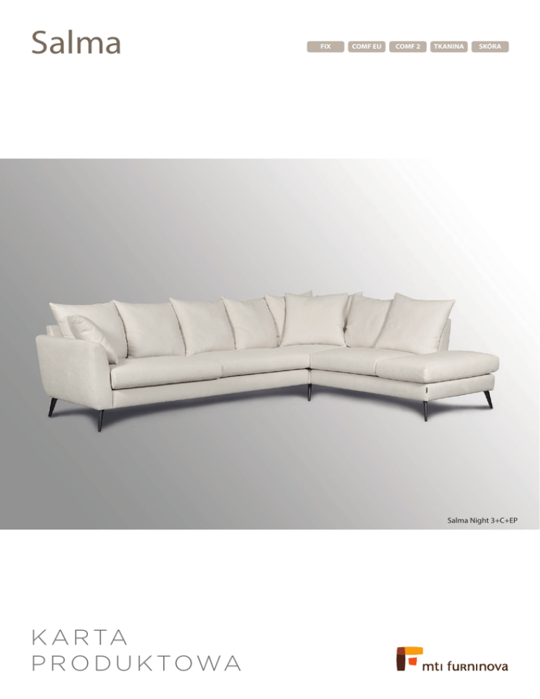 Salma FIX COMF EU COMF 2 TKANINA SKÓRA Salma Night 3+C+EP K A R TA P R O D U K TO WA Salma Wymiary* Szerokość • Głębokość • Wysokość w cm 2,5 182x90x80 3 212x90x80 150/130** Głębokość siedziska 55 • Wysokość siedziska 44 PUFA 3+C+EP 75x50x44 284x213x80 180/160** * Wymiary mogą się różnić +/- 3%, w zależności od wyboru tapicerki i konfiguracji. Piktogramy nie odzwierciedlają proporcji i kształtu mebla. ** Szerokość siedziska dla wersji Day. Comfort C2 C2 Poduszka siedziska Wkład poduszki siedziska składa się z wysokoelastycznej pianki z topem pierzowym. Poduszka oparcia top pierzowy 12 cm pianki HR 35 70% pierze 30% włókna silikonowe Poduszka oparcia Comfort EU EU Poduszka siedziska Wkład poduszki siedziska składa się z wysokoelastycznej pianki pokrytej włókniną. włóknina 15 cm pianki wysokoelastycznej Duża sofa Salma, dzięki uniwersalnej stylistyce, świetnie odnajdzie się w każdej przestrzeni. O wygodę, w zależności od wybranego standardu, zadbają siedziska wypełnione grubą pianką lub wkładem pierzowym. Poduszki wypełnione są mieszanką naturalnego pierza i włókien silikonowych lub samymi włóknami silikonowymi. Kolorystyka nóżek (drewno lub czarny chrom) pozostaje w gestii klienta. Dzięki zastosowaniu materiałów najwyższej jakości, mebel będzie zapewniał wygodę i odpoczynek przez długie lata. Za sprawą swoich rozmiarów, sofa Salma okaże się nieoceniona zwłaszcza podczas przyjęć i rodzinnych spotkań przy stole. Dostępne wersje NIGHT – wiele małych poduszek oparciowych i DAY – poduszki oparciowe o szerokości poduszek siedziskowych. włókna silikonowe Poduszki oparciowe w tkaninie są odwracalne. dostępne nóżki: drewniana Smile 16cm Dione Small - BRUSH BLK CHROM 16cm Salma Night 3+C+EP Salma Day 3 MTI-Furninova Polska Sp. z o.o., ul. Bolesława Chrobrego 3, 11-400 Kętrzyn tel. 89 751 32 65, fax 89 751 51 57, e-mail: [email protected]