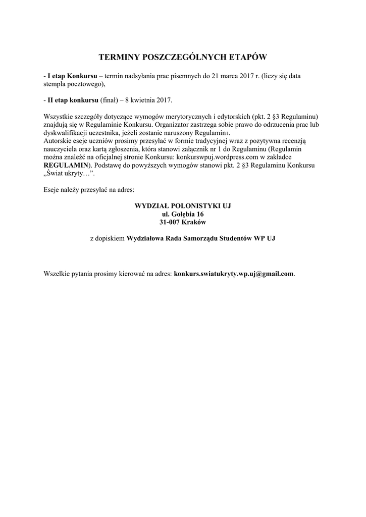 TERMINY POSZCZEGÓLNYCH ETAPÓW - I etap Konkursu – termin nadsyłania prac pisemnych do 21 marca 2017 r. (liczy się data stempla pocztowego), - II etap konkursu (finał) – 8 kwietnia 2017. Wszystkie szczegóły dotyczące wymogów merytorycznych i edytorskich (pkt. 2 §3 Regulaminu) znajdują się w Regulaminie Konkursu. Organizator zastrzega sobie prawo do odrzucenia prac lub dyskwalifikacji uczestnika, jeżeli zostanie naruszony Regulamin1. Autorskie eseje uczniów prosimy przesyłać w formie tradycyjnej wraz z pozytywna recenzją nauczyciela oraz kartą zgłoszenia, która stanowi załącznik nr 1 do Regulaminu (Regulamin można znaleźć na oficjalnej stronie Konkursu: konkurswpuj.wordpress.com w zakładce REGULAMIN). Podstawę do powyższych wymogów stanowi pkt. 2 §3 Regulaminu Konkursu „Świat ukryty…”. Eseje należy przesyłać na adres: WYDZIAŁ POLONISTYKI UJ ul. Gołębia 16 31-007 Kraków z dopiskiem Wydziałowa Rada Samorządu Studentów WP UJ Wszelkie pytania prosimy kierować na adres: [email protected].