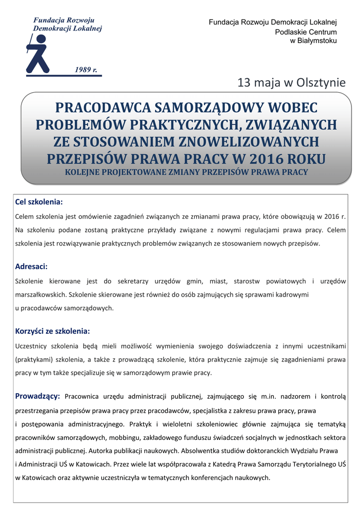 Fundacja Rozwoju Demokracji Lokalnej Podlaskie Centrum w Białymstoku 13 maja w Olsztynie PRACODAWCA SAMORZĄDOWY WOBEC PROBLEMÓW PRAKTYCZNYCH, ZWIĄZANYCH ZE STOSOWANIEM ZNOWELIZOWANYCH PRZEPISÓW PRAWA PRACY W 2016 ROKU KOLEJNE PROJEKTOWANE ZMIANY PRZEPISÓW PRAWA PRACY Cel szkolenia: Celem szkolenia jest omówienie zagadnień związanych ze zmianami prawa pracy, które obowiązują w 2016 r. Na szkoleniu podane zostaną praktyczne przykłady związane z nowymi regulacjami prawa pracy. Celem szkolenia jest rozwiązywanie praktycznych problemów związanych ze stosowaniem nowych przepisów. Adresaci: Szkolenie kierowane jest do sekretarzy urzędów gmin, miast, starostw powiatowych i urzędów marszałkowskich. Szkolenie skierowane jest również do osób zajmujących się sprawami kadrowymi u pracodawców samorządowych. Korzyści ze szkolenia: Uczestnicy szkolenia będą mieli możliwość wymienienia swojego doświadczenia z innymi uczestnikami (praktykami) szkolenia, a także z prowadzącą szkolenie, która praktycznie zajmuje się zagadnieniami prawa pracy w tym także specjalizuje się w samorządowym prawie pracy. Prowadzący: Pracownica urzędu administracji publicznej, zajmującego się m.in. nadzorem i kontrolą przestrzegania przepisów prawa pracy przez pracodawców, specjalistka z zakresu prawa pracy, prawa i postępowania administracyjnego. Praktyk i wieloletni szkoleniowiec głównie zajmująca się tematyką pracowników samorządowych, mobbingu, zakładowego funduszu świadczeń socjalnych w jednostkach sektora administracji publicznej. Autorka publikacji naukowych. Absolwentka studiów doktoranckich Wydziału Prawa i Administracji UŚ w Katowicach. Przez wiele lat współpracowała z Katedrą Prawa Samorządu Terytorialnego UŚ w Katowicach oraz aktywnie uczestniczyła w tematycznych konferencjach naukowych. PROGRAM SZKOLENIA: 1. Umowy na czas określony w administracji samorządowej: Ograniczenia czasowe i ilościowe w zawieraniu umów na czas określony i ich znaczenie dla pracodawcy samorządowego; Liczenie terminu 33 miesięcy dla umów trwających w dniu wejścia w życie nowych przepisów oraz do umów zawieranych po wejściu w życie nowych przepisów – praktyczne przykłady; Liczenie ilości zawartych umów – praktyczne przykłady; Umowa o pracę zawierana z osobą podejmującą po raz pierwszy pracę na stanowisku urzędniczym wobec ograniczenia czasowego i ilościowego w zawieraniu umów na czas określony; Długość okresu wypowiedzenia umowy o pracę osoby podejmującej po raz pierwszy pracę na stanowisku urzędniczym po zmianie ustawy o pracownikach samorządowych; Informacja o warunkach zatrudnienia osoby podejmującej po raz pierwszy pracę na stanowisku urzędniczym po zmianie ustawy o pracownikach samorządowych i Kodeksu pracy; Umowa o pracę zawierana z osobą podejmującą po raz pierwszy pracę na stanowisku urzędniczym po wyczerpaniu ograniczenia czasowego albo ilościowego umów zawartych na czas określony na stanowisku pomocniczym / obsługi; Umowy o pracę zawierane z doradcami i asystentami wobec ograniczenia czasowego i ilościowego w zawieraniu umów na czas określony; Umowy o pracę zawierane z pracownikami na stanowiskach pomocniczych i obsługi po zmianie przepisów; Umowy o pracę zawierane przez pracodawców samorządowych z bezrobotnymi w ramach prac interwencyjnych, robót publicznych wobec ograniczenia czasowego i ilościowego w zawieraniu umów na czas określony; Umowy o pracę zawierane przez pracodawców samorządowych, do których nie będą miały zastosowania ograniczenia czasowe i ilościowe w zawieraniu umów o pracę na czas określony – praktyczne przykłady; Obowiązki pracodawcy samorządowego związane z zawieraniem umów o pracę, do których nie będą miały zastosowania ograniczenia czasowe i ilościowe w zawieraniu umów na czas określony; Sankcja za niewskazanie w treści umowy o pracę okoliczności zawarcia umowy o pracę; Inne sankcje dla pracodawcy związane ze stosowaniem nowych przepisów; Zmiany dotyczące długości okresów wypowiedzenia umów zawieranych na czas określony – praktyczne przykłady – umowy trwające w dniu wejścia przepisów, umowy zawierane po zmianie przepisów; Obowiązki pracodawcy samorządowego wynikające ze zmiany przepisów dotyczących wypowiadania umów zawartych na czas określony; 2. Pracodawca samorządowy wobec zmian przepisów o uprawnieniach rodzicielskich: Definicja innego członka najbliższej rodziny, który będzie mógł skorzystać w określonych sytuacjach z uprawnień rodzicielskich; Wniosek o tzw. długi urlop – długi wniosek; Możliwość rezygnacji korzystania z urlopu macierzyńskiego / urlopu rodzicielskiego – wymogi formalne wniosków – obowiązek uwzględnienia przez pracodawcę wniosku pracownika?; Warunki skorzystania przez pracowników – innych członków najbliższej rodziny z uprawnień rodzicielskich określonych w przepisach; Wniosek o urlop rodzicielski – w całości, w części – możliwość rezygnacji w każdym czasie – ograniczenia czasowe związane z korzystaniem z tego uprawnienia; Czy pracodawca musi wyrazić zgodę na rezygnację z urlopu rodzicielskiego przez pracownika; Urlop rodzicielski udzielany po przerwie – maksymalny wymiar – praktyczne problemy; Łączenie korzystania z urlopu rodzicielskiego z wykonywaniem pracy u pracodawcy udzielającego urlopu – praktyczne problemy i przykłady; Czy pracodawca musi uwzględnić wniosek o korzystanie z urlopu rodzicielskiego z wykonywaniem pracy u pracodawcy udzielającego urlopu; Wymiar urlopu wypoczynkowego za okres łączenia korzystania z urlopu rodzicielskiego z wykonywaniem pracy u pracodawcy udzielającego urlopu; Urlop ojcowski – wymiar i możliwość podziału na części; Urlop wychowawczy – wybrane zagadnienia; Nowe zasady wykorzystywania opieki nad dzieckiem do lat 14. Opieka udzielana na dni lub na godziny, stosownie do wniosku pracownika 