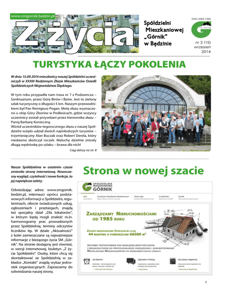 www.smgornik.bedzin.pl ISSN 2083-1390 nr 3 (15) wrzesień 2014 TURYSTYKA ŁĄCZY POKOLENIA W dniu 13.09.2014 mieszkańcy naszej Spółdzielni uczestniczyli w XXXIII Rodzinnym Złazie Mieszkańców Osiedli Spółdzielczych Województwa Śląskiego. W tym roku przypadła nam trasa nr 7 z Podzamcza – Sanktuarium, przez Górę Birów i Bzów. Jest to zielony szlak turystyczny o długości 5 km. Naszym przewodnikiem był Pan Remigiusz Pogan. Metę złazu wyznaczono u stóp Góry Zborów w Podlesicach, gdzie wszyscy uczestnicy zostali przywitani przez kierownika złazu – Panią Barbarę Konieczną. Wśród uczestników tegorocznego złazu z naszej Spółdzielni wzięło udział dwóch najmłodszych turystów – trzymiesięczny Alan Buczak oraz Robert Derela, który niedawno skończył roczek. Maluchy dzielnie zniosły długą wędrówkę po szlaku – brawa dla nich! Ciąg dalszy na str. 8 Nasza Spółdzielnia w ostatnim czasie zmieniła stronę internetową. Nowoczesny wygląd, czytelność i nowe funkcje, to jej największe zalety. Strona w nowej szacie Odwiedzając adres: www.smgornik. bedzin.pl, internauci oprócz podstawowych informacji o Spółdzielni, regulaminach, ofercie świadczonych usług, ogłoszeniach i przetargach, znajdą też specjalny dział „Dla lokatorów”, w którym będą mogli znaleźć m.in. harmonogramy prac prowadzonych przez Spółdzielnię, terminy odczytów liczników itp. W dziale „Aktualności” z kolei zamieszczane są najważniejsze informacje z bieżącego życia SM „Górnik”. Na stronie dostępny jest również, w wersji internetowej, biuletyn „Z życia Spółdzielni”. Osoby, które chcą się skontaktować ze Spółdzielnią w zakładce „Kontakt” znajdą wykaz jednostek organizacyjnych. Zapraszamy do odwiedzania naszej strony. 1 Nowy dodatek energetyczny Dane dla mieszkańców przez internet? Rozpoczynamy dyskusję Od 1 stycznia br. osoby, które otrzymują dodatek mieszkaniowy (tzw. odbiorcy wrażliwi) będą mogły starać się również o dodatek energetyczny. Aby usprawnić komunikację pomiędzy mieszkańcami a Spółdzielnią, coraz więcej spółdzielni decyduje się na wprowadzenie do swoich usług systemu udostępniania danych przez internet. Być może takie rozwiązanie zostanie zastosowane również w naszych zasobach. Wszystko zależeć będzie jednak od samych mieszkańców. Przyznanie dodatku mieszkaniowego reguluje ustawa z dnia 21 czerwca 2001 r. o dodatkach mieszkaniowych (Dz. U. Z 2013 r. poz. 966). Aby uzyskać dodatek energetyczny, trzeba być stroną umowy kompleksowej, czyli umowy zawartej pomiędzy dostawcą energii, a jej odbiorcą, w której zawarte zostały elementy dotyczące sprzedaży i dystrybucji energii lub umowy sprzedaży. Osoba starająca się o dodatek energetyczny musi również zamieszkiwać w miejscu, do którego, zgodnie z zawartą umową, będzie dostarczana energia elektryczna. Roczna wartość zryczałtowanego dodatku energetycznego wyniesie nie więcej niż 30% iloczynu limitu zużycia energii elektrycznej i średniej ceny energii dla odbiorcy. Cena będzie ogłaszana do 31 marca każdego roku przez Prezesa Urzędu Regulacji Energetyki. Limit zużycia energii elektrycznej wyniesie rocznie: 1) 900 kWh dla gospodarstwa domowego prowadzonego przez osobę samotną, 2) 1250 kWh dla gospodarstwa domowego składającego się z 2 do 4 osób, 3) 1500 kWh dla gospodarstwa domowego składającego się z 5 i więcej osób. Od 1 maja 2014 r. do 30 kwietnia 2015 r. wartość zryczałtowanego dodatku energetycznego wynosi 11,36 zł dla gospodarstw prowadzonych przez osoby samotne, 15,77 zł dla gospodarstw zamieszkałych przez 2-4 osoby, oraz 18,93 zł dla gospodarstw 5- i więcej osobowych. Najważniejszą korzyścią dla mieszkańców, wynikającą z wprowadzenia elektronicznego systemu obsługi danych, jest możliwość uzyskania informacji o dowolnej porze i z dowolnego miejsca, bez potrzeby przychodzenia do siedziby spółdzielni. Chcielibyśmy poznać opinie mieszkańców, co sądzą o tego rodzaju inicjatywie. Pracownicy Spółdzielni przygotują dla Państwa specjalne ankiety, za pomocą których będą mogli Państwo wyrazić swoją opinię. Po opracowaniu zebranych informacji, zarząd podejmie stosowną decyzję, zgodną z wolą większości mieszkańców. Zanim jednak oddamy Państwu głos, przedstawiamy poniżej najważniejsze informacje o systemie S_net, który umożliwia lokatorom wgląd do najważniejszych informacji związanych z działalnością Spółdzielni. Dostęp do S_net mają tylko osoby, które wyrażą taką chęć. Otrzymają wówczas od administratora unikatowy identyfikator i hasło, które może być w każdej chwili zmienione przez użytkownika. Lokator ma dostęp tylko do swoich danych, bez możliwości zmian zapisów księgowych. Połączenie z serwerem odbywa się z wykorzystaniem szyfrowania danych. Wystarczy, że mieszkańcy wpiszą w przeglądarce adres serwera, podadzą swój identyfikator i hasło, a otrzymają dostęp do informacji. System pozwala udostępniać takie dane jak: stany kont (zaksięgowane dokumenty z opisem, saldo), aktualne wysokości opłat eksploatacyjnych. Odczyty Informujemy, że kolejne odczyty wodomierzy w zasobach SM „Górnik” zaplanowano na 1-2 października. Szczegóły zamieścimy na tablicach ogłoszeniowych. Prosimy mieszkańców, by w podanych terminach udostępnili swoje mieszkania pracownikom Spółdzielni. 2 Taryfa dla ciepła Informujemy, że decyzją Prezesa Urzędu Regulacji Energetyki została zatwierdzona nowa taryfa dla ciepła, Tauron Wytwarzanie S.A. – Elektrownia Łagisza, która wytwarza ciepło dla osiedla w Dąbrowie Górniczej i 15 Grudnia w Będzinie. Nowa taryfa obowiązuje od 1.09.2014 r. Po przeliczeniu kosztów energii cieplnej wg nowej taryfy, koszty energii wzrosną w stosunku do poprzedniego okresu o 1.62%. Nowe stawki za gaz Informujemy, że od 1 sierpnia 2014 r. zmienione zostały zasady rozliczania zużyci