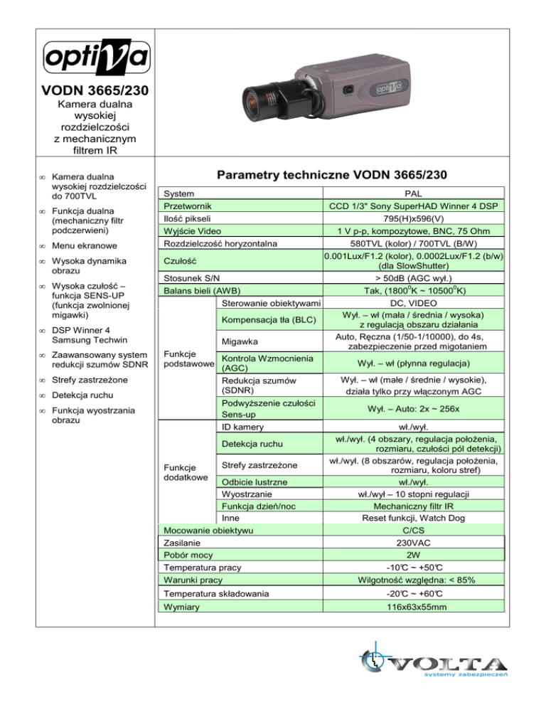 VODN 3665/230 Kamera dualna wysokiej rozdzielczości z mechanicznym filtrem IR • Kamera dualna wysokiej rozdzielczości do 700TVL • Funkcja dualna (mechaniczny filtr podczerwieni) • Menu ekranowe • Wysoka dynamika obrazu • Wysoka czułość – funkcja SENS-UP (funkcja zwolnionej migawki) • DSP Winner 4 Samsung Techwin • Zaawansowany system redukcji szumów SDNR • Strefy zastrzeŜone • Detekcja ruchu • Funkcja wyostrzania obrazu Parametry techniczne VODN 3665/230 System Przetwornik Ilość pikseli Wyjście Video Rozdzielczość horyzontalna PAL CCD 1/3" Sony SuperHAD Winner 4 DSP 795(H)x596(V) 1 V p-p, kompozytowe, BNC, 75 Ohm 580TVL (kolor) / 700TVL (B/W) 0.001Lux/F1.2 (kolor), 0.0002Lux/F1.2 (b/w) Czułość (dla SlowShutter) Stosunek S/N > 50dB (AGC wył.) 0 0 Balans bieli (AWB) Tak, (1800 K ~ 10500 K) Sterowanie obiektywami DC, VIDEO Wył. – wł (mała / średnia / wysoka) Kompensacja tła (BLC) z regulacją obszaru działania Auto, Ręczna (1/50-1/10000), do 4s, Migawka zabezpieczenie przed migotaniem Funkcje Kontrola Wzmocnienia Wył. – wł (płynna regulacja) podstawowe (AGC) Wył. – wł (małe / średnie / wysokie), Redukcja szumów (SDNR) działa tylko przy włączonym AGC PodwyŜszenie czułości Wył. – Auto: 2x ~ 256x Sens-up ID kamery wł./wył. wł./wył. (4 obszary, regulacja połoŜenia, Detekcja ruchu rozmiaru, czułości pól detekcji) wł./wył. (8 obszarów, regulacja połoŜenia, Strefy zastrzeŜone Funkcje rozmiaru, koloru stref) dodatkowe Odbicie lustrzne wł./wył. Wyostrzanie wł./wył – 10 stopni regulacji Funkcja dzień/noc Mechaniczny filtr IR Inne Reset funkcji, Watch Dog Mocowanie obiektywu C/CS Zasilanie 230VAC Pobór mocy 2W Temperatura pracy -10°C ~ +50°C Warunki pracy Wilgotność względna: < 85% Temperatura składowania -20°C ~ +60°C Wymiary 116x63x55mm