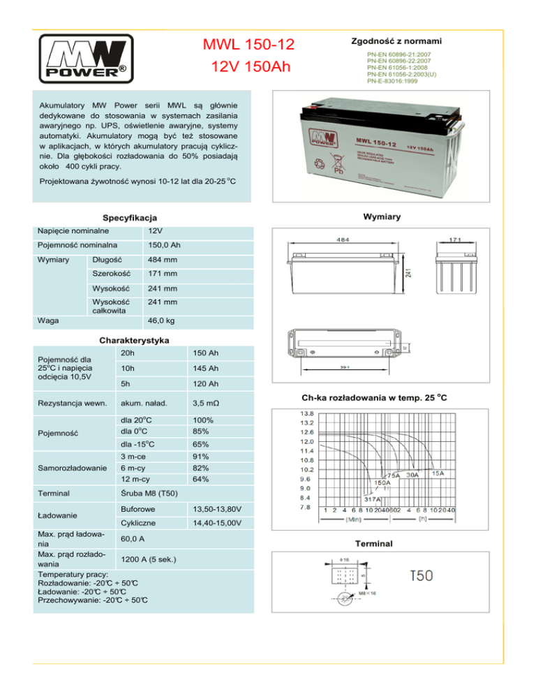 MWL 150-12 12V 150Ah Zgodność z normami PN-EN 60896-21:2007 PN-EN 60896-22:2007 PN-EN 61056-1:2008 PN-EN 61056-2:2003(U) PN-E-83016:1999 Akumulatory MW Power serii MWL są głównie dedykowane do stosowania w systemach zasilania awaryjnego np. UPS, oświetlenie awaryjne, systemy automatyki. Akumulatory mogą być też stosowane w aplikacjach, w których akumulatory pracują cyklicznie. Dla głębokości rozładowania do 50% posiadają około 400 cykli pracy. Projektowana żywotność wynosi 10-12 lat dla 20-25 oC Wymiary Specyfikacja Napięcie nominalne 12V Pojemność nominalna 150,0 Ah Wymiary Długość 484 mm Szerokość 171 mm Wysokość 241 mm Wysokość całkowita 241 mm Waga 46,0 kg Charakterystyka 20h 150 Ah 10h 145 Ah 5h 120 Ah Rezystancja wewn. akum. naład. 3,5 mΩ Pojemność dla 20oC dla 0oC 100% 85% dla -15oC 65% 3 m-ce 91% 6 m-cy 82% 12 m-cy 64% Pojemność dla 25oC i napięcia odcięcia 10,5V Samorozładowanie Terminal Ładowanie Ch-ka rozładowania w temp. 25 oC Śruba M8 (T50) Buforowe Cykliczne Max. prąd ładowa60,0 A nia Max. prąd rozłado1200 A (5 sek.) wania Temperatury pracy: Rozładowanie: -20°C ÷ 50°C Ładowanie: -20°C ÷ 50°C Przechowywanie: -20°C ÷ 50°C 13,50-13,80V 14,40-15,00V Terminal